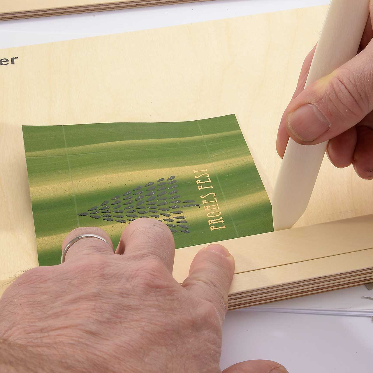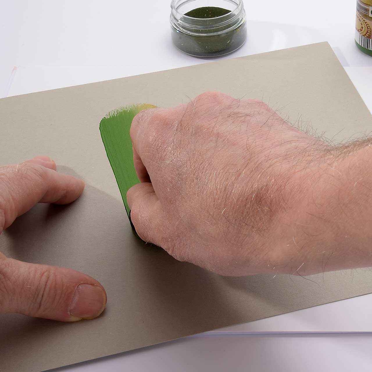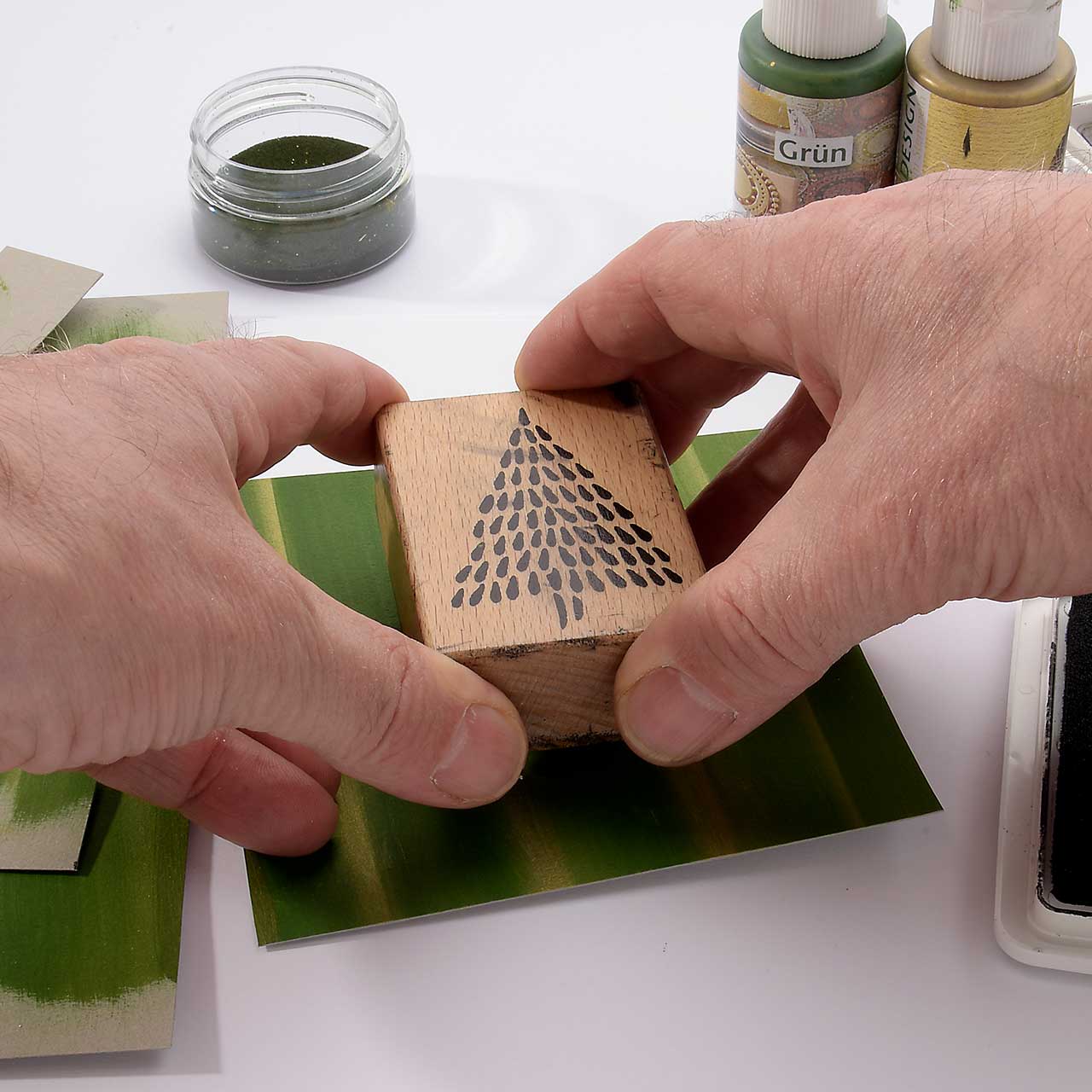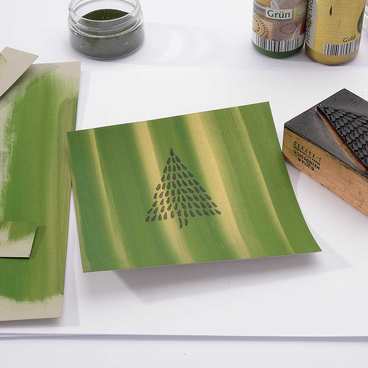 Nehmen Sie mit dem Farbtupfer Schwämmchen goldene und grüne Acrylfarbe auf. Ziehen Sie mit dem Schwämmchen mehrere gold-grüne Streifen über Ihren Amadeo Kartenkarton (Sie benötigen für eine 7 x 7 cm Schachtel, eine Fläche von etwa 12 x 12 cm).