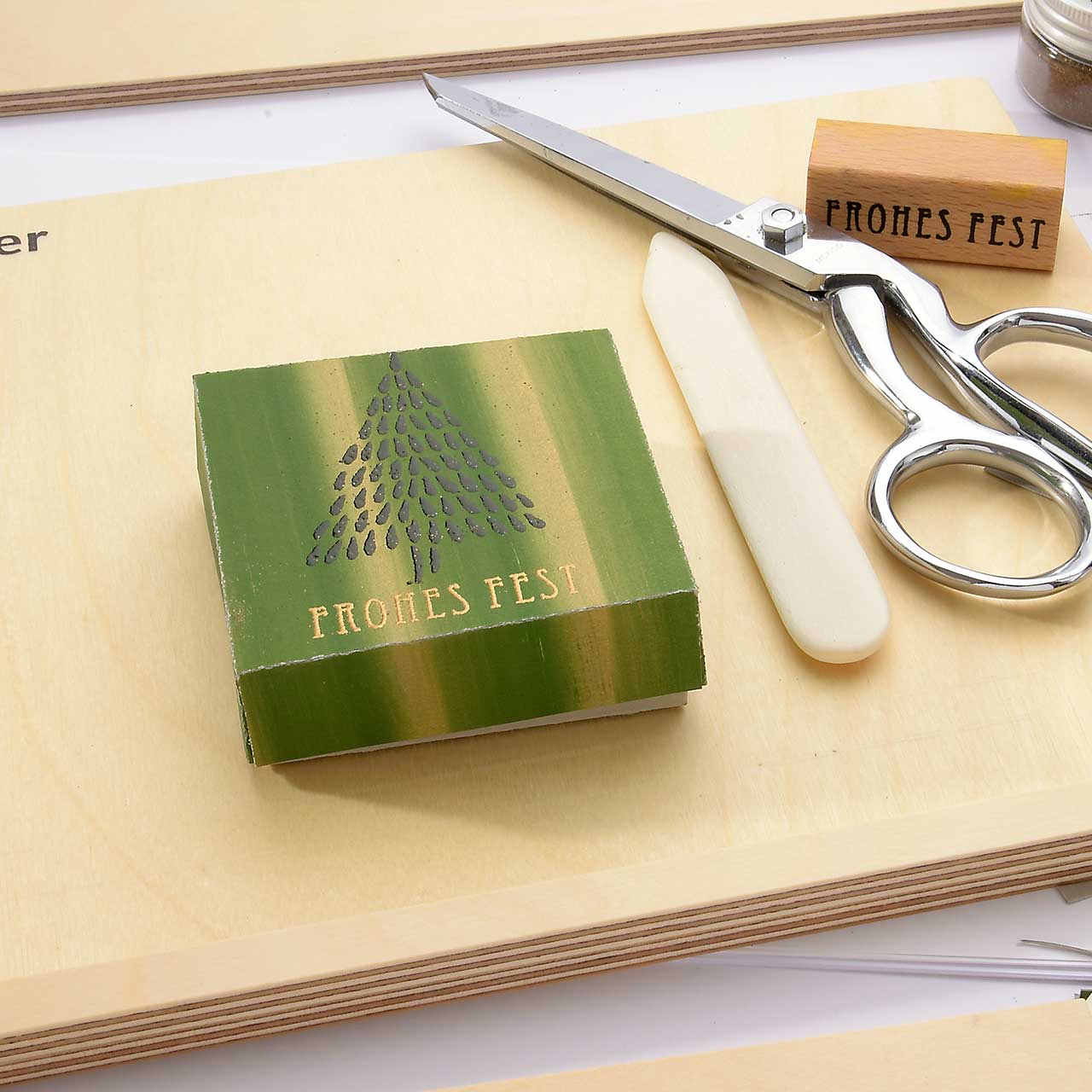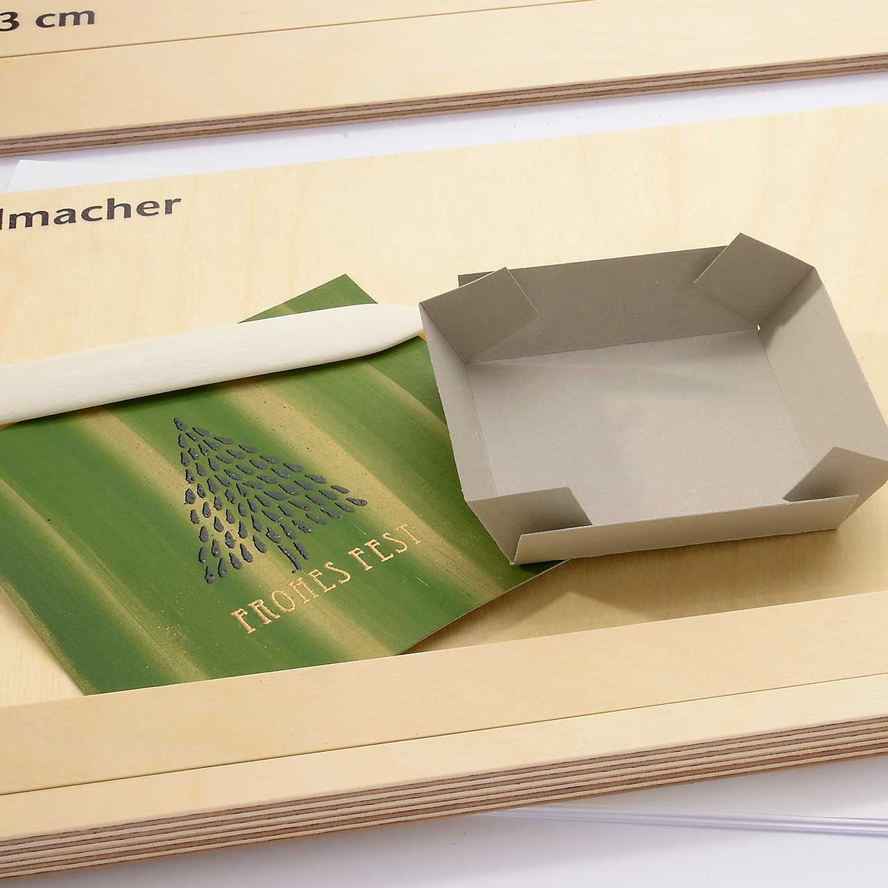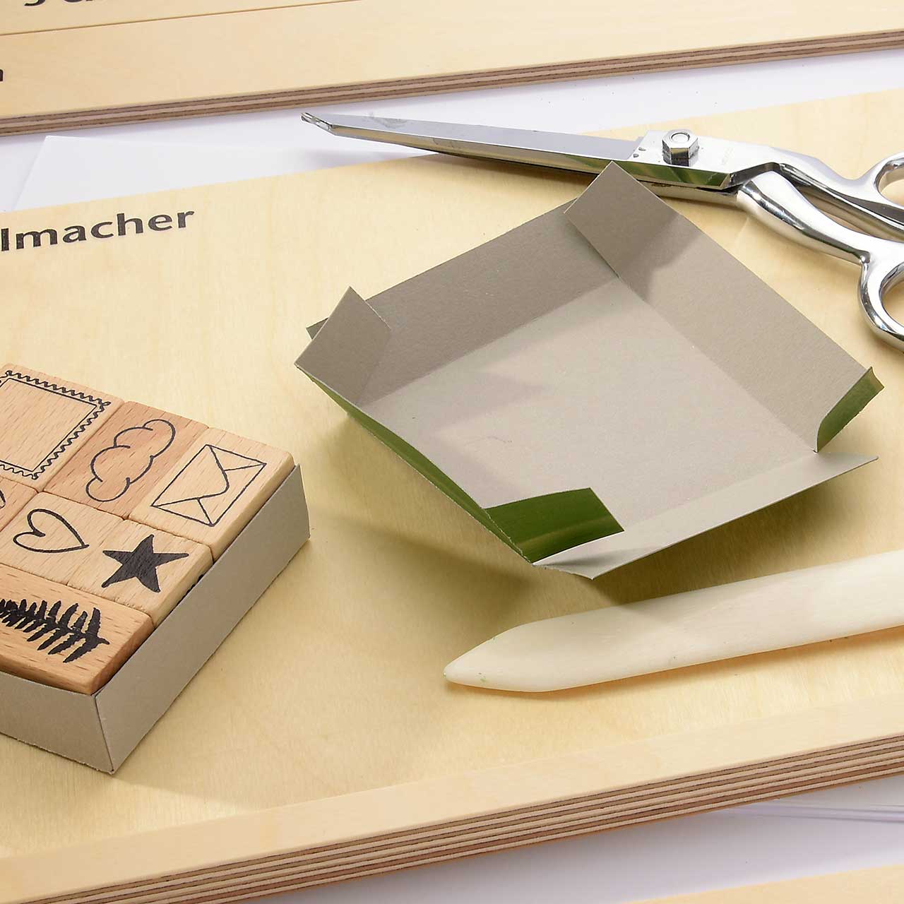 Für den Boden der Schachtel schneiden Sie ein Quadrat von 11,5 11,5 cm Größe. Fertigen Sie mit Hilfe des Schachtelmachers eine Schachtel mit 2 cm Höhe. Ziehen Sie mit dem Falzbein entlang der 4 Kanten eine Nut, falten Sie die Kanten um, schneiden Sie die Laschen ein und verkleben Sie die Schachtel.