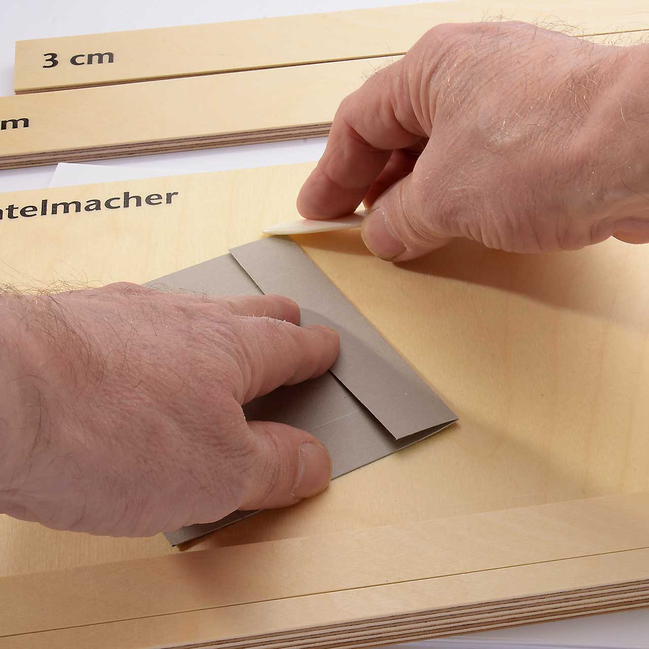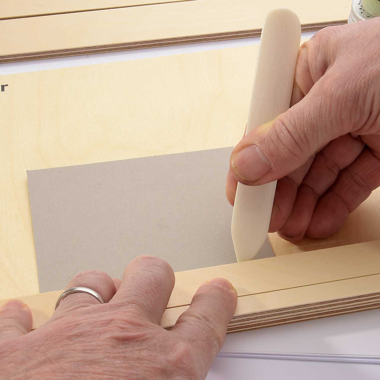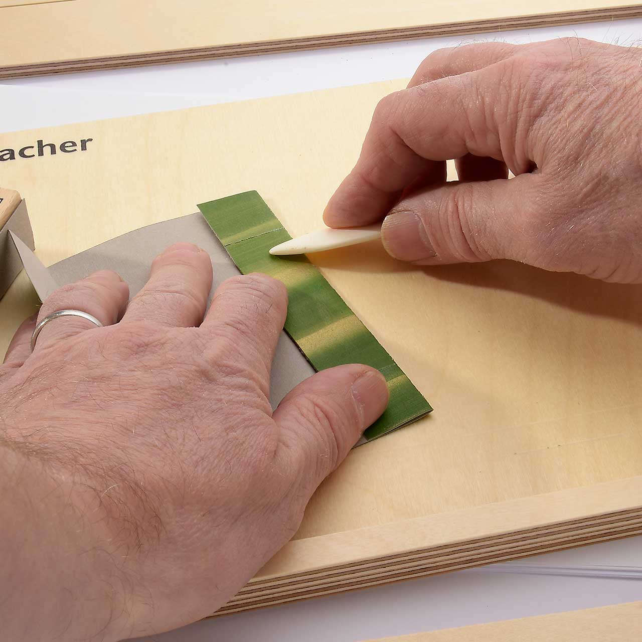 Für den Boden der Schachtel schneiden Sie ein Quadrat von 11,5 11,5 cm Größe. Fertigen Sie mit Hilfe des Schachtelmachers eine Schachtel mit 2 cm Höhe. Ziehen Sie mit dem Falzbein entlang der 4 Kanten eine Nut, falten Sie die Kanten um, schneiden Sie die Laschen ein und verkleben Sie die Schachtel.