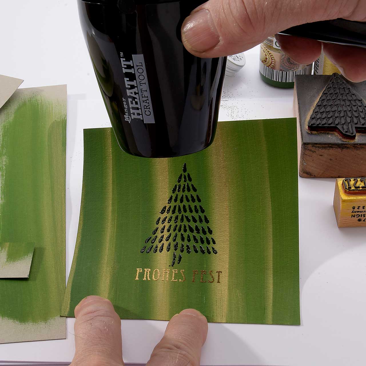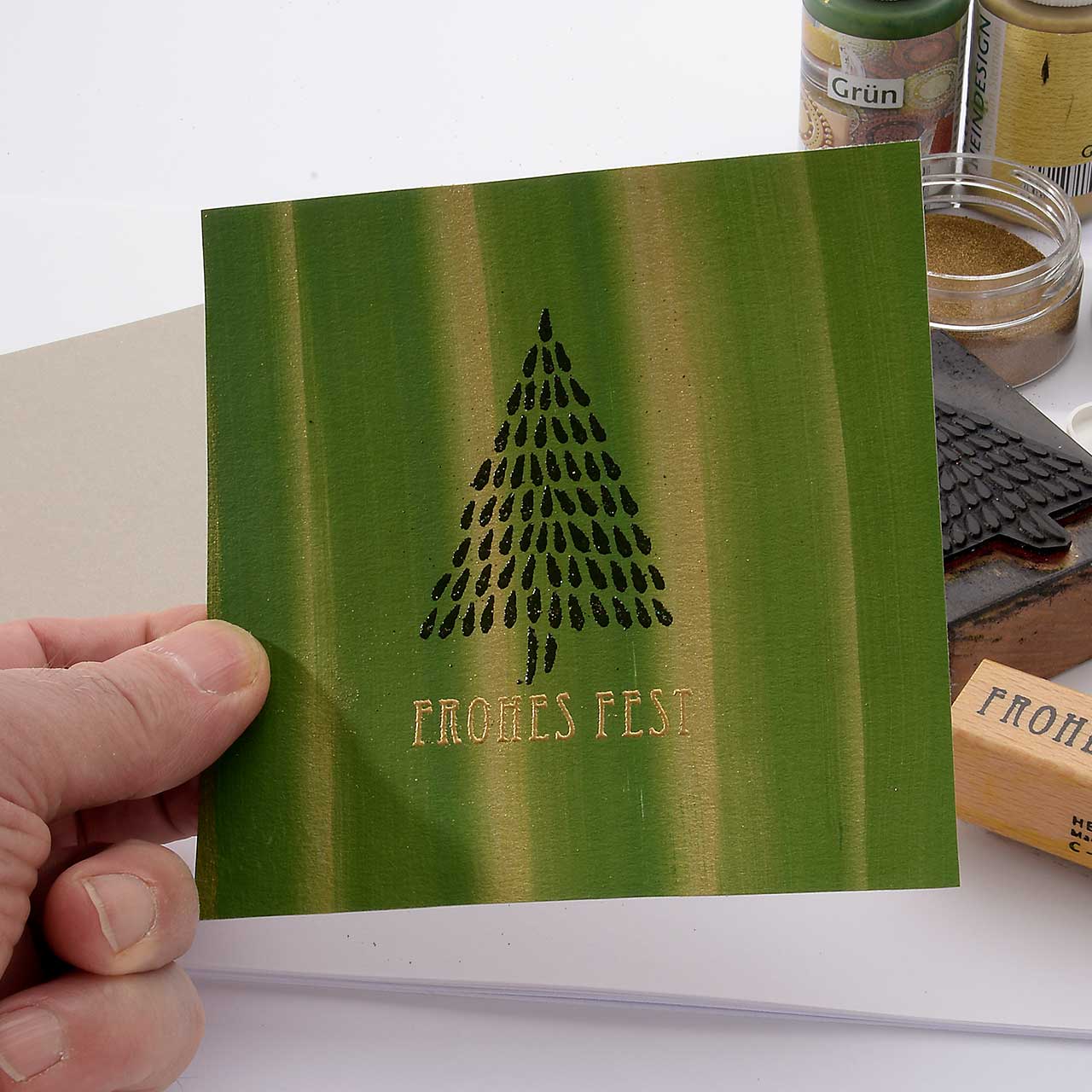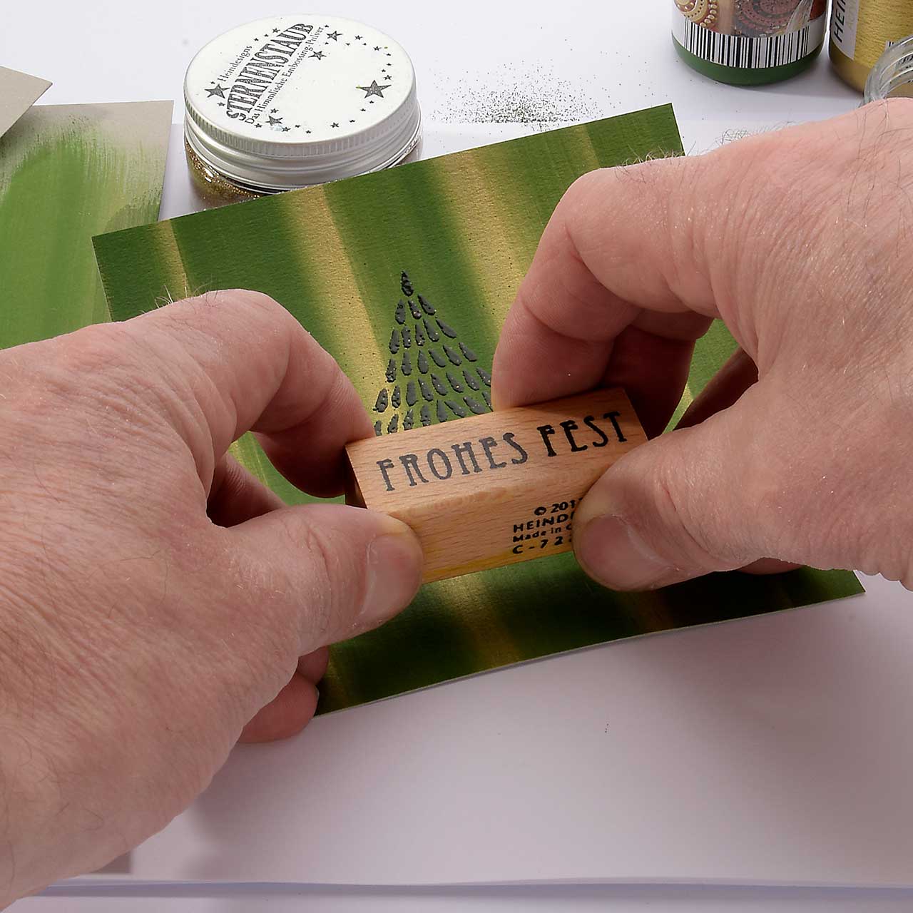 Stempeln und embossen Sie das Weihnachtsbaum Motiv mit dem Sternenstaub dunkles Moosgrün in die obere Mitte Ihres gestreiften Kartons (unter dem Baum soll etwas Platz für das Frohes Fest bleiben).Stempeln und embossen Sie das „Frohes Fest“ Textmotiv mit dem goldenen Sternenstaub unter das Weihnachtsbaum Motiv.
