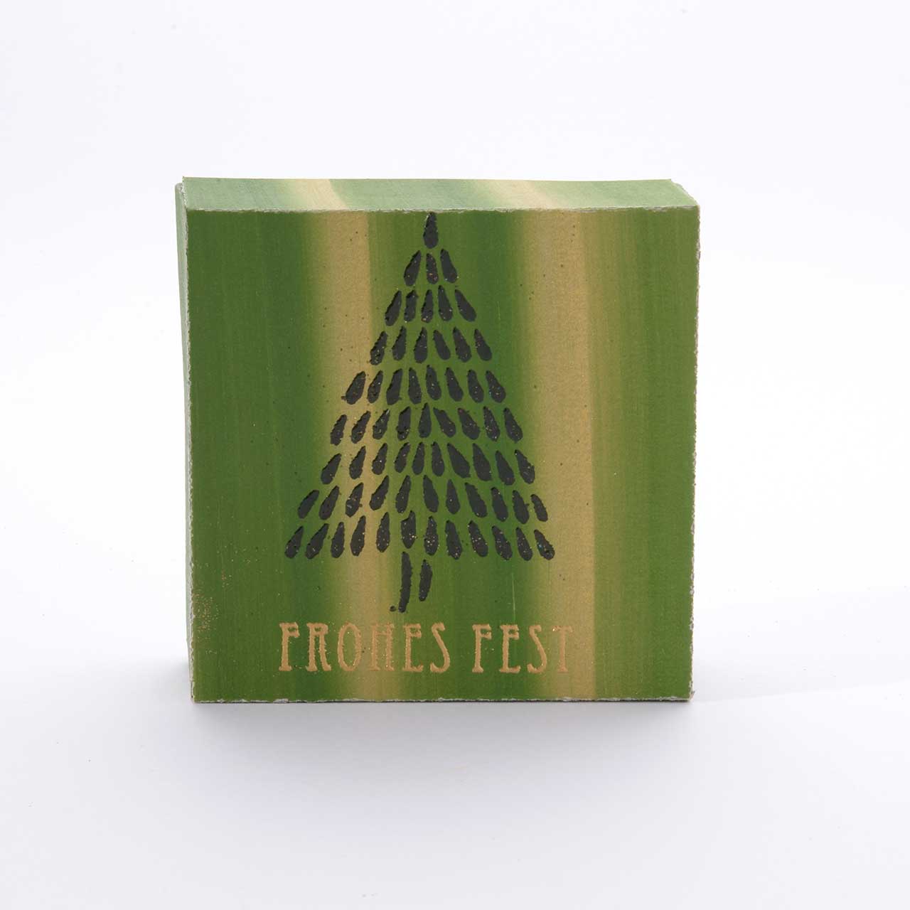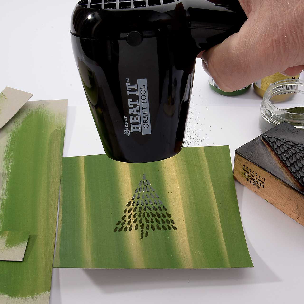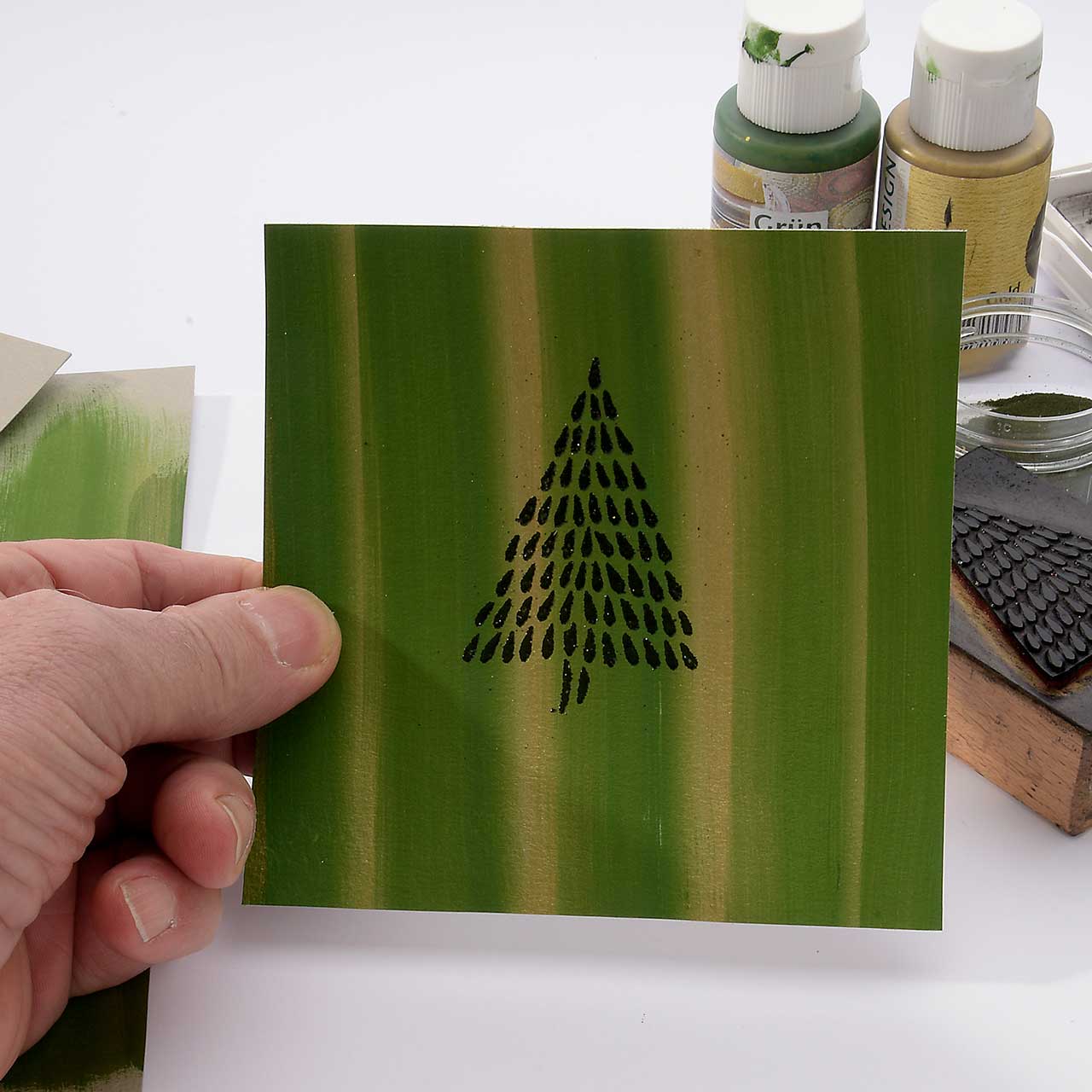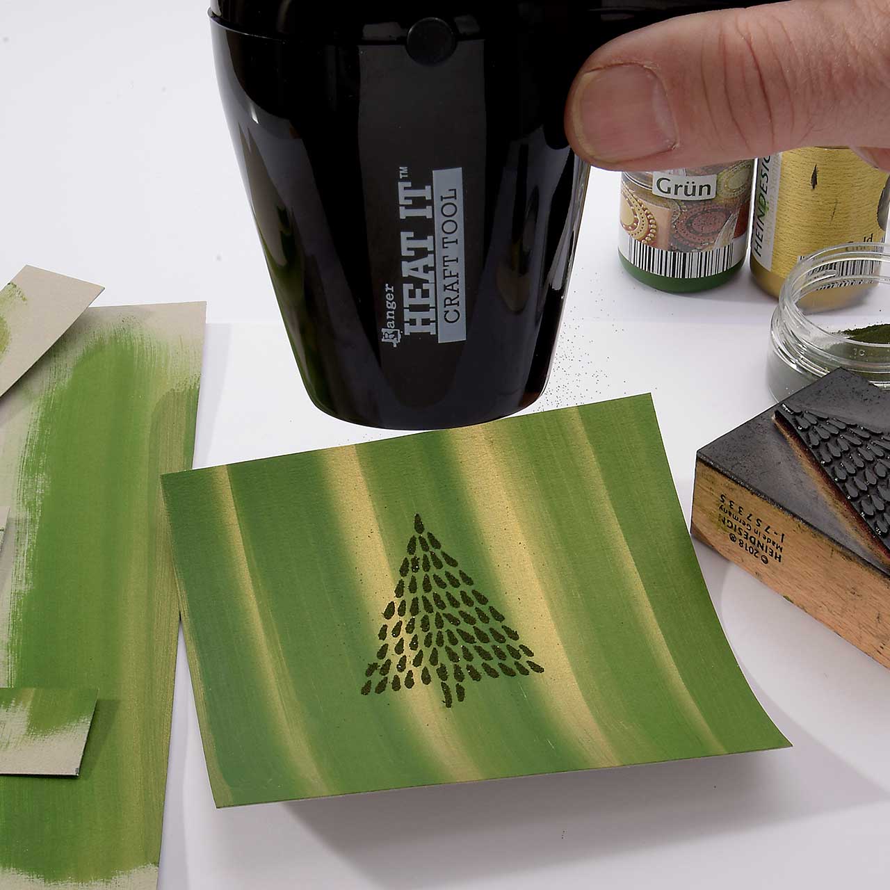 Stempeln und embossen Sie das Weihnachtsbaum Motiv mit dem Sternenstaub dunkles Moosgrün in die obere Mitte Ihres gestreiften Kartons (unter dem Baum soll etwas Platz für das Frohes Fest bleiben).Stempeln und embossen Sie das „Frohes Fest“ Textmotiv mit dem goldenen Sternenstaub unter das Weihnachtsbaum Motiv.