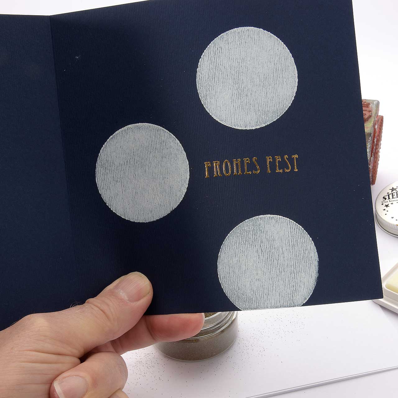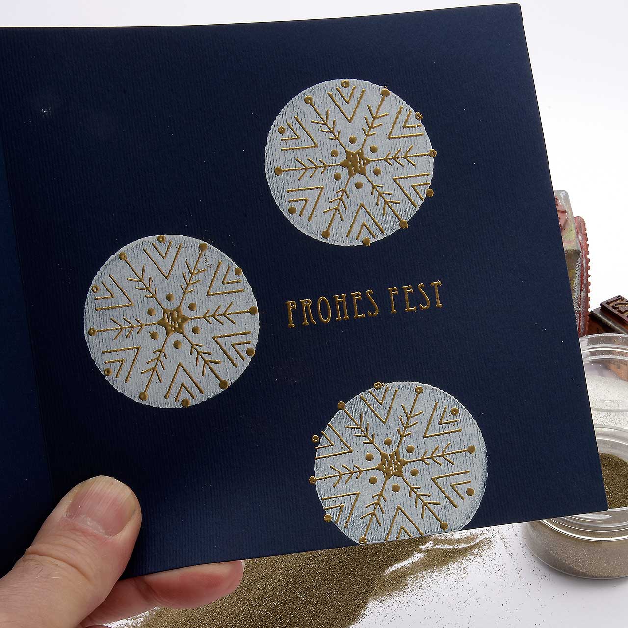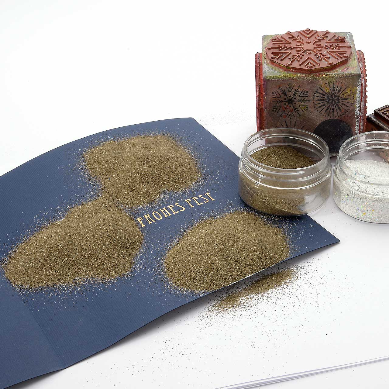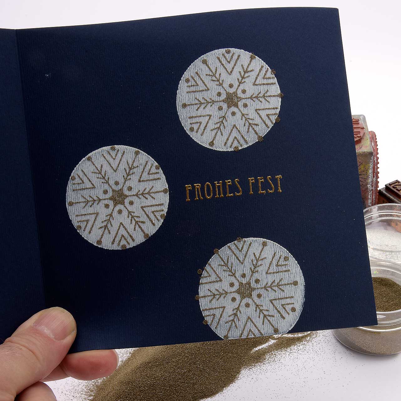 Stempeln und embossen Sie das „Frohes Fest“-Textmotiv mit dem goldenen Sternenstaub auf Ihre Karte.