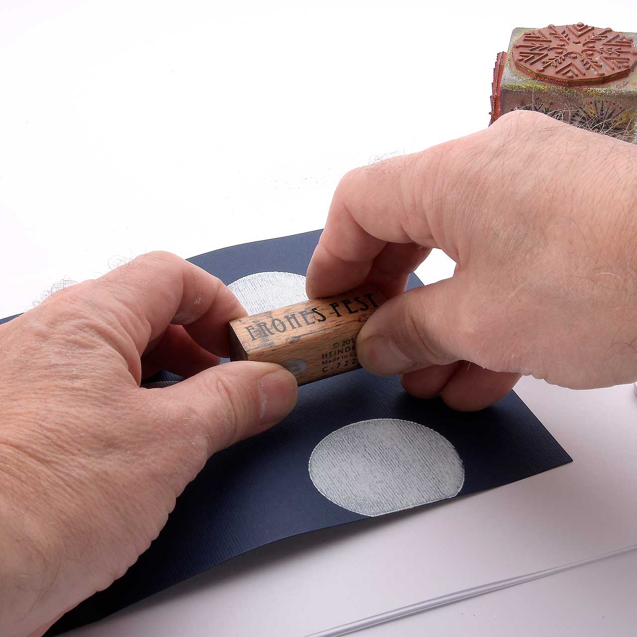 Nehmen Sie mit einem Farbtupfer Schwämmchen weiße Acrylfarbe auf und färben Sie den Kreis-Flächenstempel ein. Stempeln Sie das Motiv drei mal auf Ihre Karte. Für ein gleichmäßiges Druckbild färben Sie den Stempel vor jedem Abdruck erneut ein.