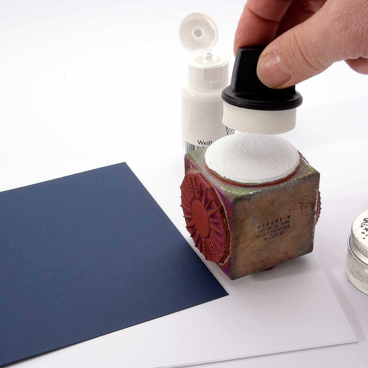 Reinigen Sie den Stempel und das Schwämmchen mit reichlich Wasser.