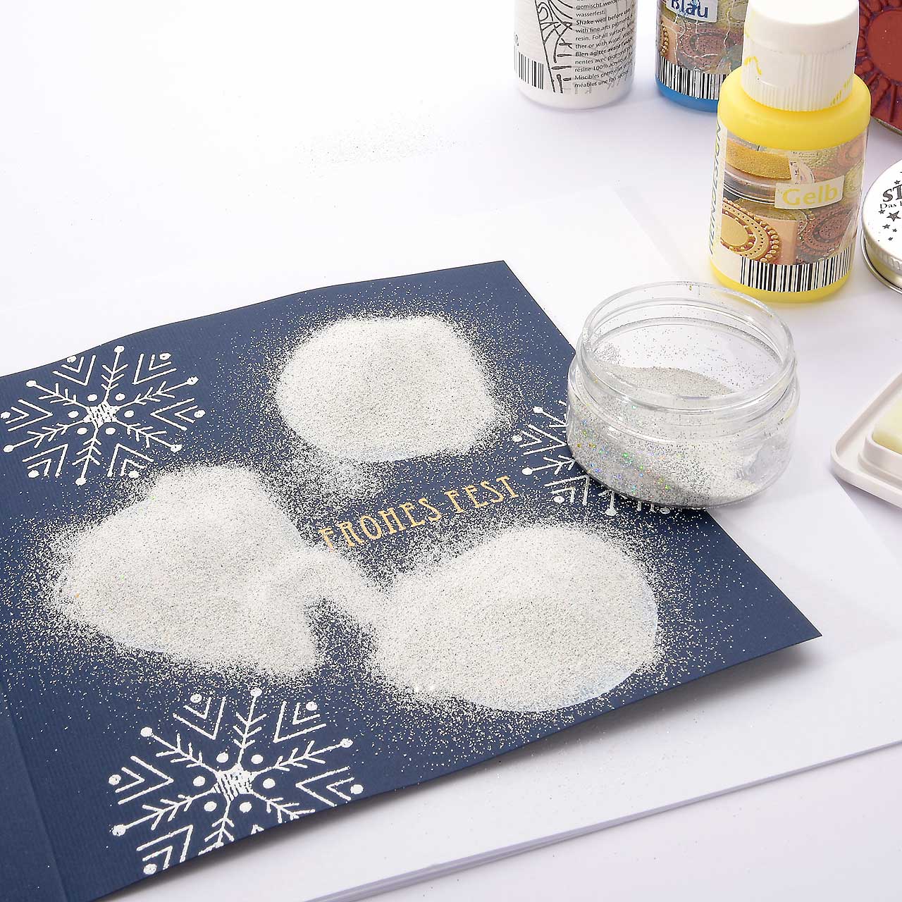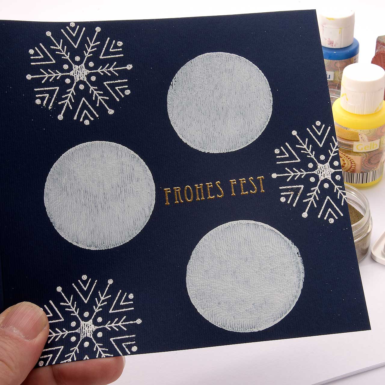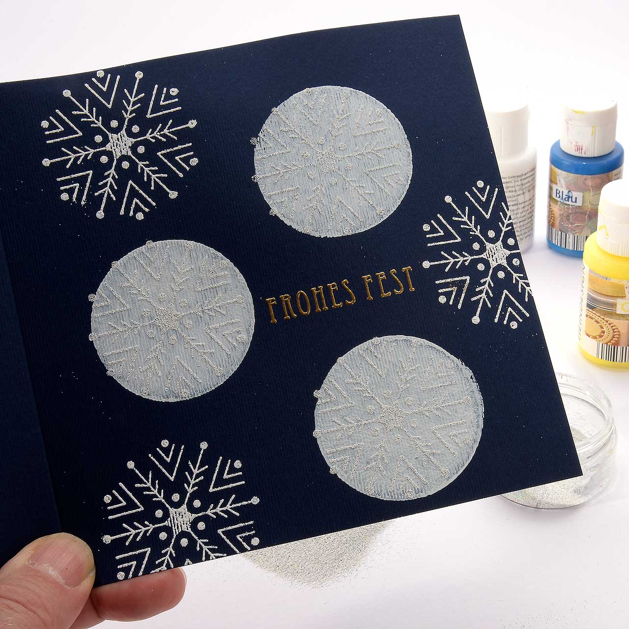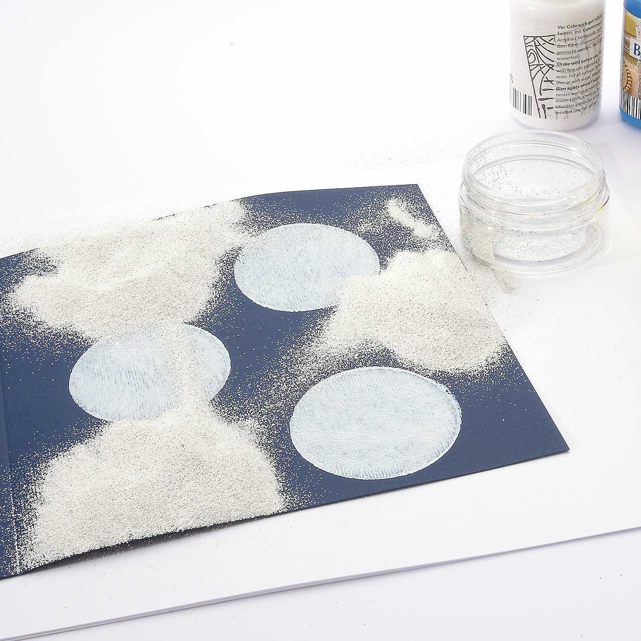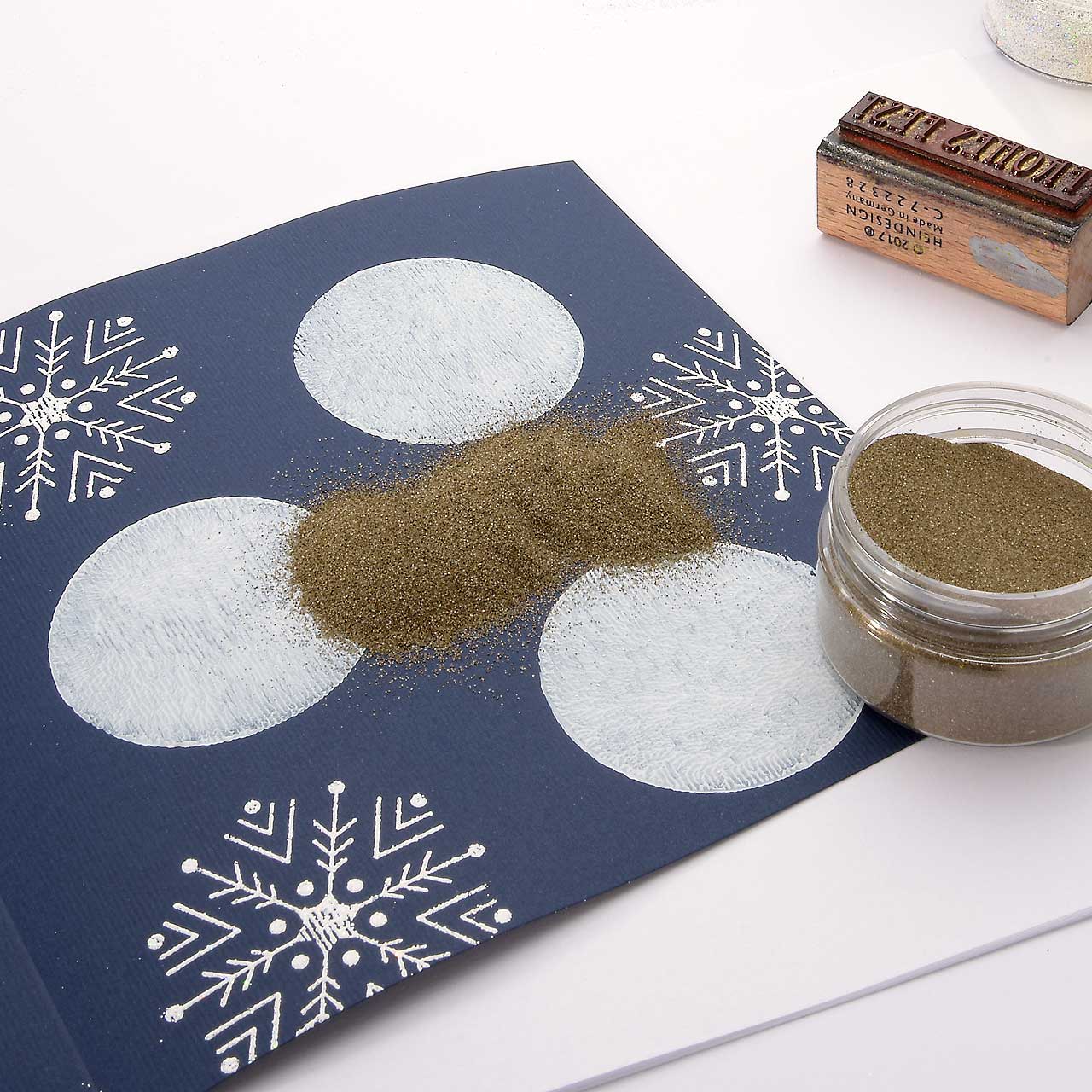 Stempeln und embossen Sie das Schneeflocken Motiv mit dem Sternenstaub weiße Diamanten drei mal verteilt jeweils auf einen weißen Kreis.
