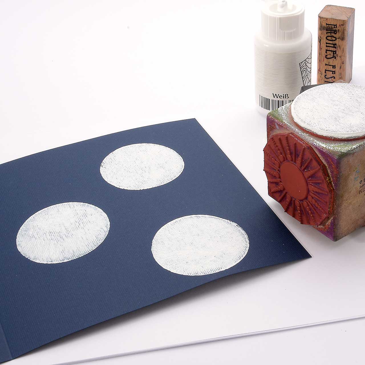 Nehmen Sie mit einem Farbtupfer Schwämmchen weiße Acrylfarbe auf und färben Sie den Kreis-Flächenstempel ein. Stempeln Sie das Motiv drei mal auf Ihre Karte. Für ein gleichmäßiges Druckbild färben Sie den Stempel vor jedem Abdruck erneut ein.
