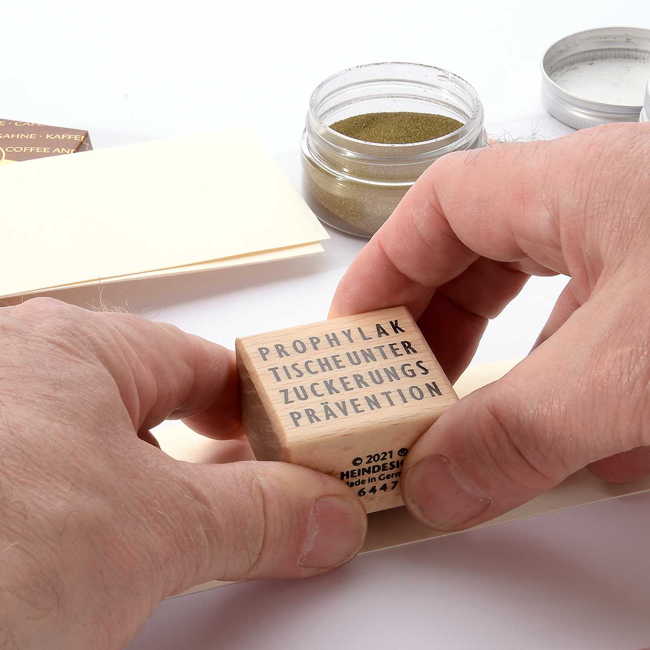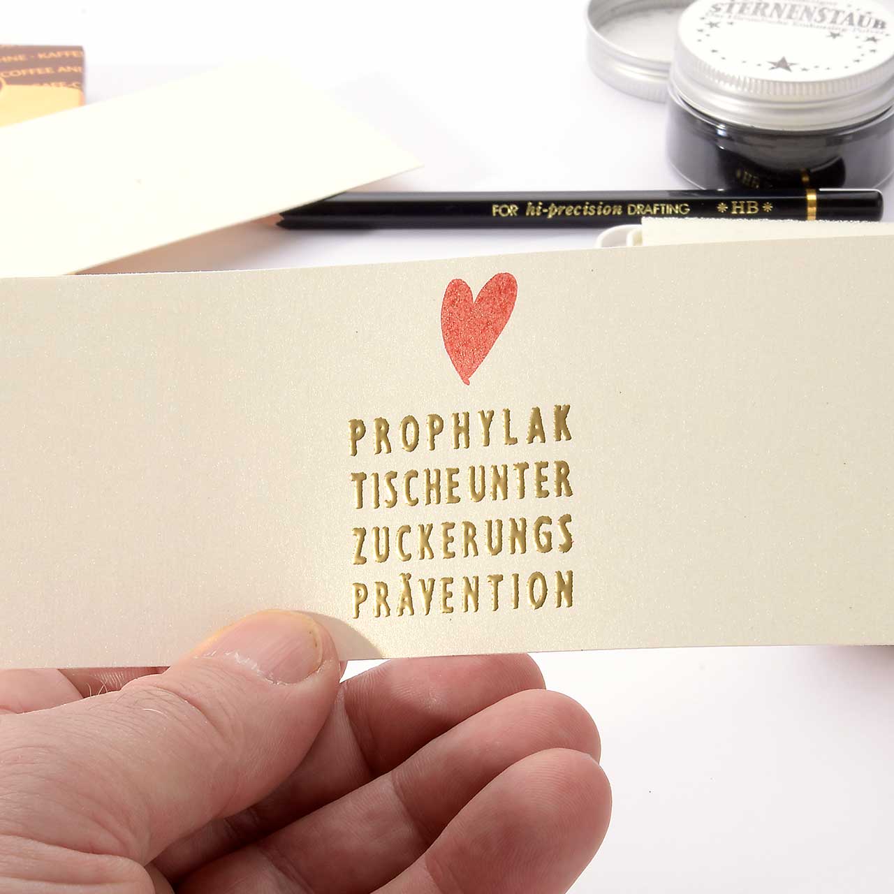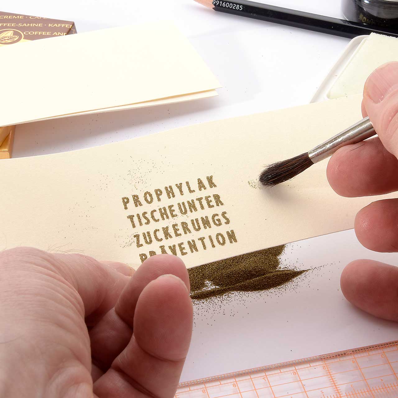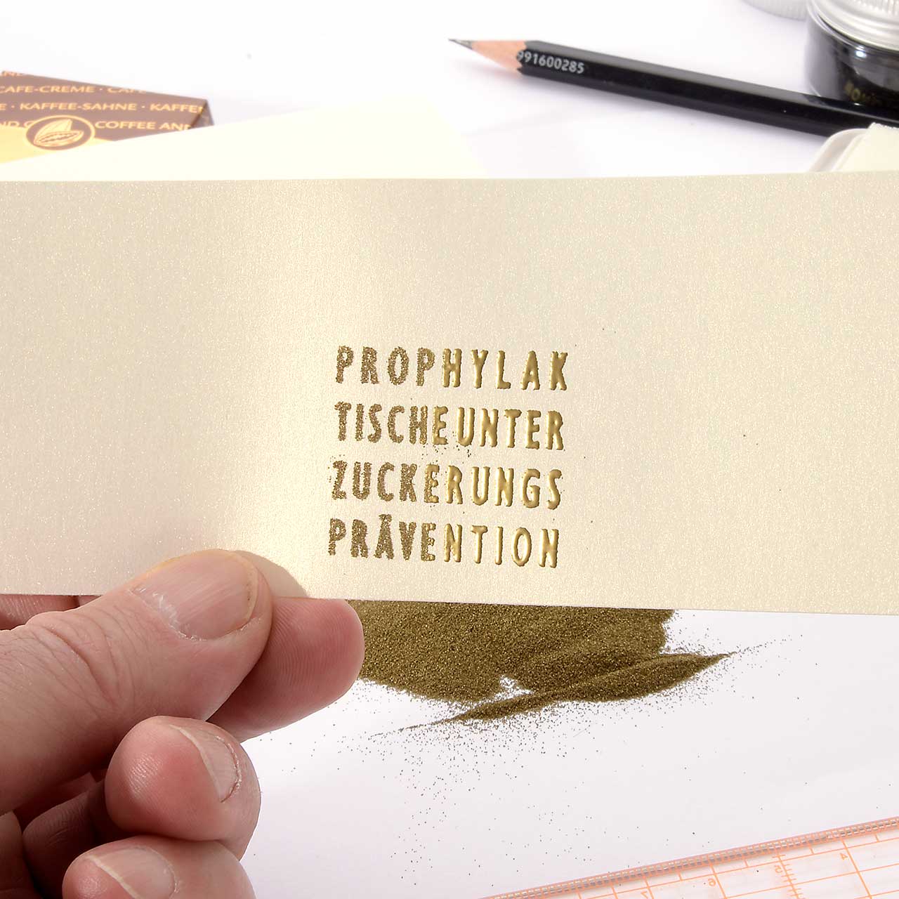 Stempeln und embossen Sie das „Prophylak....“-Textmotiv mit dem goldenen Sternenstaub auf das Stück Amadeo Papier.