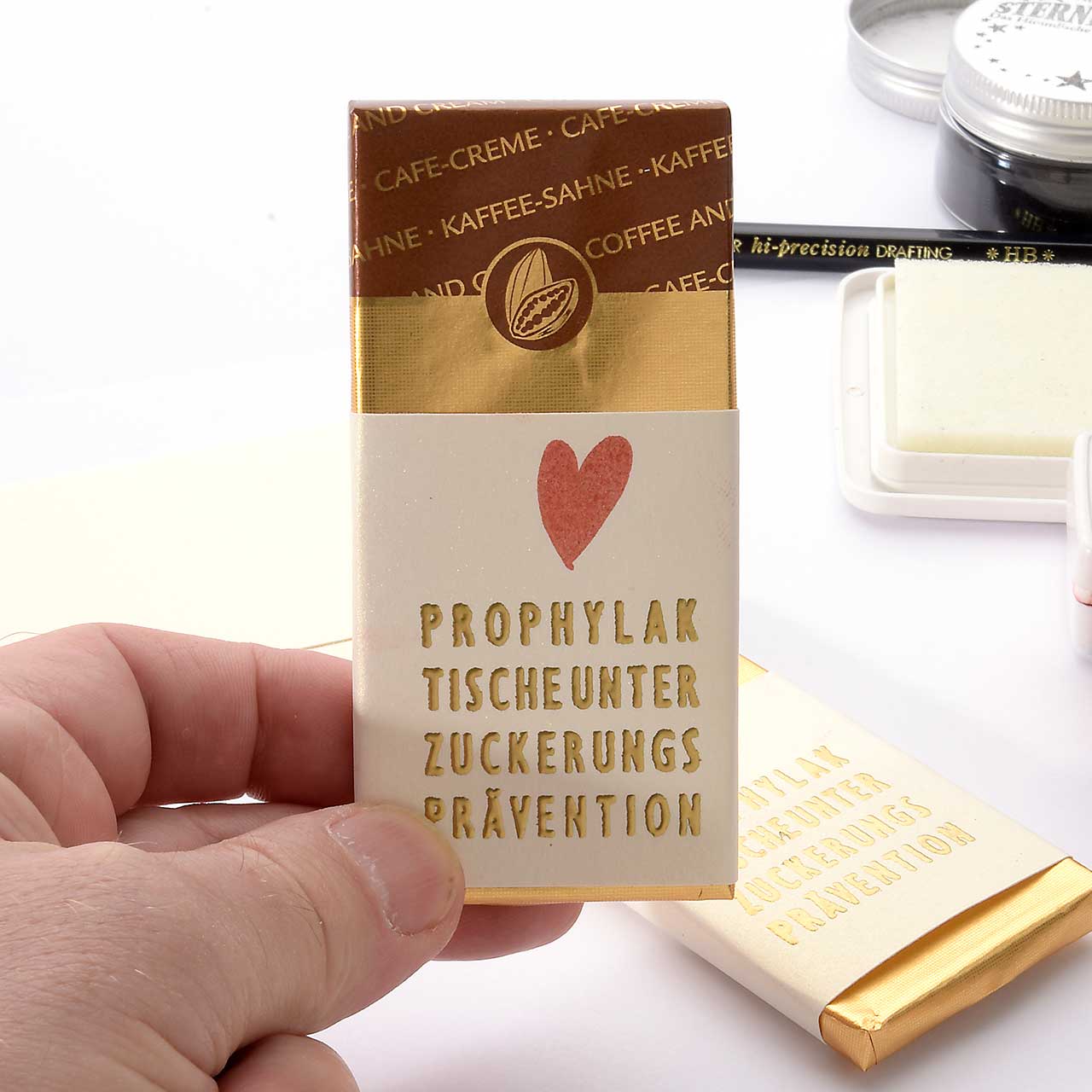 Schneiden Sie das Papier passen zu Ihrer Schokolade. Das embosste und gestempelte Motiv soll in der Mitte mit viel Platz links und rechts sein.