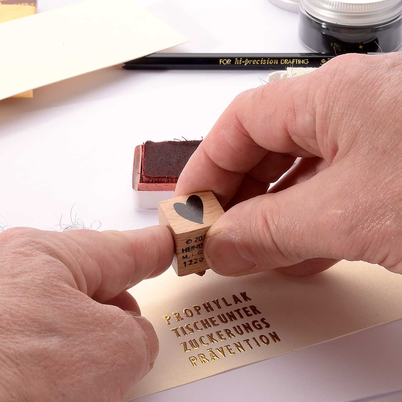 Stempeln Sie das Herz-Motiv mit dem roten Stempelkissen mittig oberhalb des Textmotives.