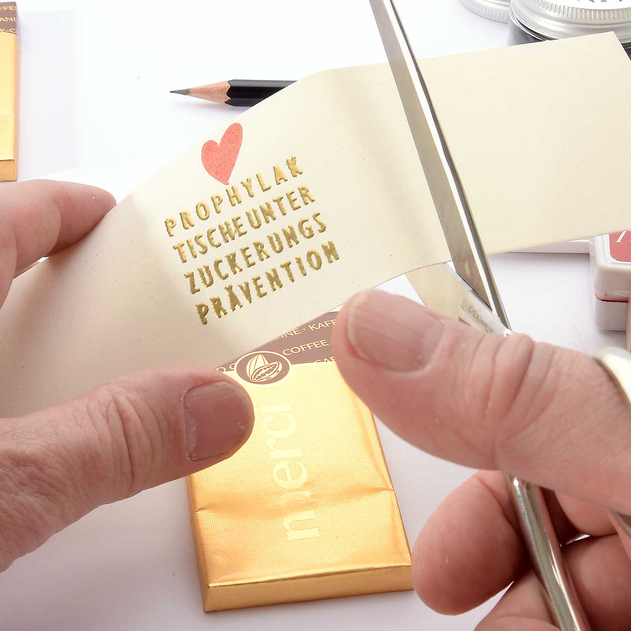 Schneiden Sie sich ein Stück Amadeo Papier Perlgold für Ihre Schokolade etwas zu groß zu.