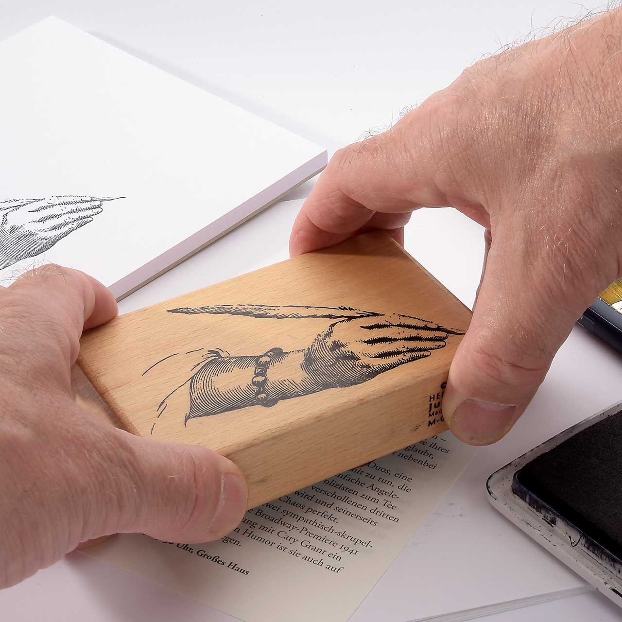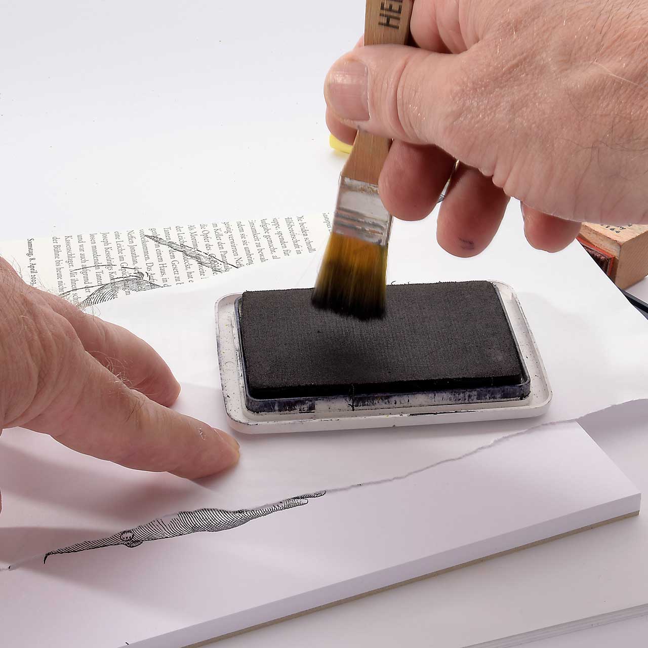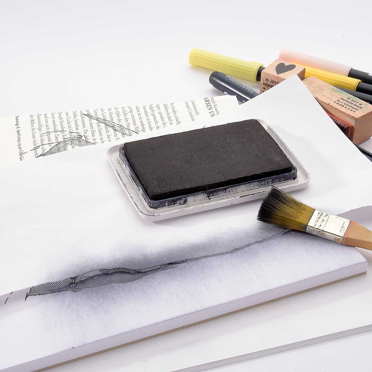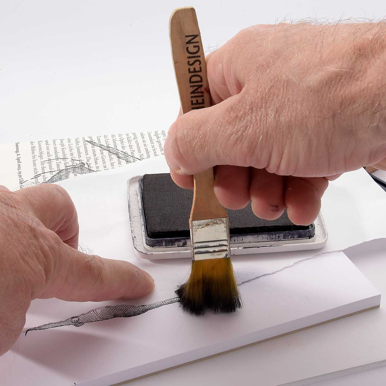 Stempeln Sie das Schreibende Hand Motiv mit dem schwarzen Stempelkissen einmal schön sauber unten links auf Ihre Karte und ein weiteres mal auf eine mit Text bedruckte Buchseite.