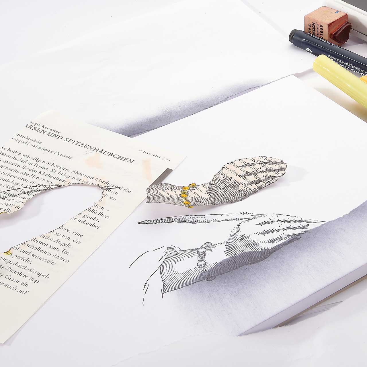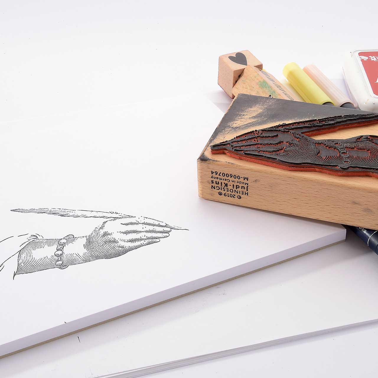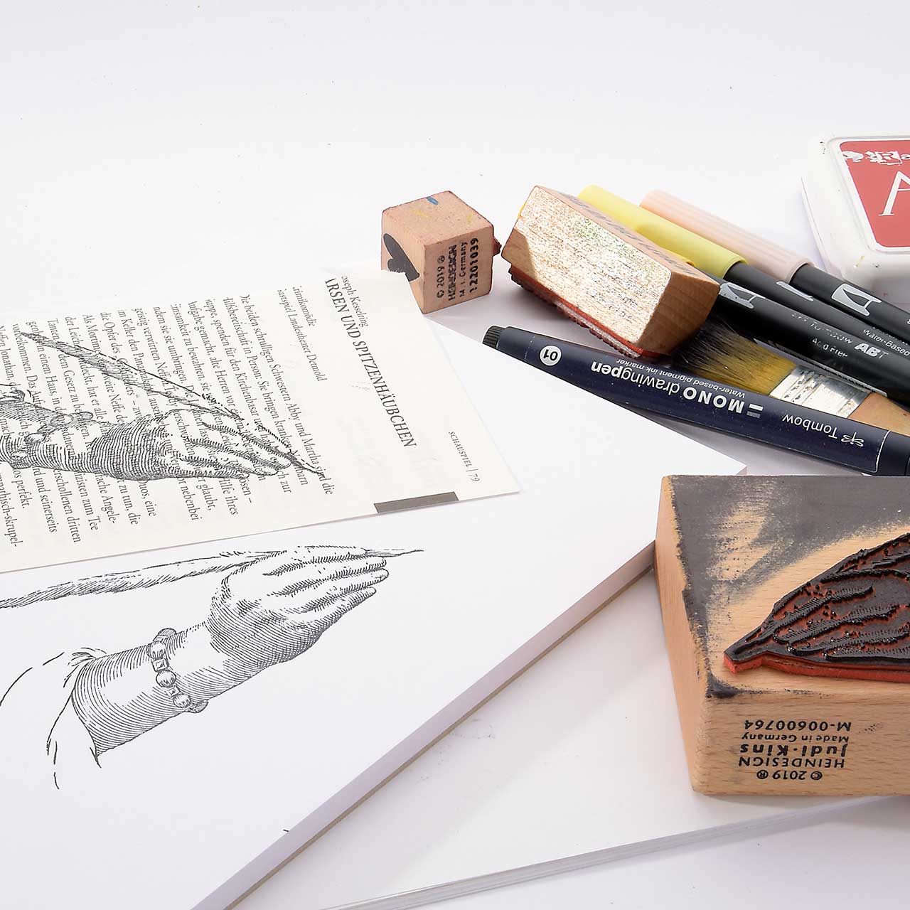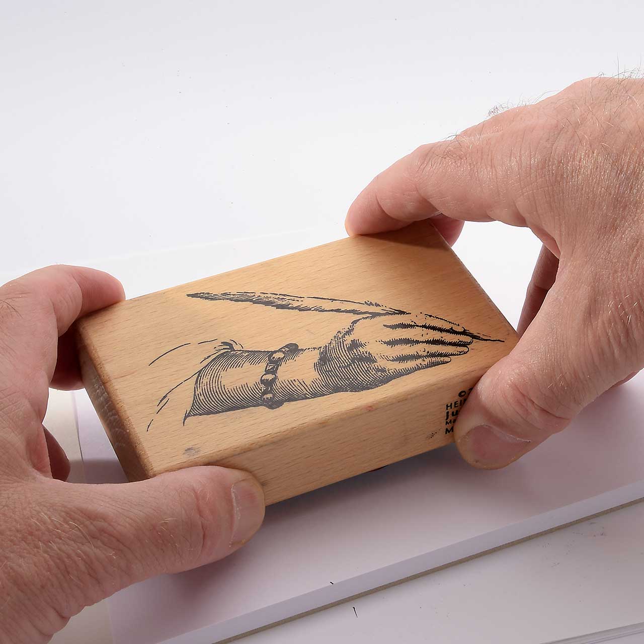 Stempeln Sie das Schreibende Hand Motiv mit dem schwarzen Stempelkissen einmal schön sauber unten links auf Ihre Karte und ein weiteres mal auf eine mit Text bedruckte Buchseite.