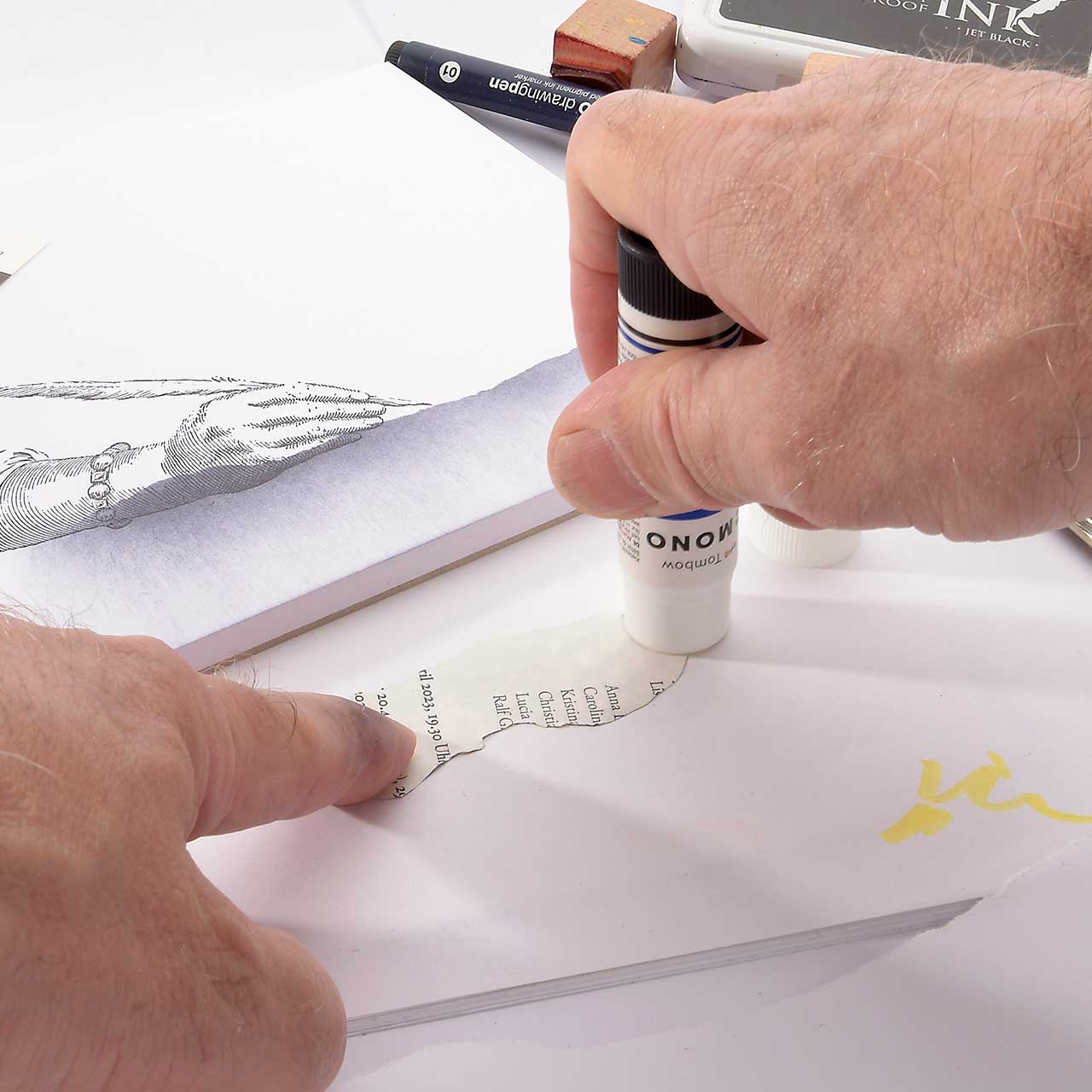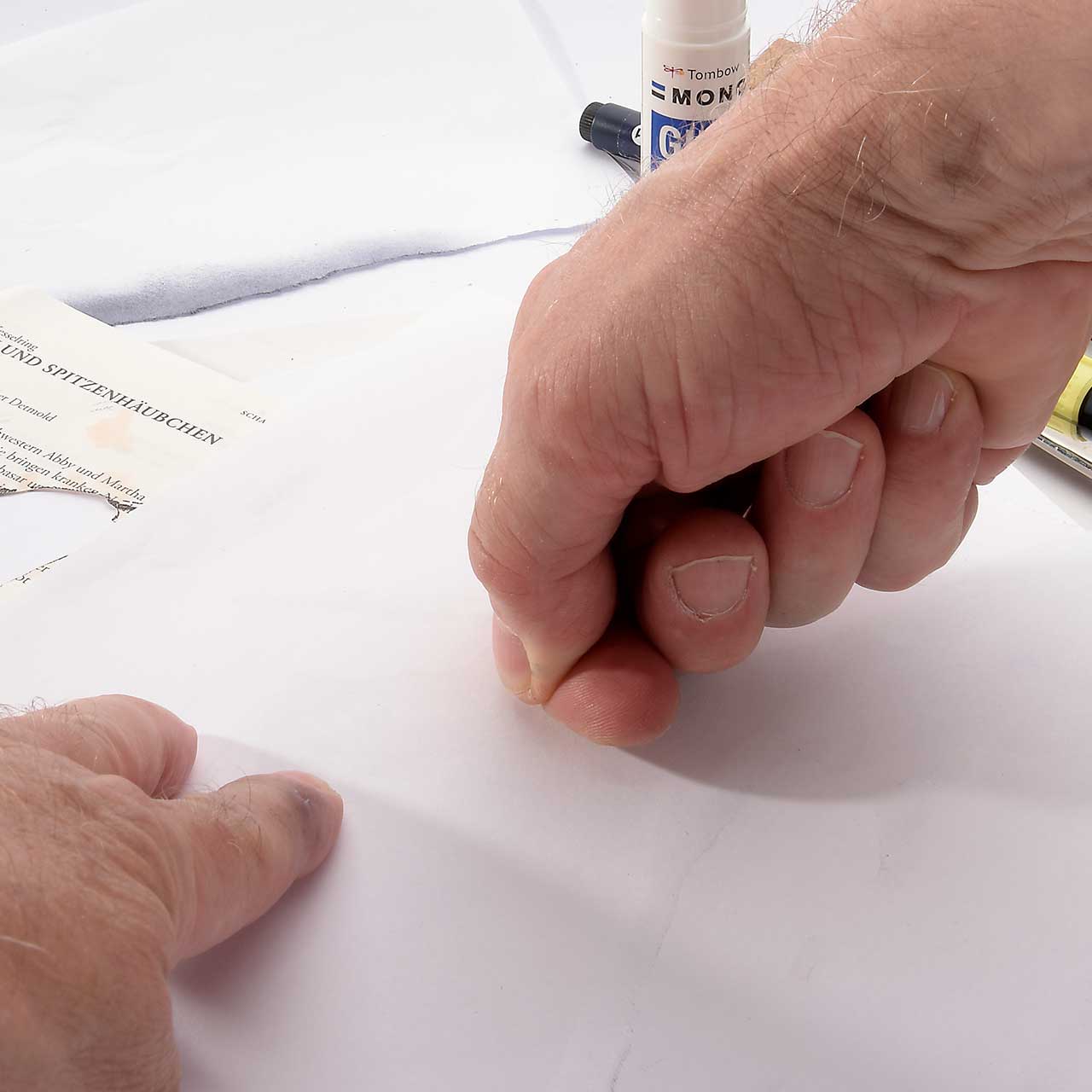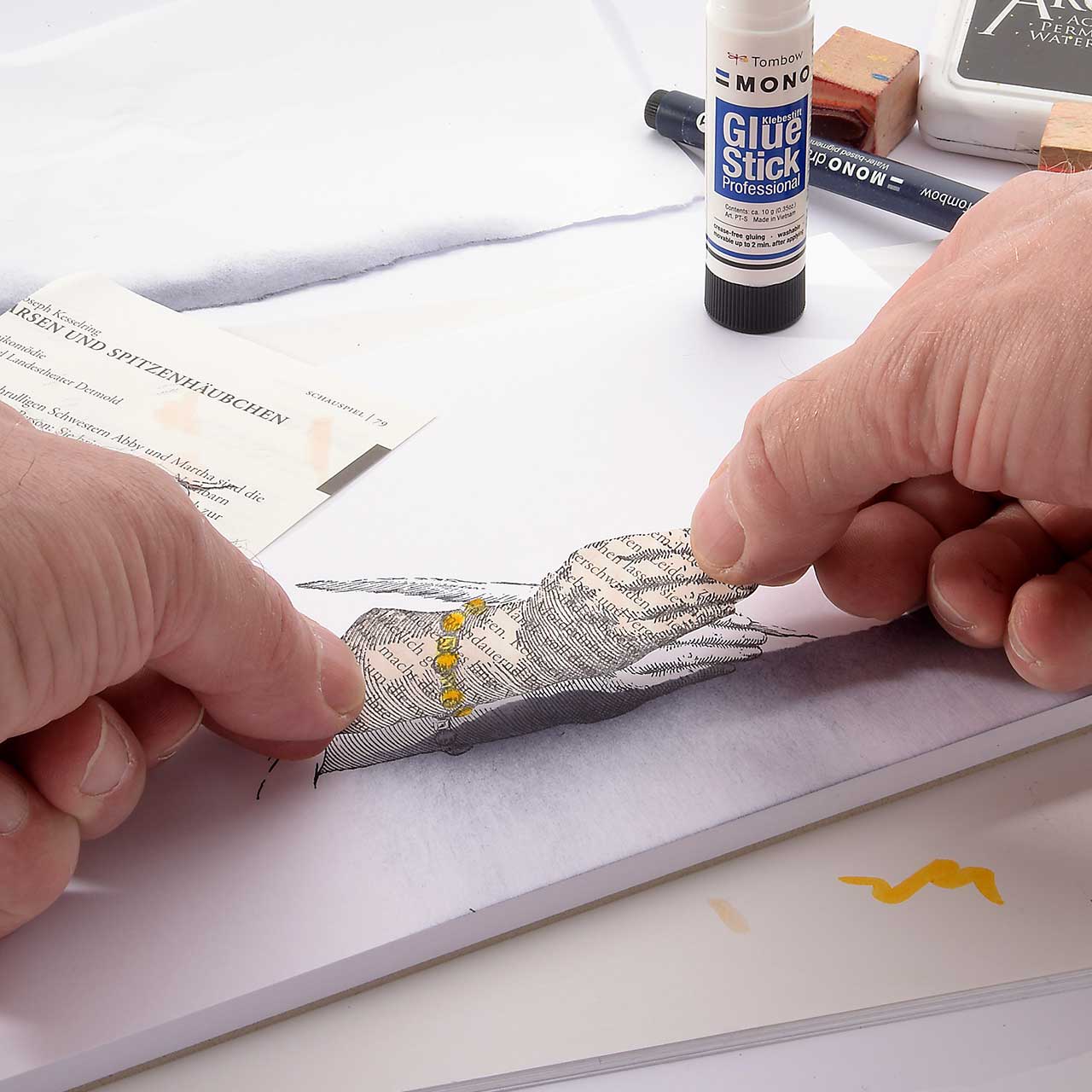 Kleben Sie das ausgeschnittene Motiv mit dem Klebestick genau auf das gestempelte Motiv auf Ihrer Karte. Zum Andrücken legen Sie ein Blatt Papier auf die Karte und drücken alles gut fest.