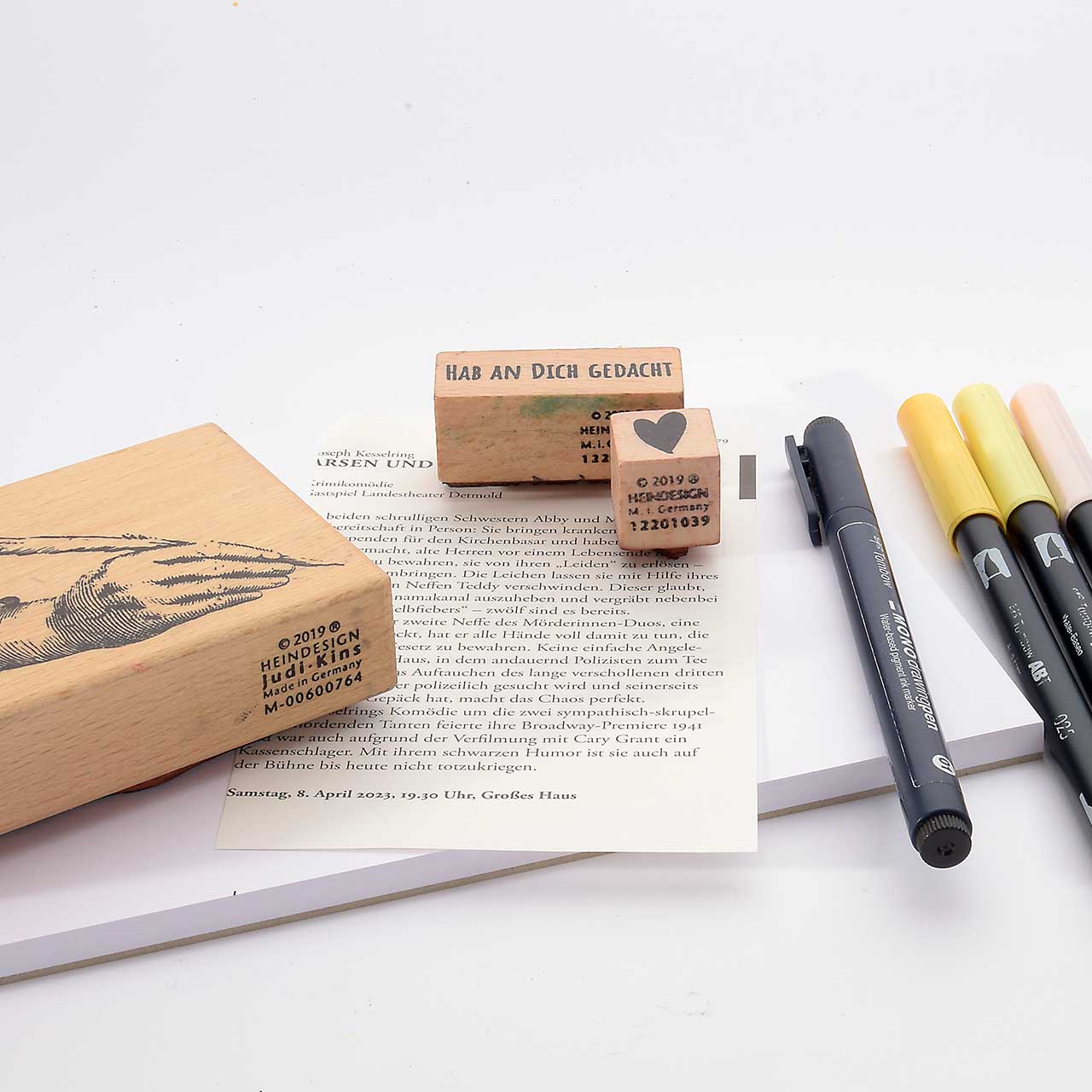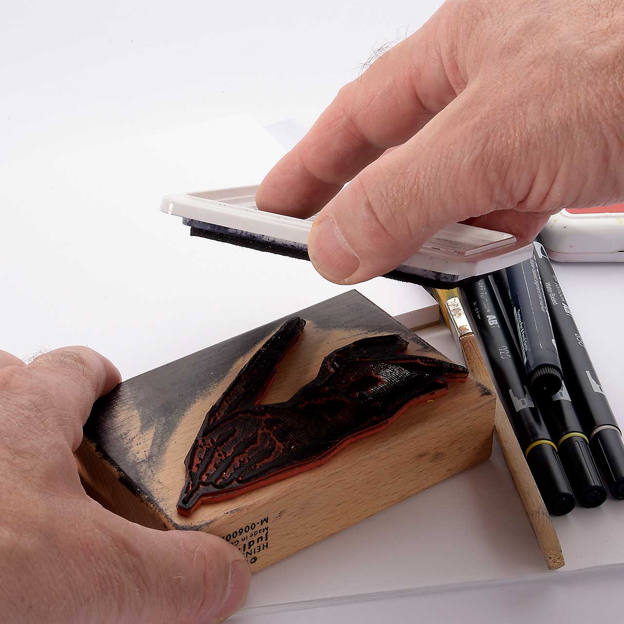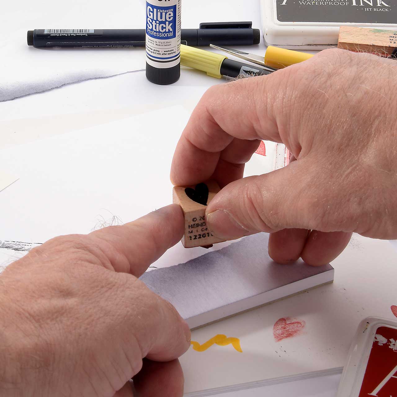 Stempeln Sie das Herz Motiv mit dem roten Stempelkissen auf den Horizont.