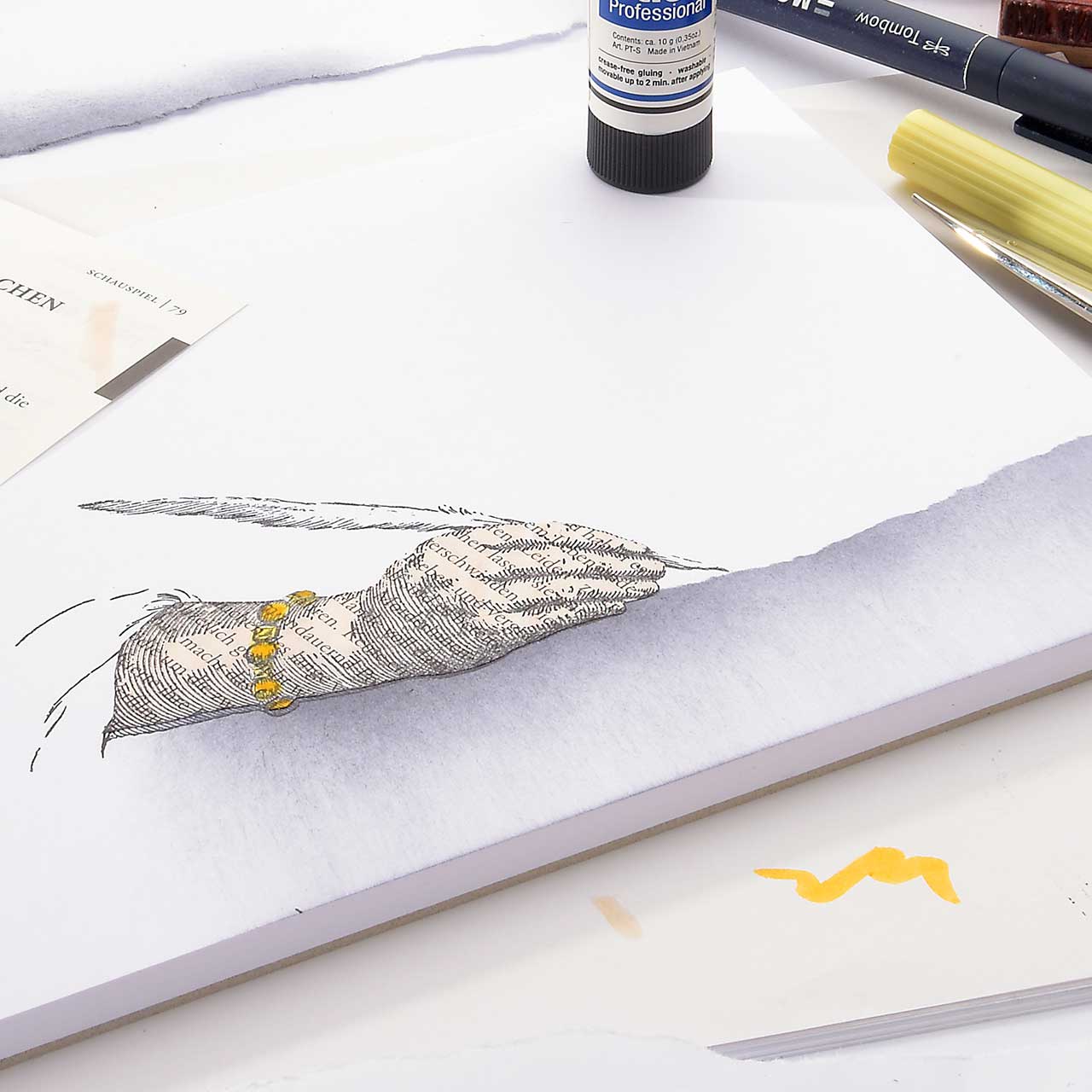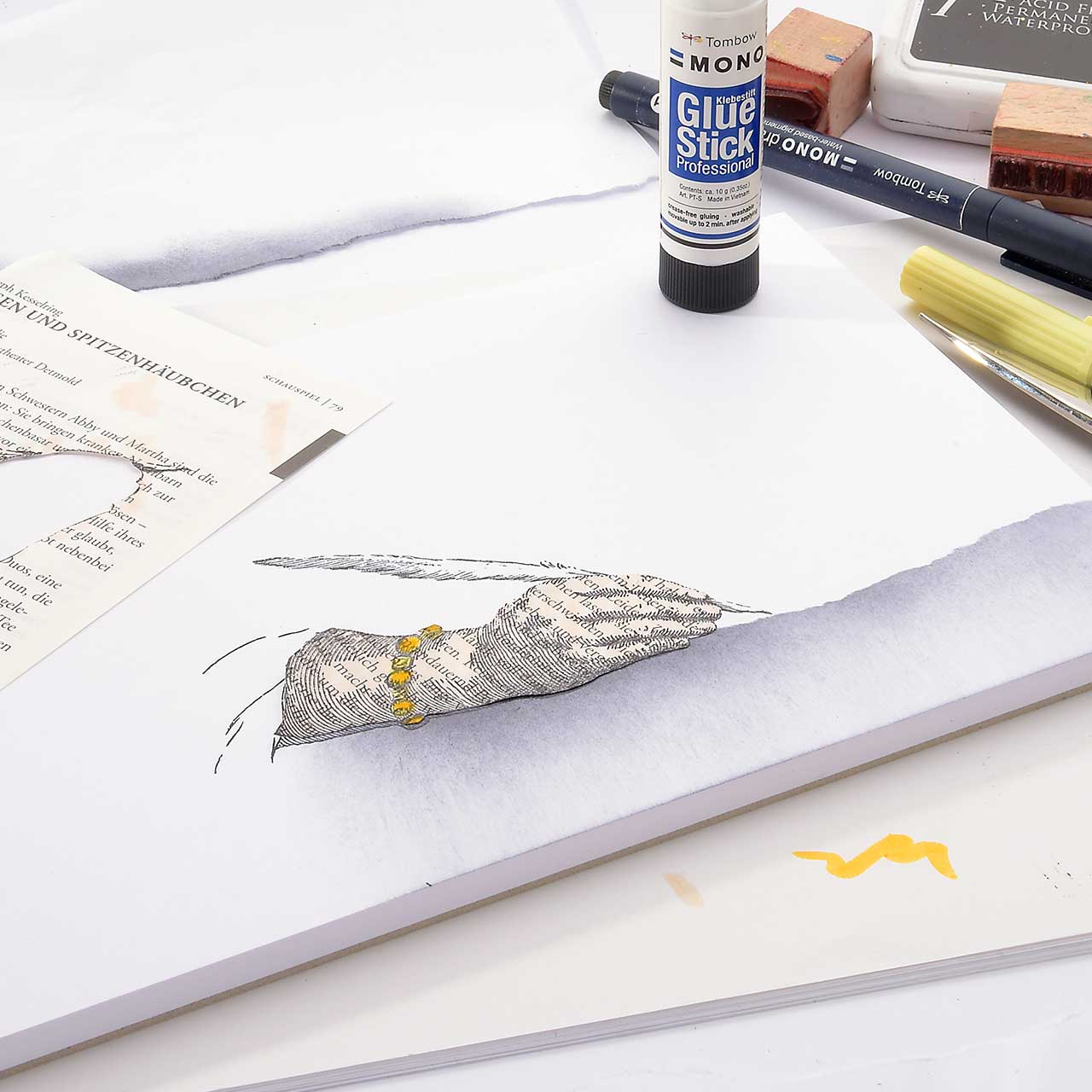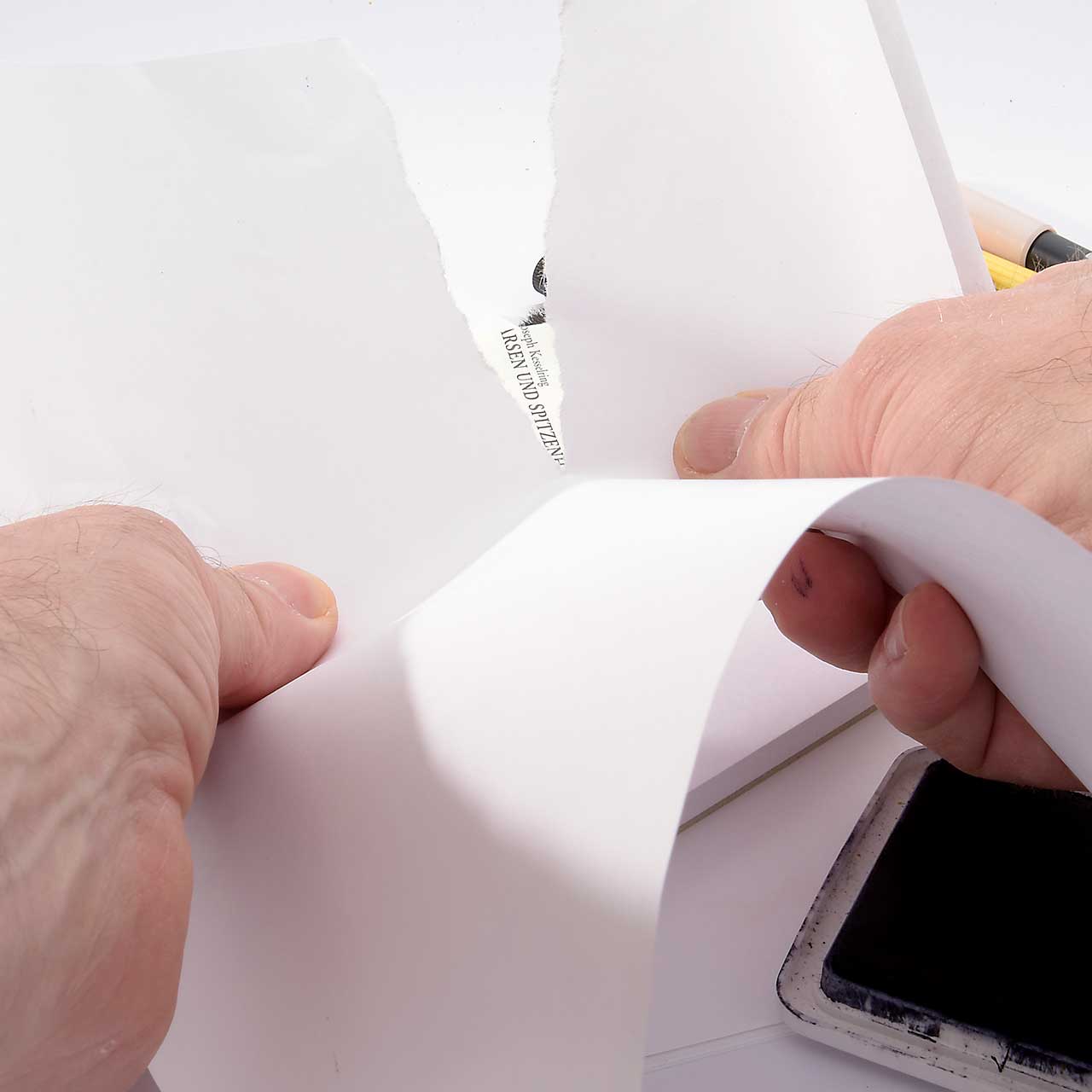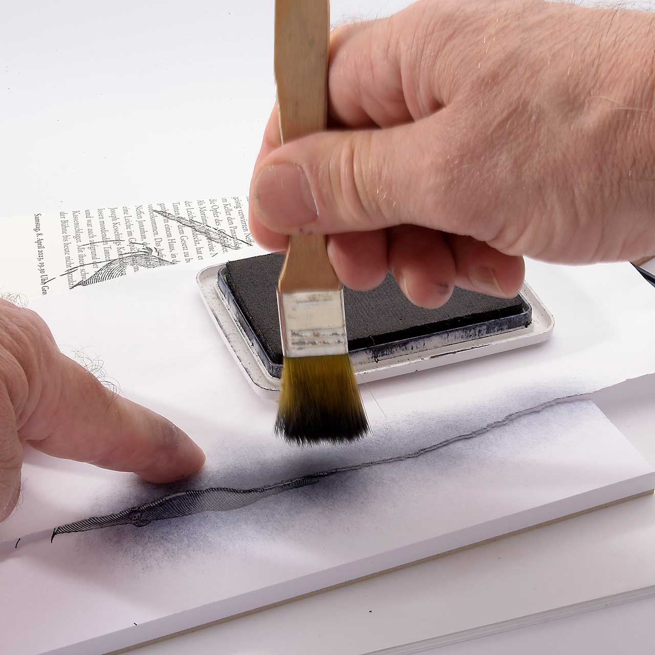 Reißen Sie ein Blatt Kopierpapier zurecht und nutzen Sie die gerissene Kante des Papiers zum Abdecken des Schreibende Hand Motivs. Die Papierkante soll einen unregelmäßigen Horizont über die ganze Karte erzeugen. Tupfen Sie mit dem Pinsel Farbe aus dem schwarzen Stempelkissen entlang der gerissenen Papierkante.