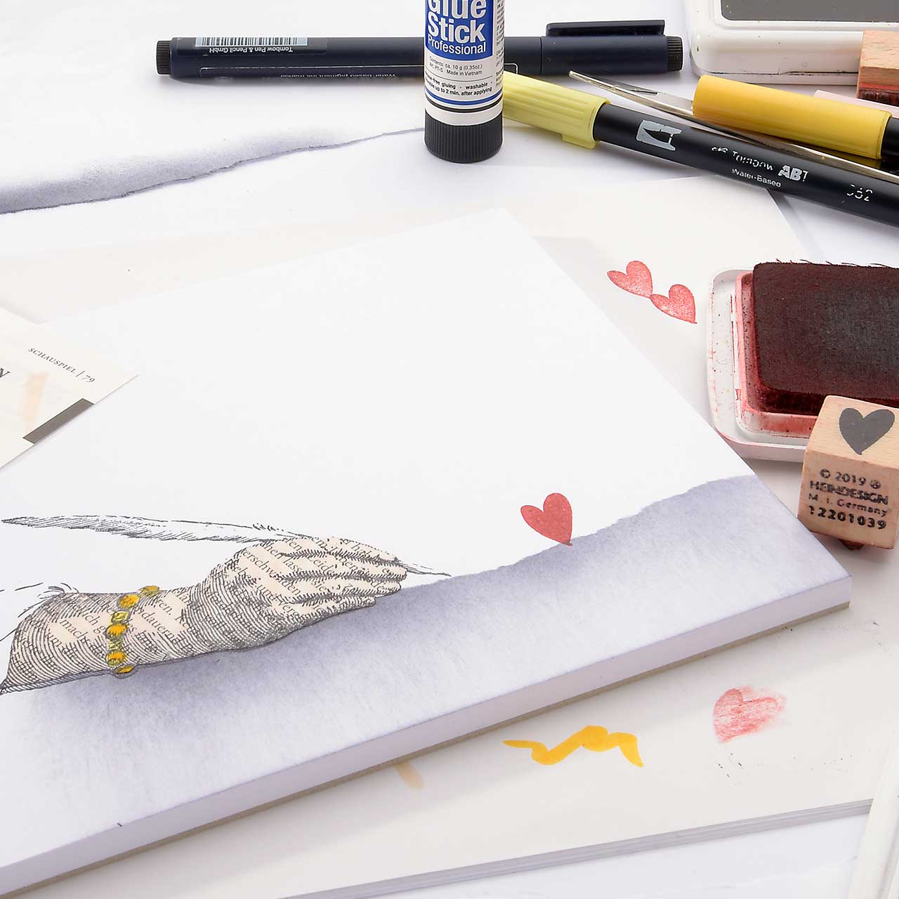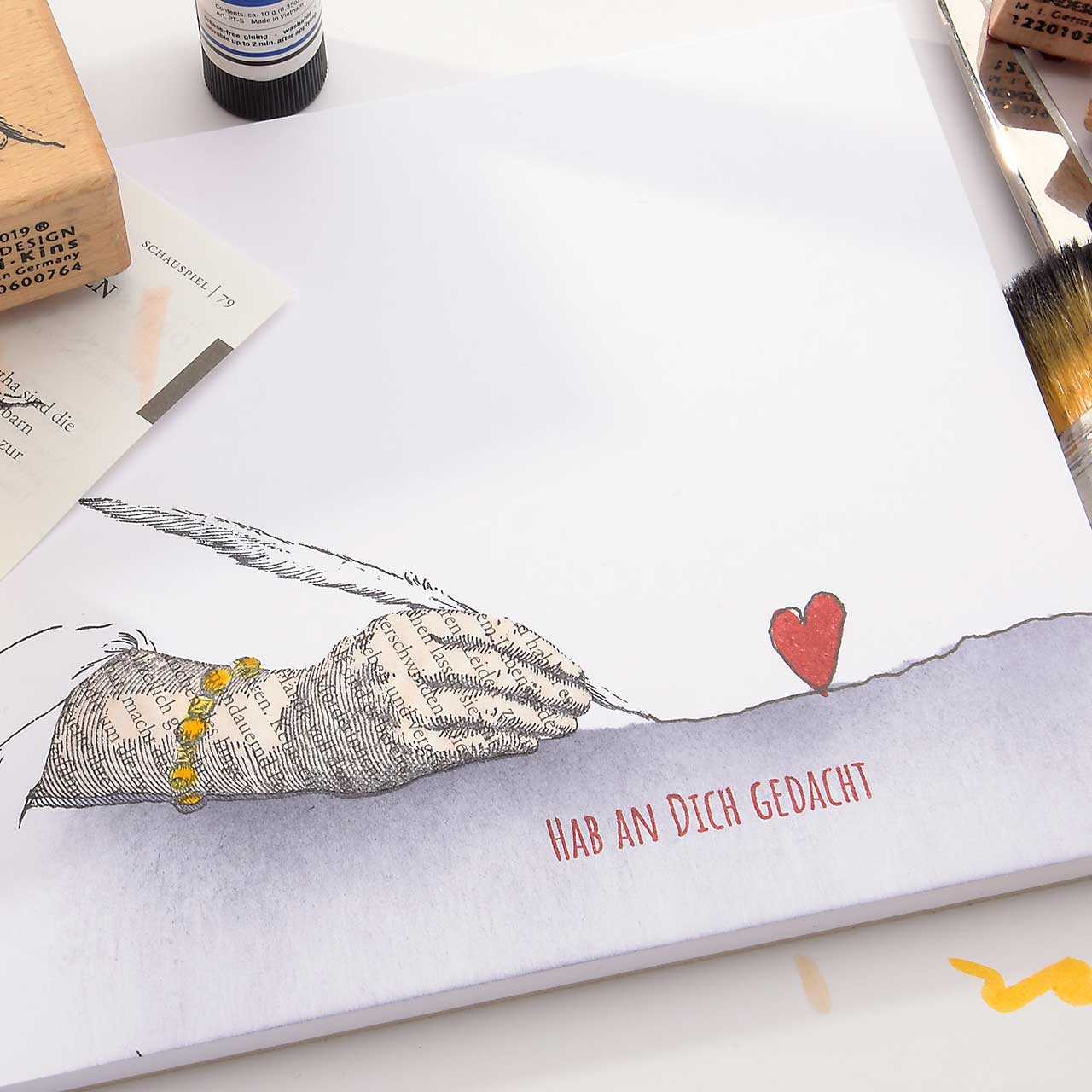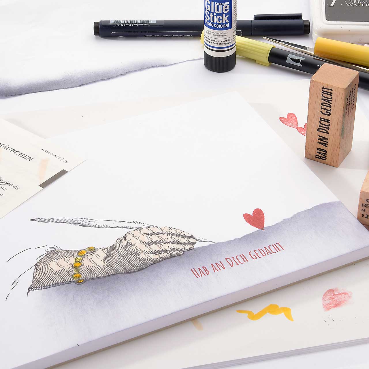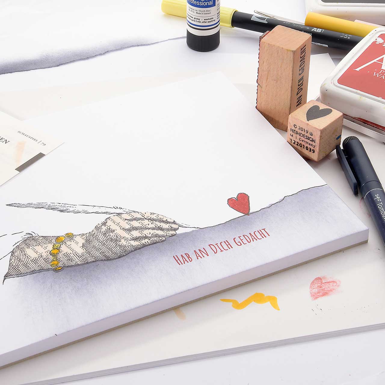Ziehen Sie mit dem Tombow Fineliner eine dünne Linie, ausgehend von dem Schreibfeder Motiv am Horizont entlang um das Herz herum zum Rand der Karte.