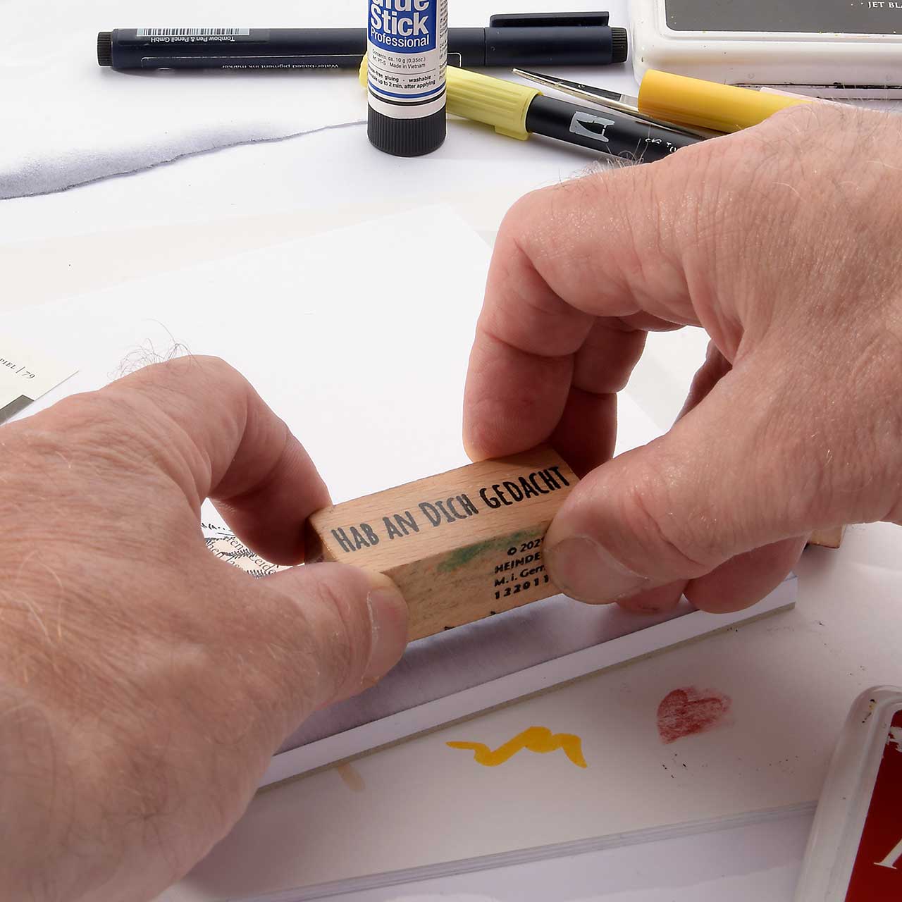 Stempeln Sie das „Hab’ an Dich gedacht“ Textmotiv mit dem roten Stempelkissen in die untere Mitte Ihrer Karte.
