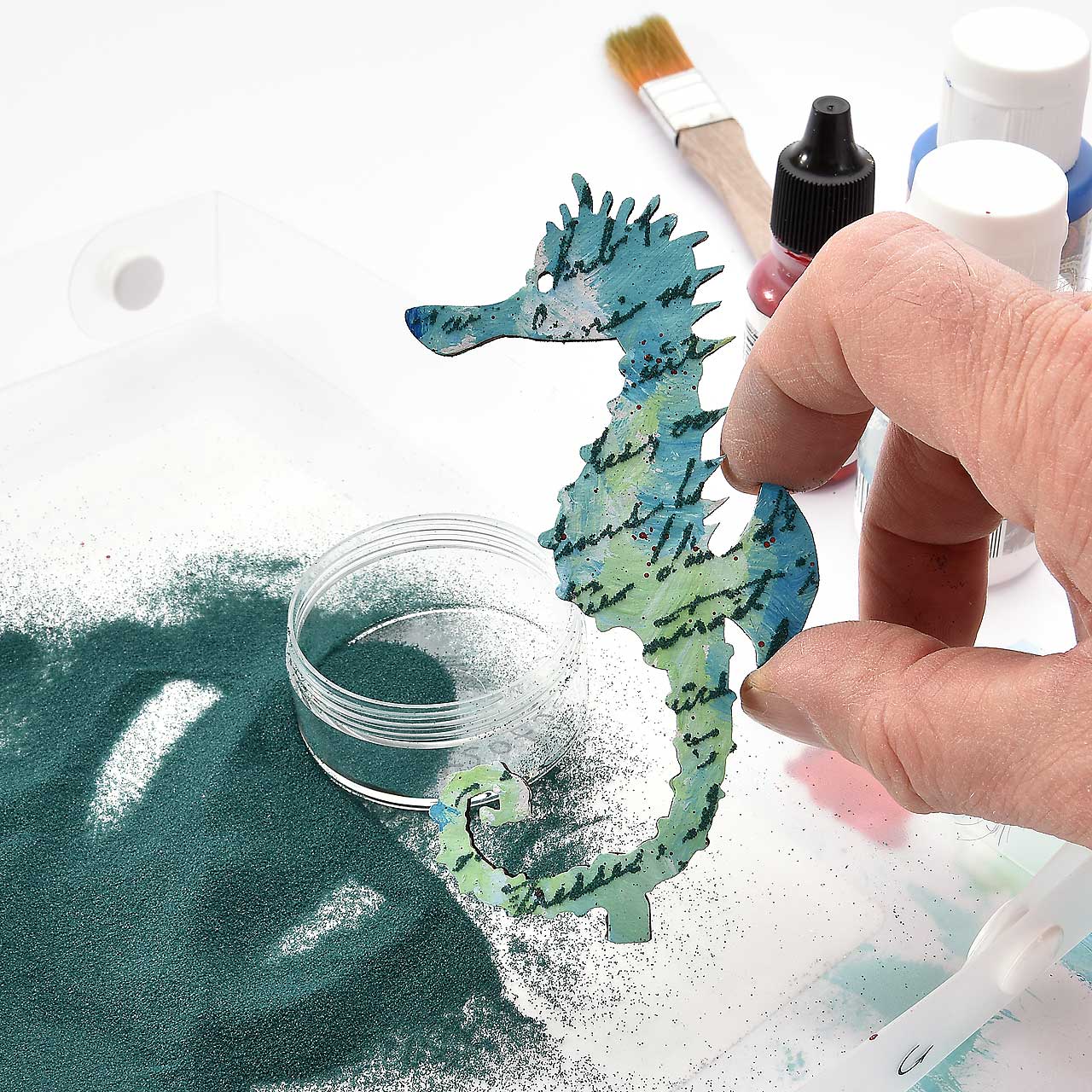 Mischen Sie beim Malen einen hellblauen Farbton mit viel weißer und sehr, sehr wenig blauer Acrylfarbe. Kolorieren Sie damit die Seepferdchen. Mischen Sie die Mica Gloss Farbe Limonengrün mit weißer Acrylfarbe und kolorieren Sie damit das Seepferdchen. Die Seepferdchen fleckig anmalen. Die Pinselstriche sollen erkennbar bleiben.