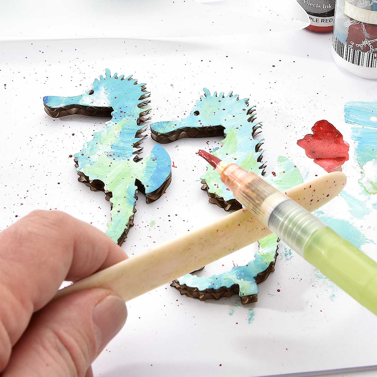 Klecksen Sie mit dem Füllerpinsel und der Mica Gloss Farbe Kandierter Apfel einige rote Sprenkel auf das Seepferdchen.