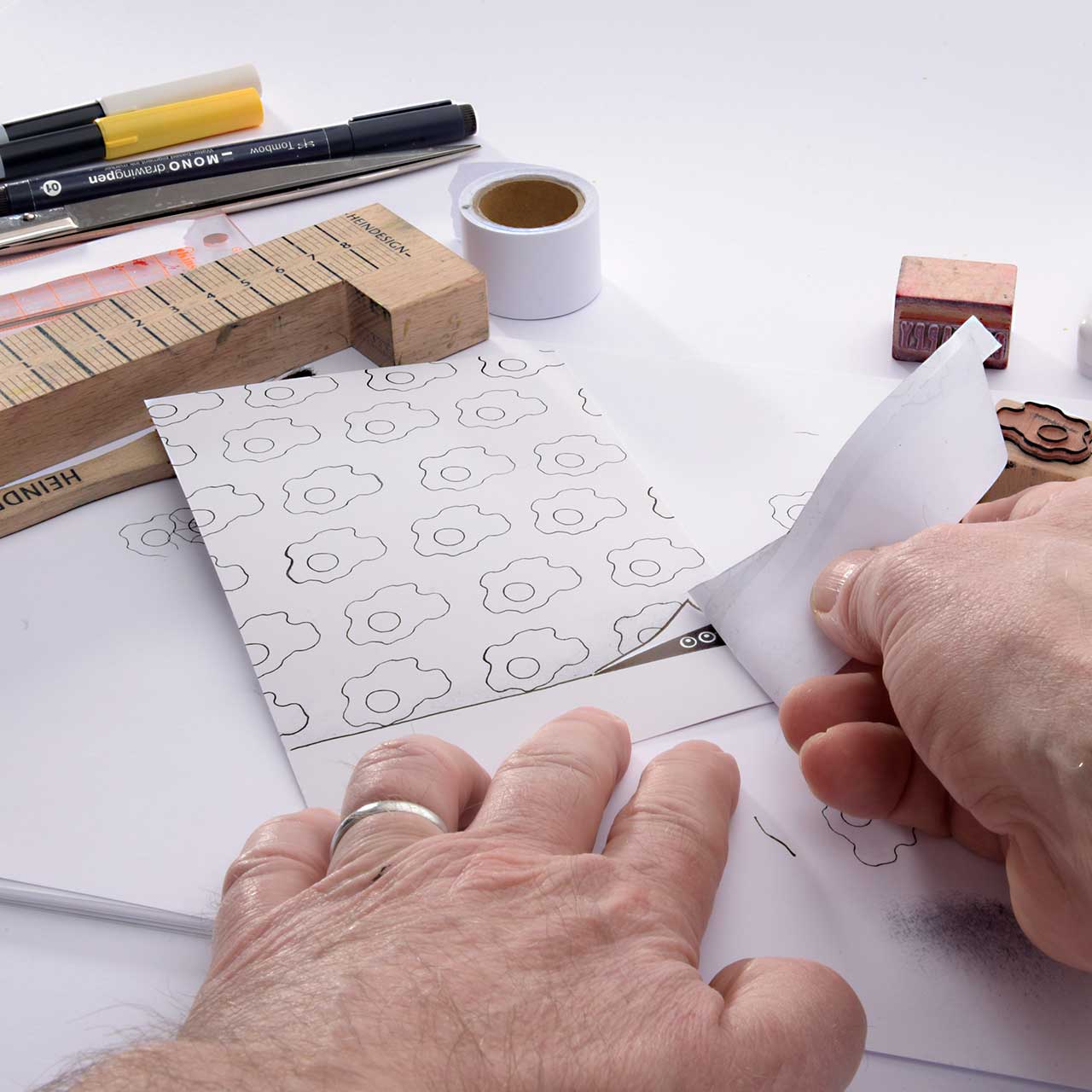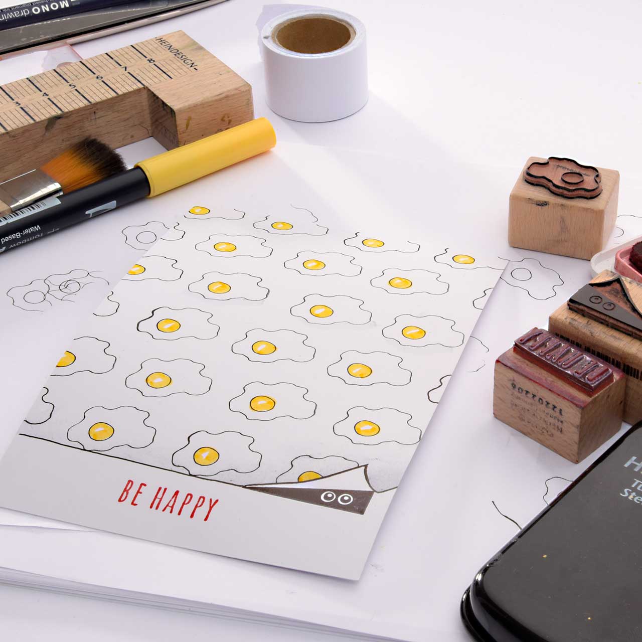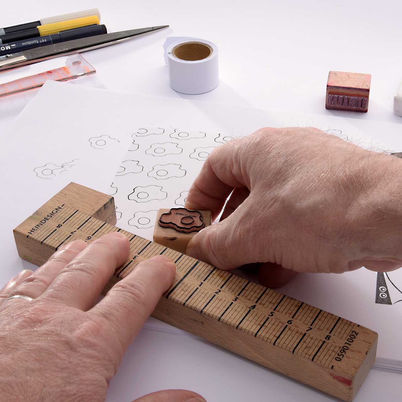 Stempeln Sie das Spiegelei Motiv zu einem gleichmäßigen „Tapetenmotiv“. Mit Hilfe des Stempelanlegewinkels können Sie schön gerade in einer Reihe stempeln. Zum Messen der Abstände zwischen den Reihen legen Sie den Stempel rückseitig auf ihre Karte und schieben ihn zur zuletzt gestempelten Reihe, dann legen Sie den Stempelwinkel an und stempeln die Reihe. Wichtig ist - damit es wie ein Tapetenmuster aussieht - dass Sie über den Rand der Karte Hinaus stempeln.