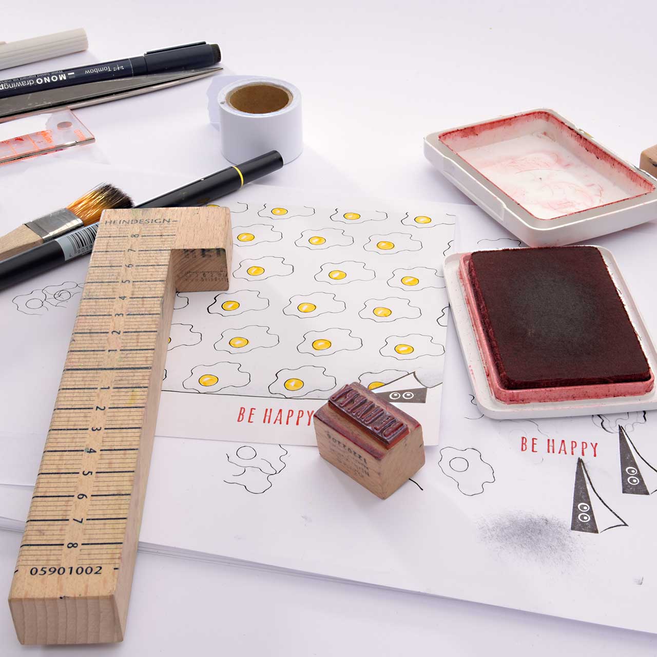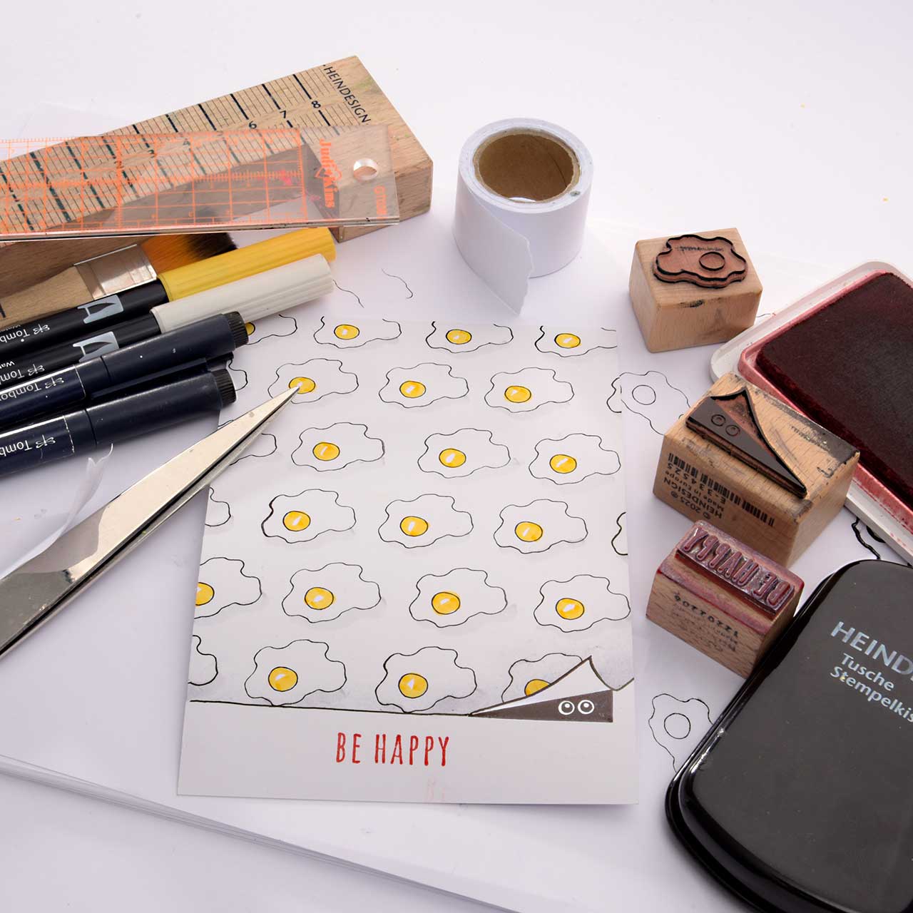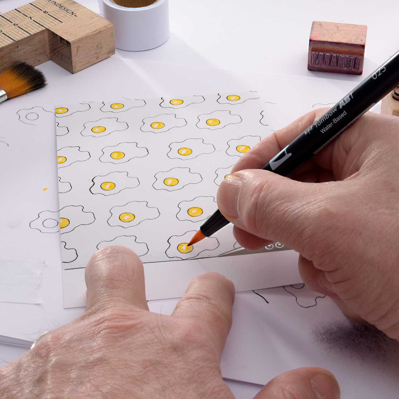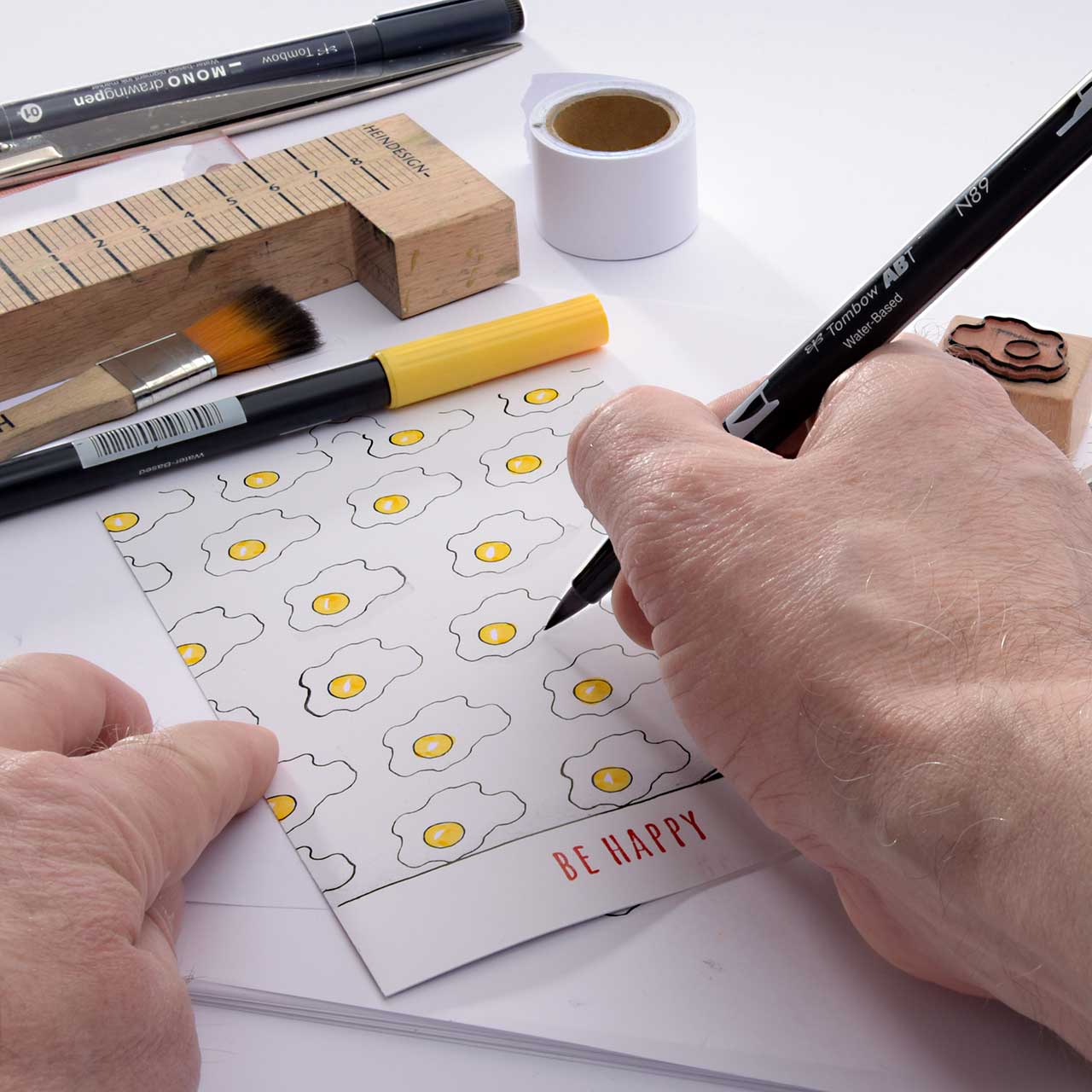 Und dann - ich hätte es fast vergessen - malen Sie mit dem Tombow Faserschreiber einen kleinen hellgrauen Schatten unter jedes Spiegelei Motiv.