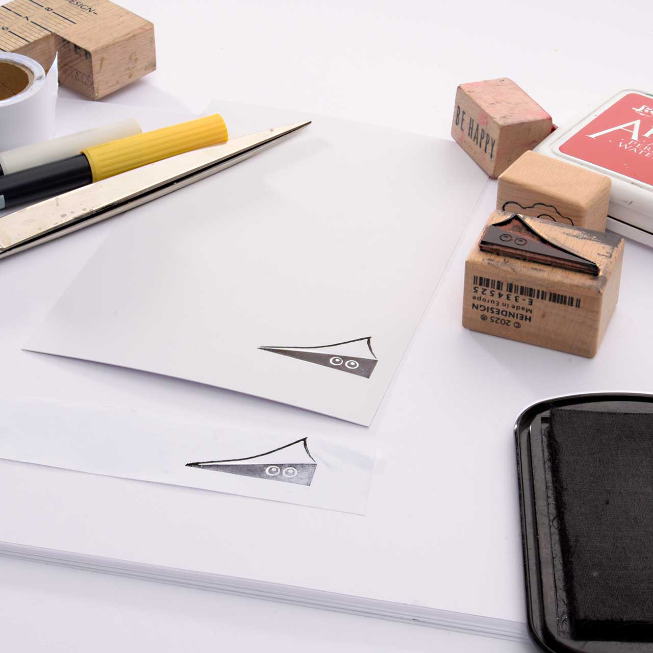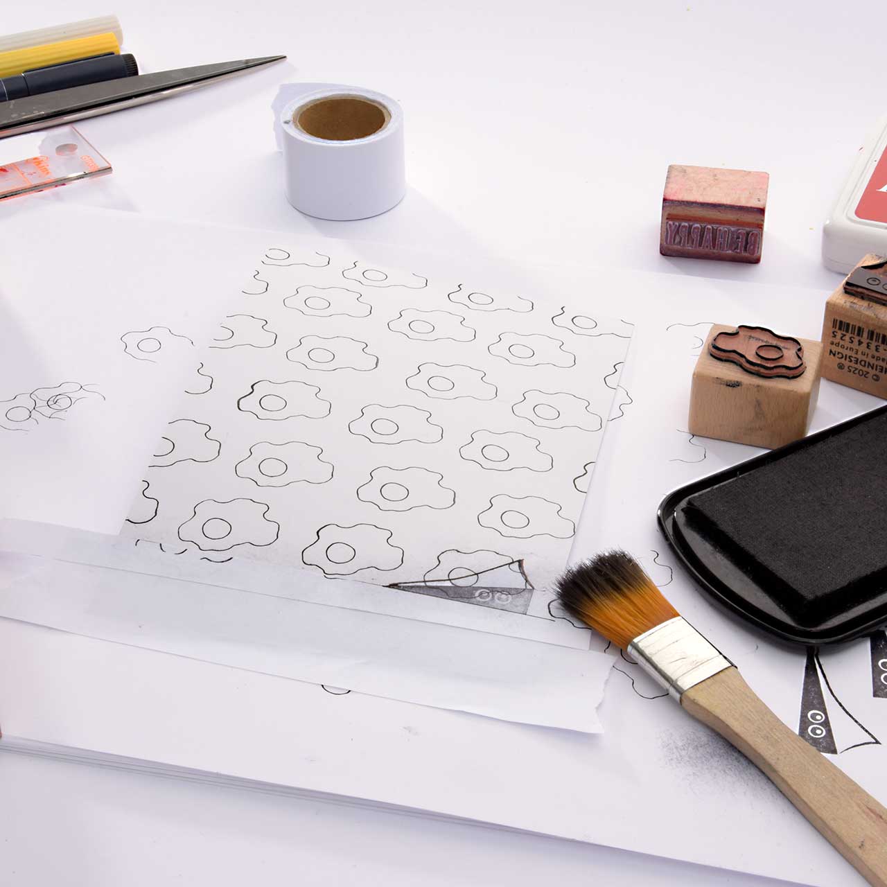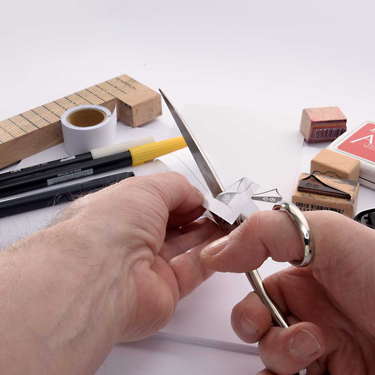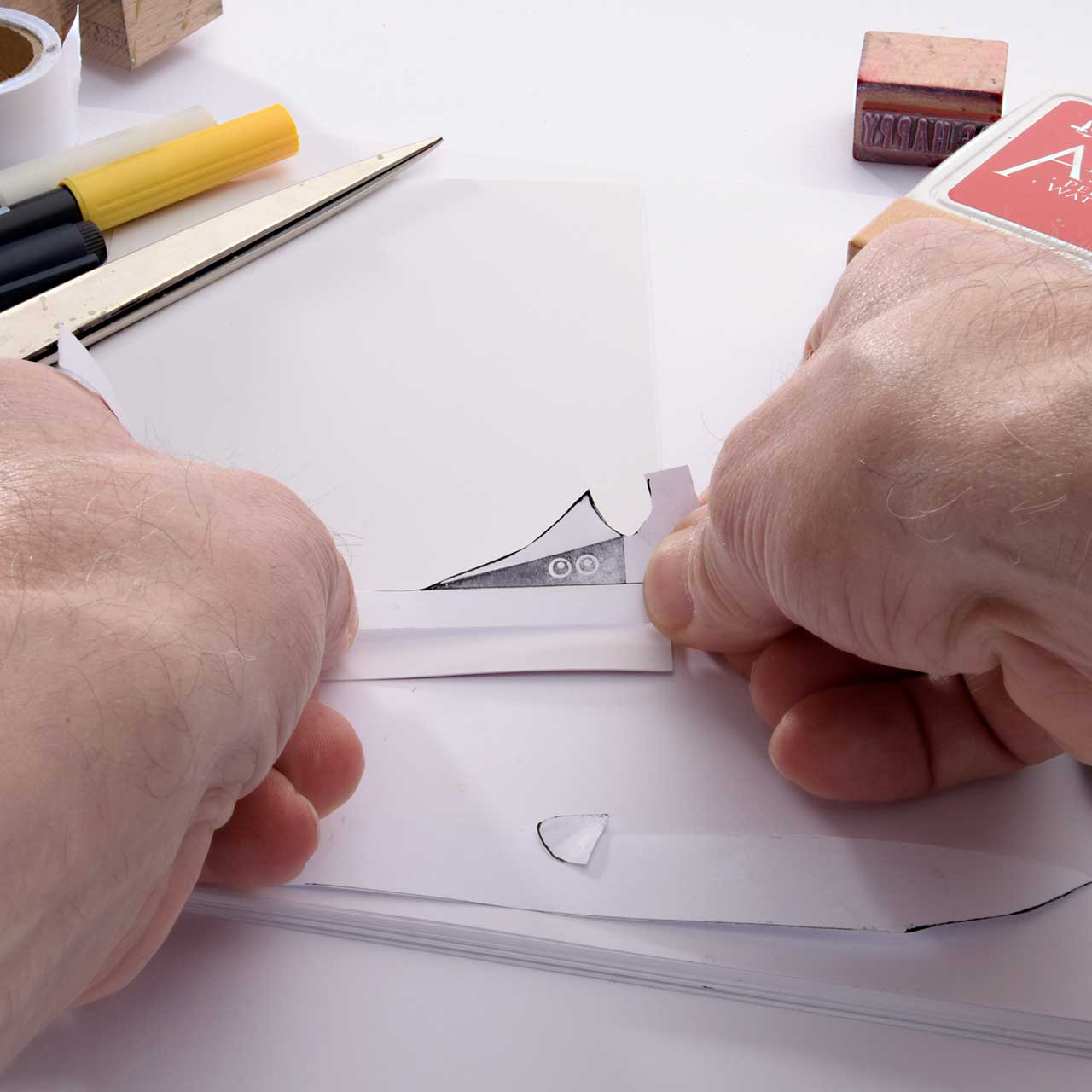 Der Abdruck auf dem Eclipse Papier dient zum Abdecken, darum vervollständigen Sie das Motiv ein wenig. Mit einer Linie an der unteren Kante und einem kleinen Bogen am rechten Ende des Motivs. Schneiden Sie das Motiv entlang der Linie aus.