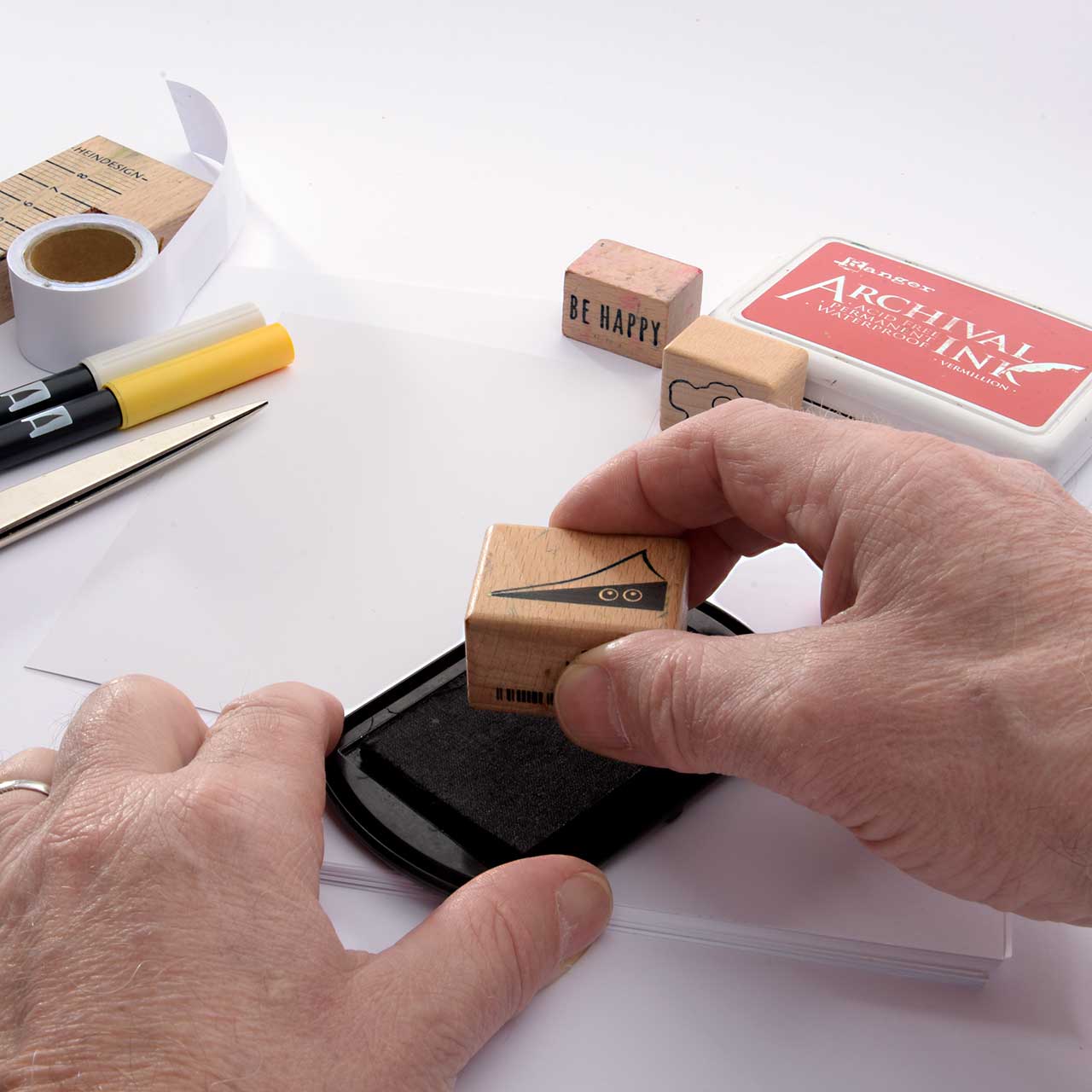 Stempeln sie das Dunkelmunkel Motiv mit dem schwarzen Stempelkissen in die untere rechte Ecke Ihrer Karte und gleich ein weiteres Mal auf einen Streifen Eclipse Papier.