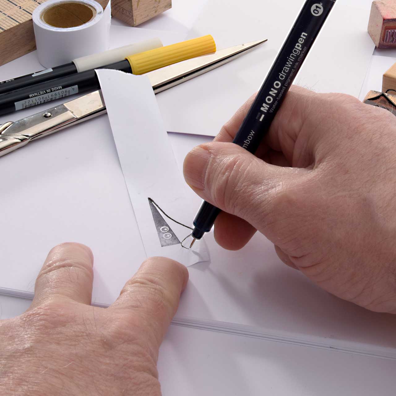 Ziehen Sie mit dem Tombow Fineliner (05) eine Linie entlang des Eclipse Papiers und ziehen Sie das Papier dann ab.