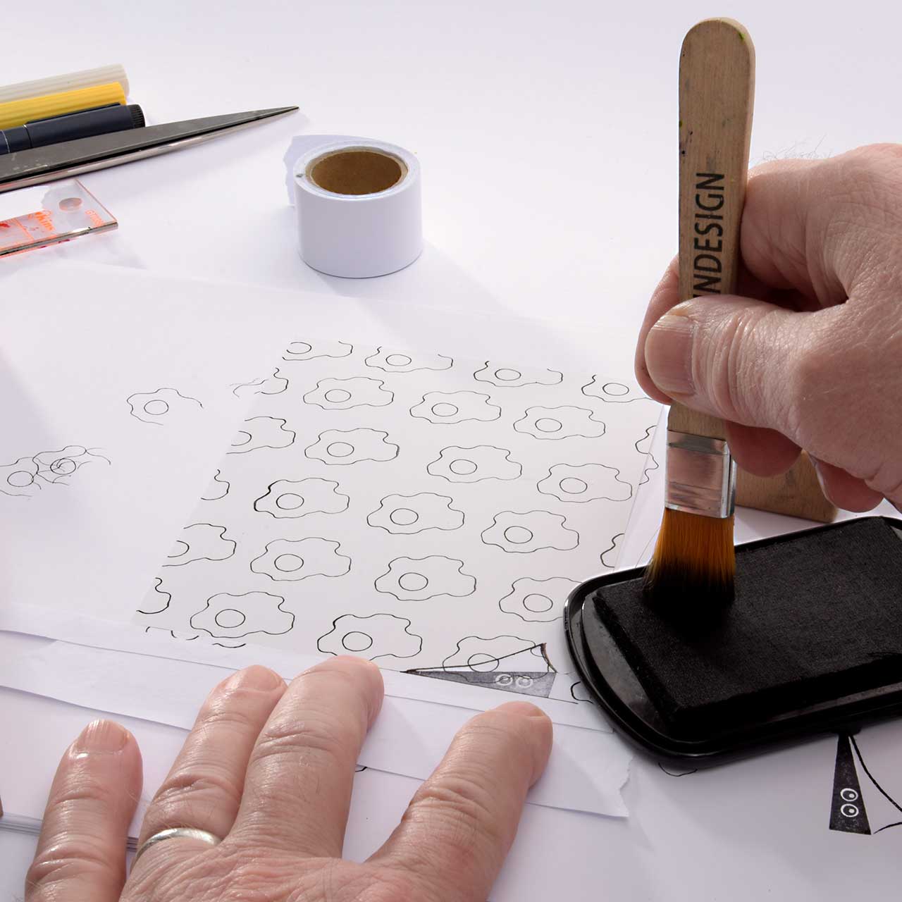 Nehmen Sie mit dem Pinsel etwas Farbe aus dem Stempelkissen und tupfen Sie am unteren Ende der „Spiegelei-Tapete“ eine hellgraue Fläche.