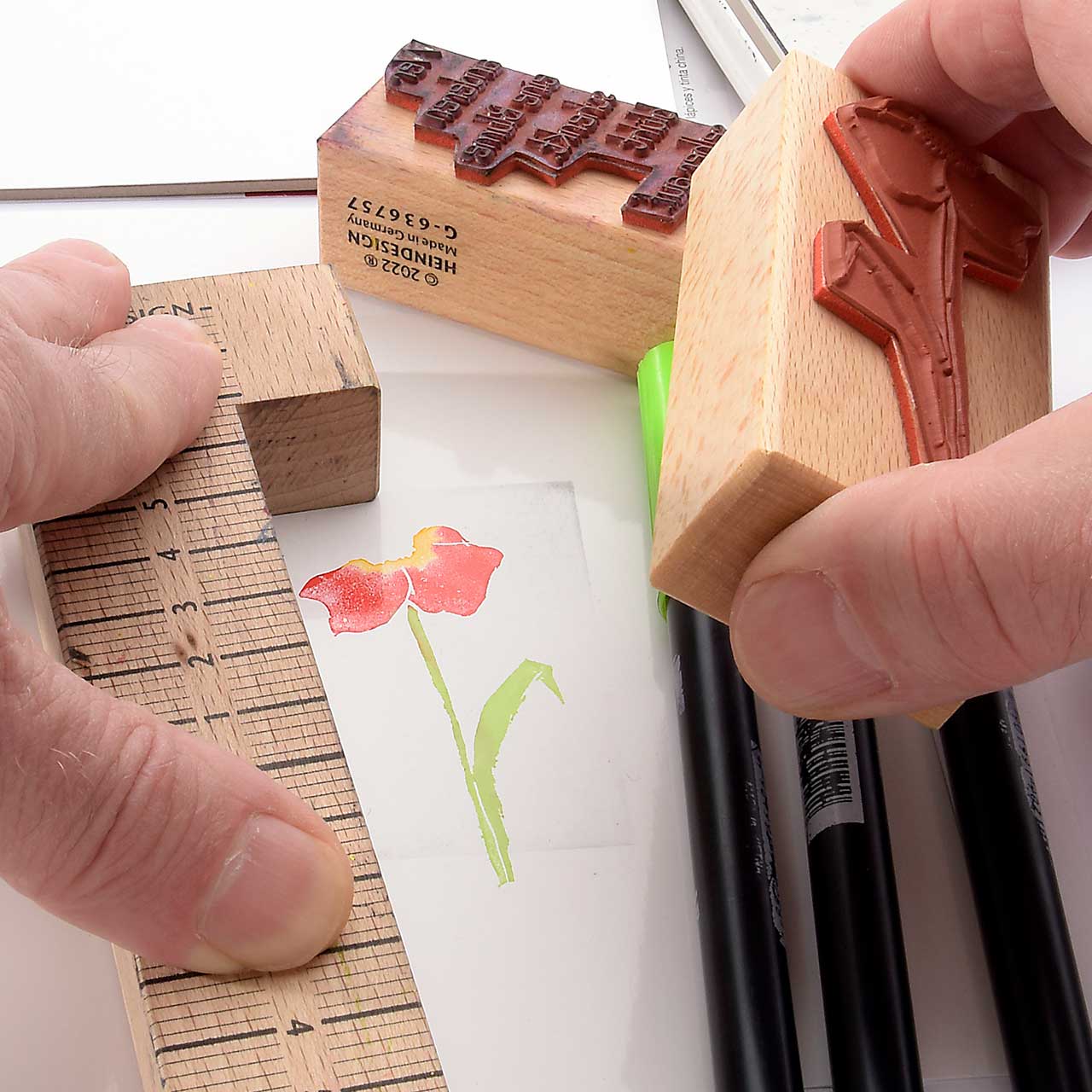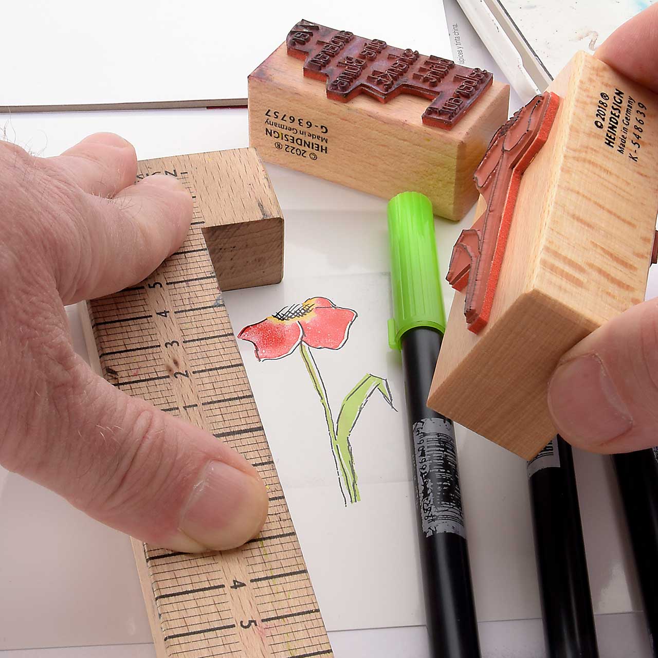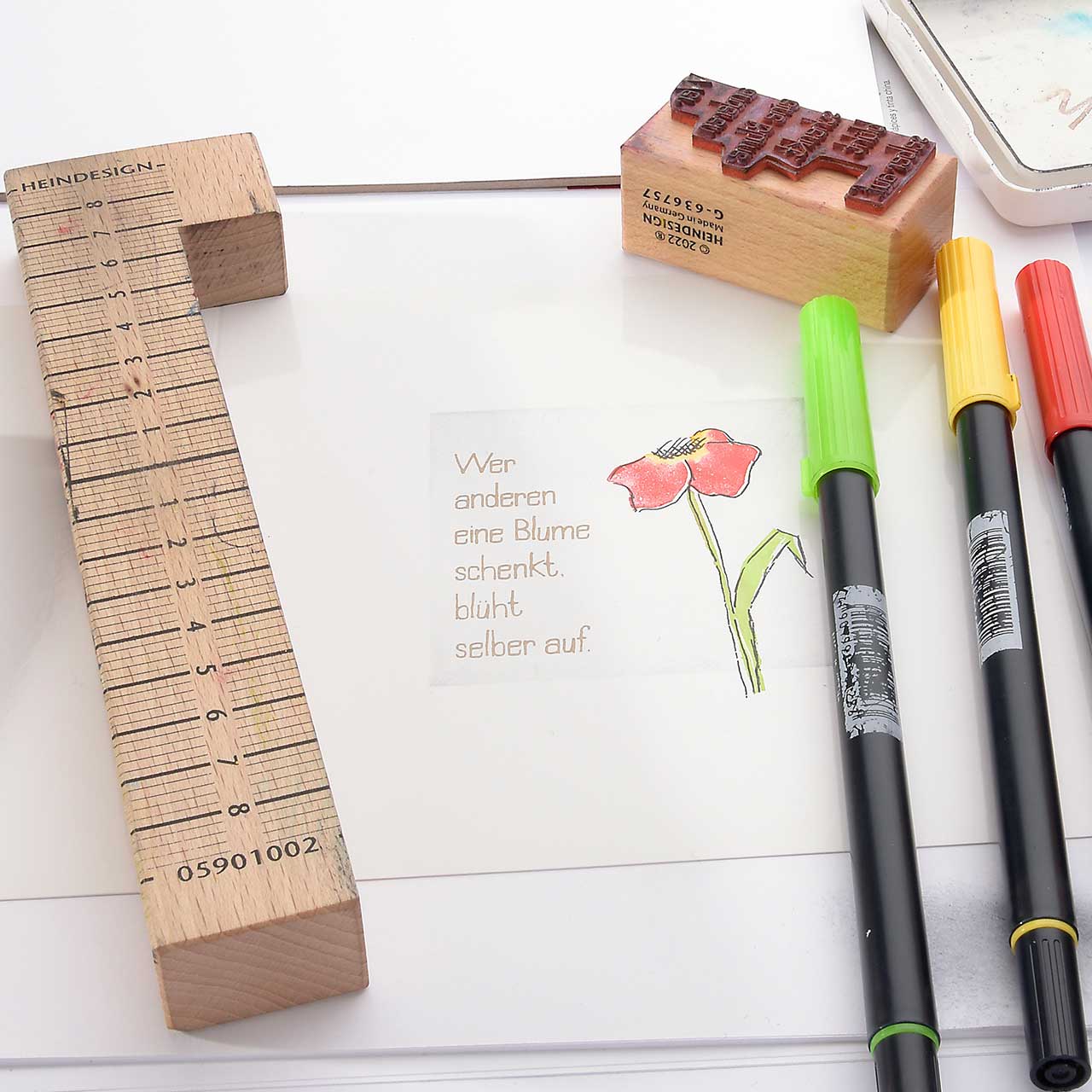 Für das ordentliche Stempeln in einer geraden Reihe dient der Stempelwinkel als Anlegeleiste von Heindesign. Die Zentimeter Einteilung hilft für einen gleichmäßigen Abstand und um die exakte Mitte Ihrer Karte zu finden.