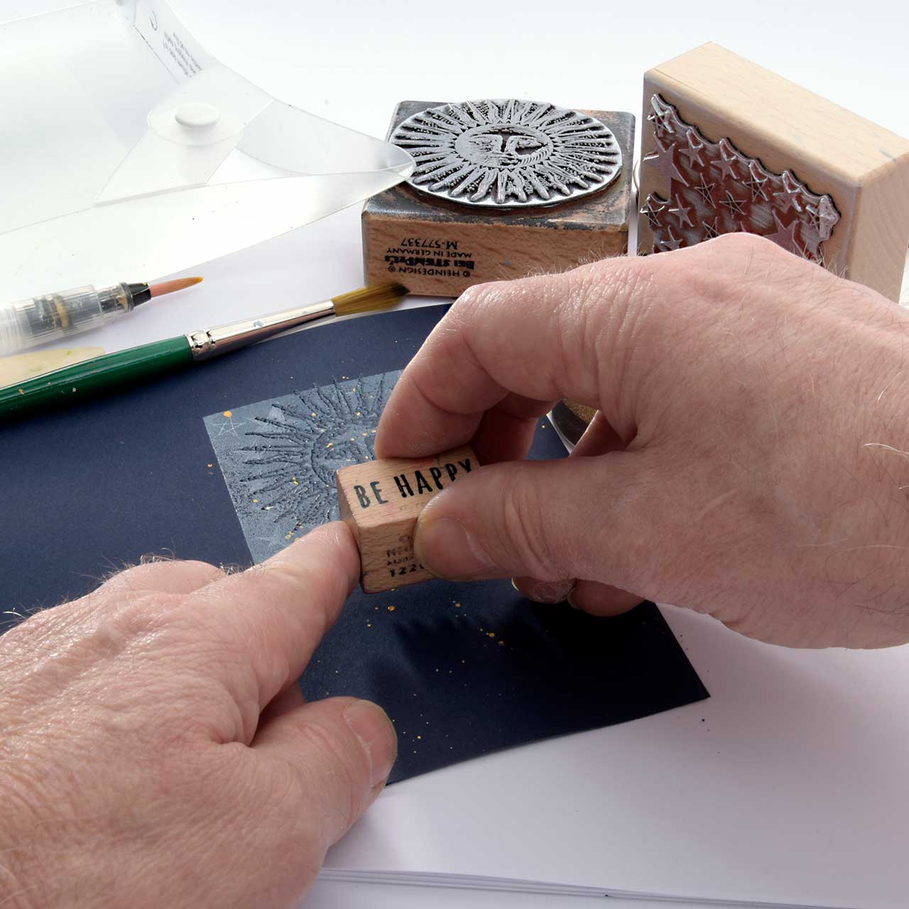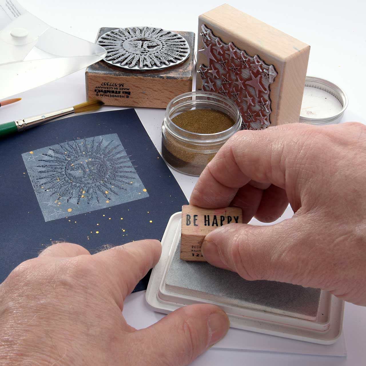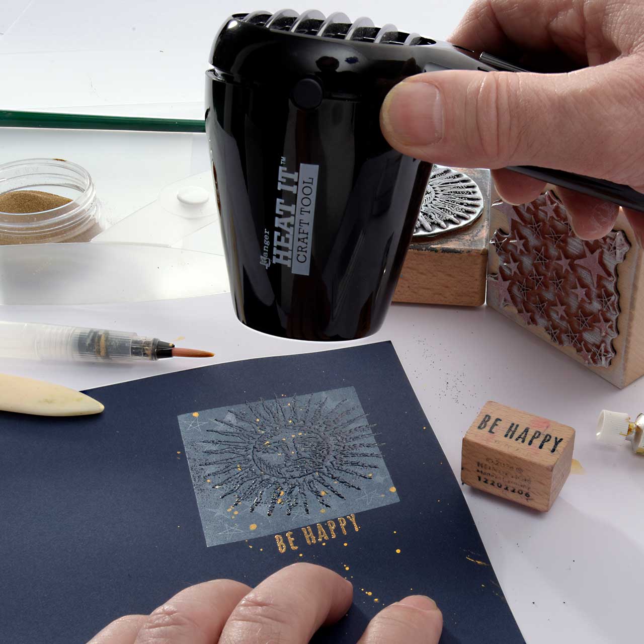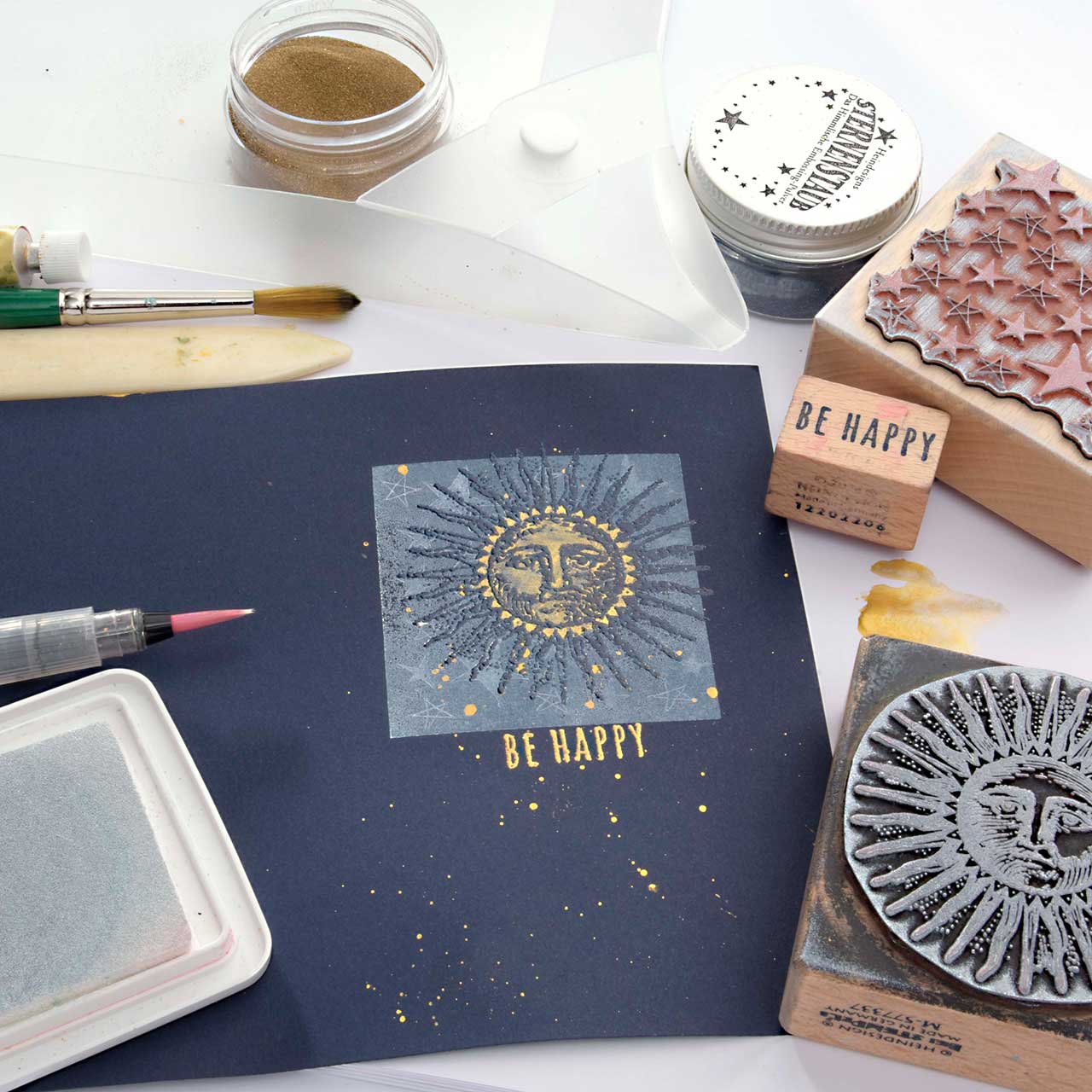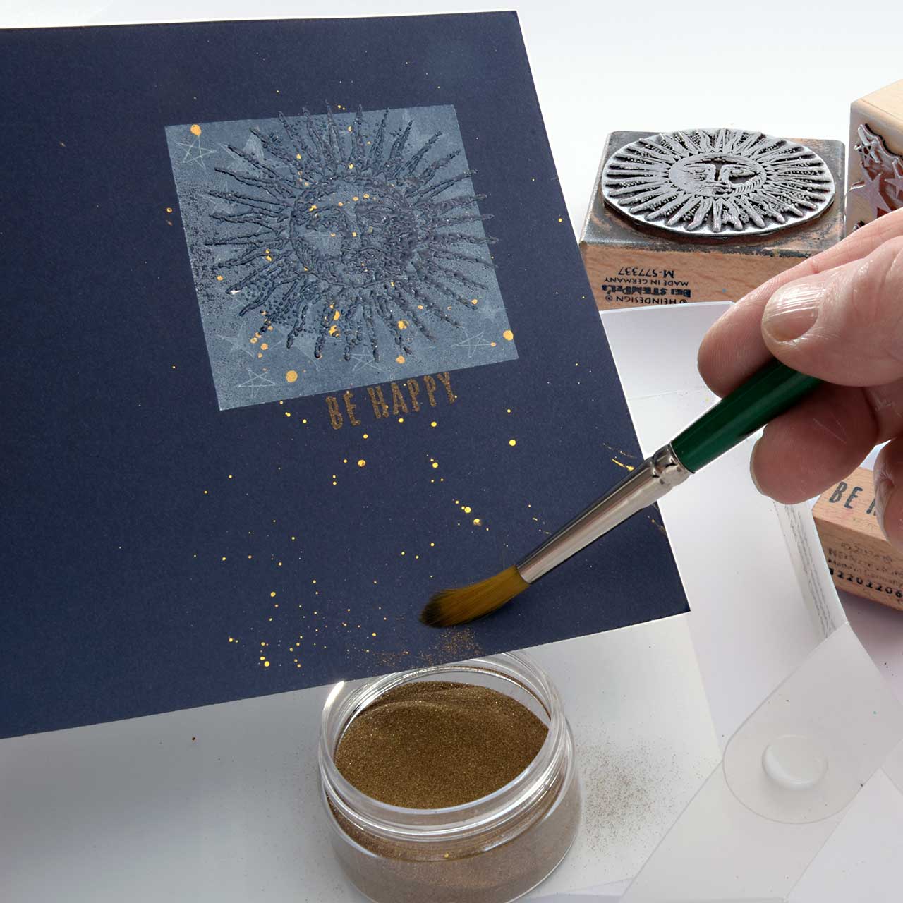 Stempeln und embossen Sie das „Be Happy“ Textmotiv mit dem goldenen Sternenstaub unter das Quadrat.