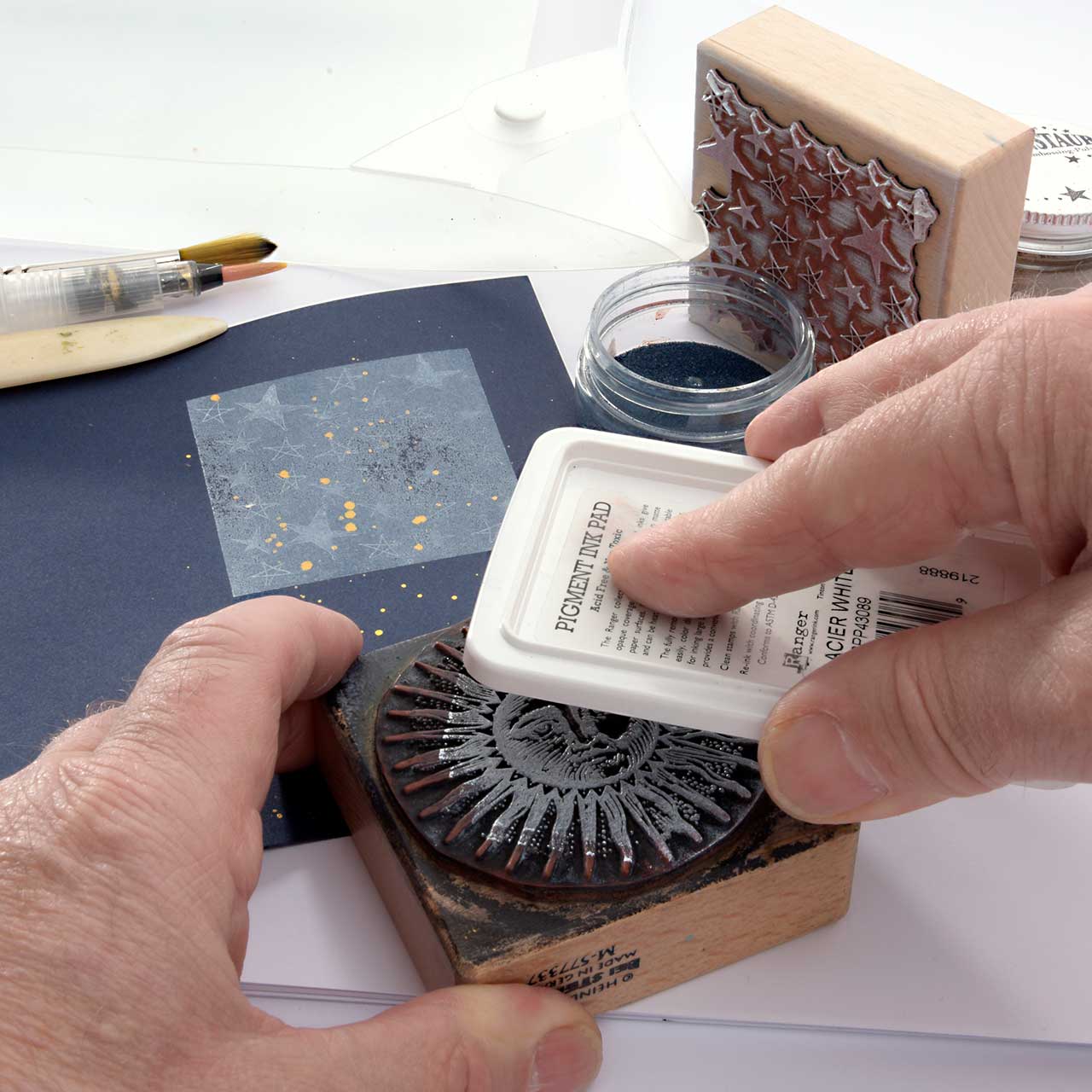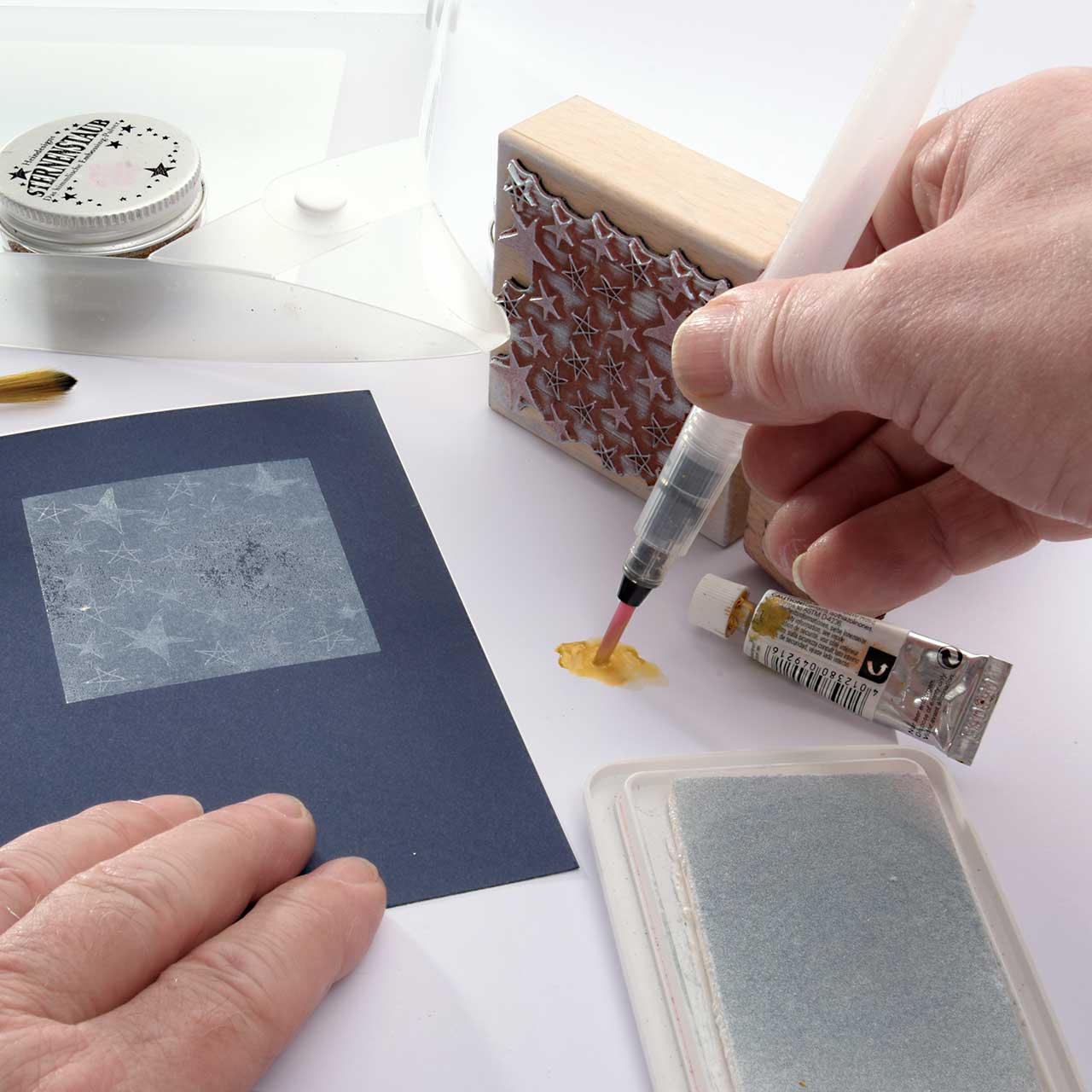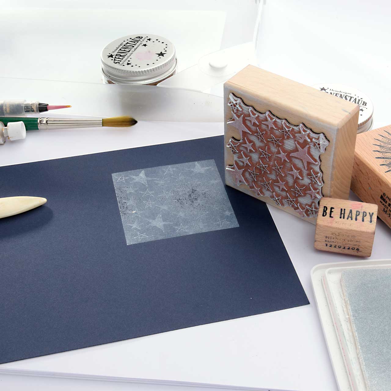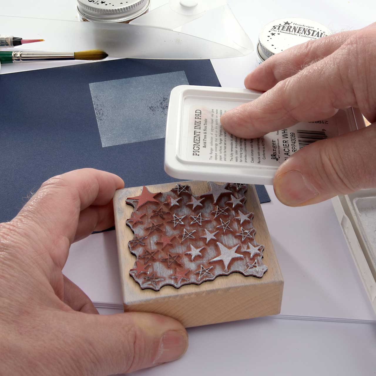 Stempeln Sie das Sterne Motiv mit dem weißen Pigment-Stempelkissen auf das zuvor gestempelte weiße Quadrat.