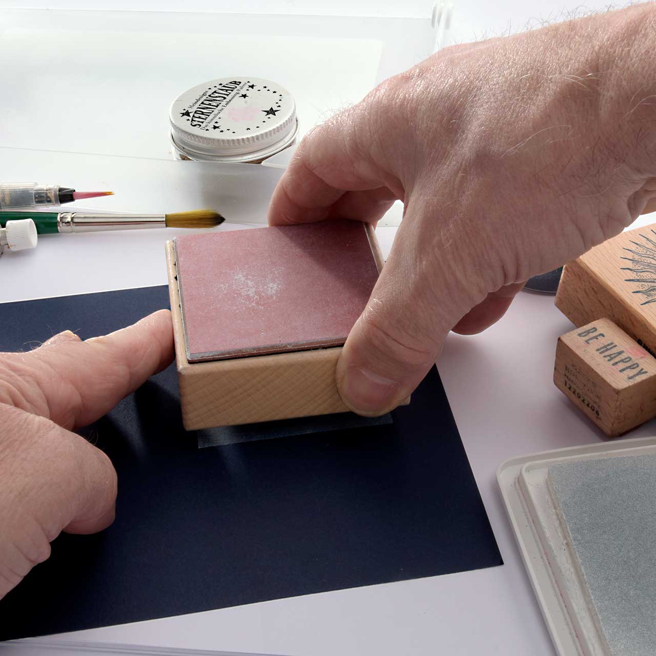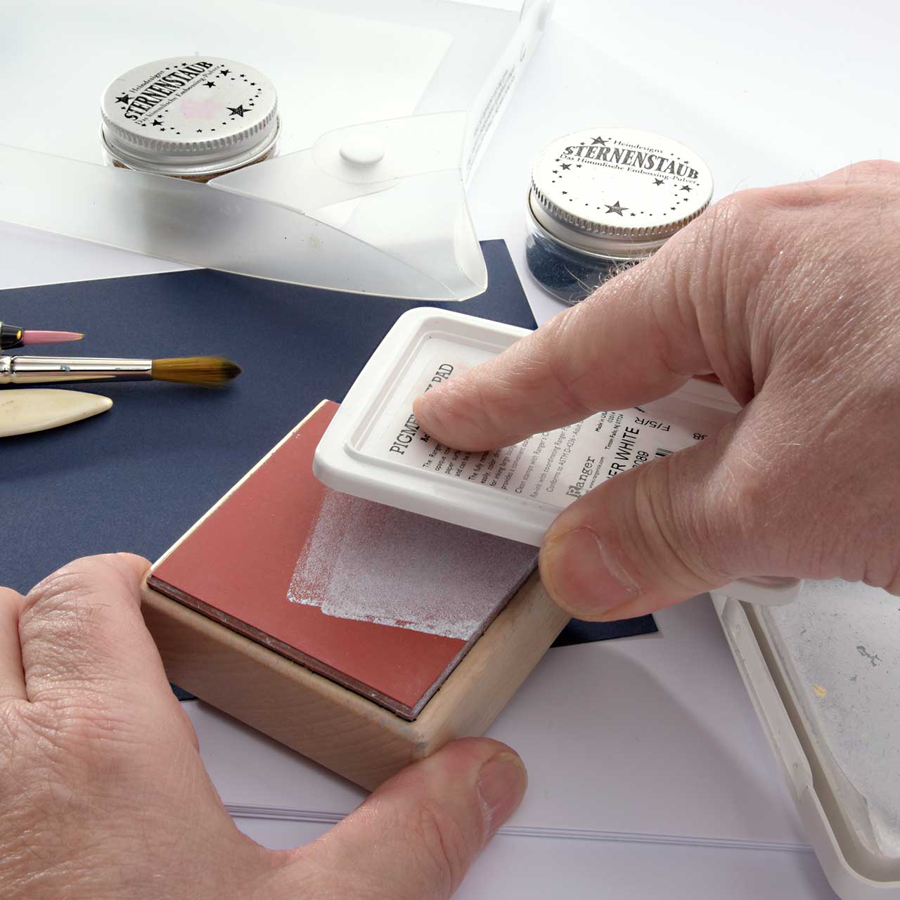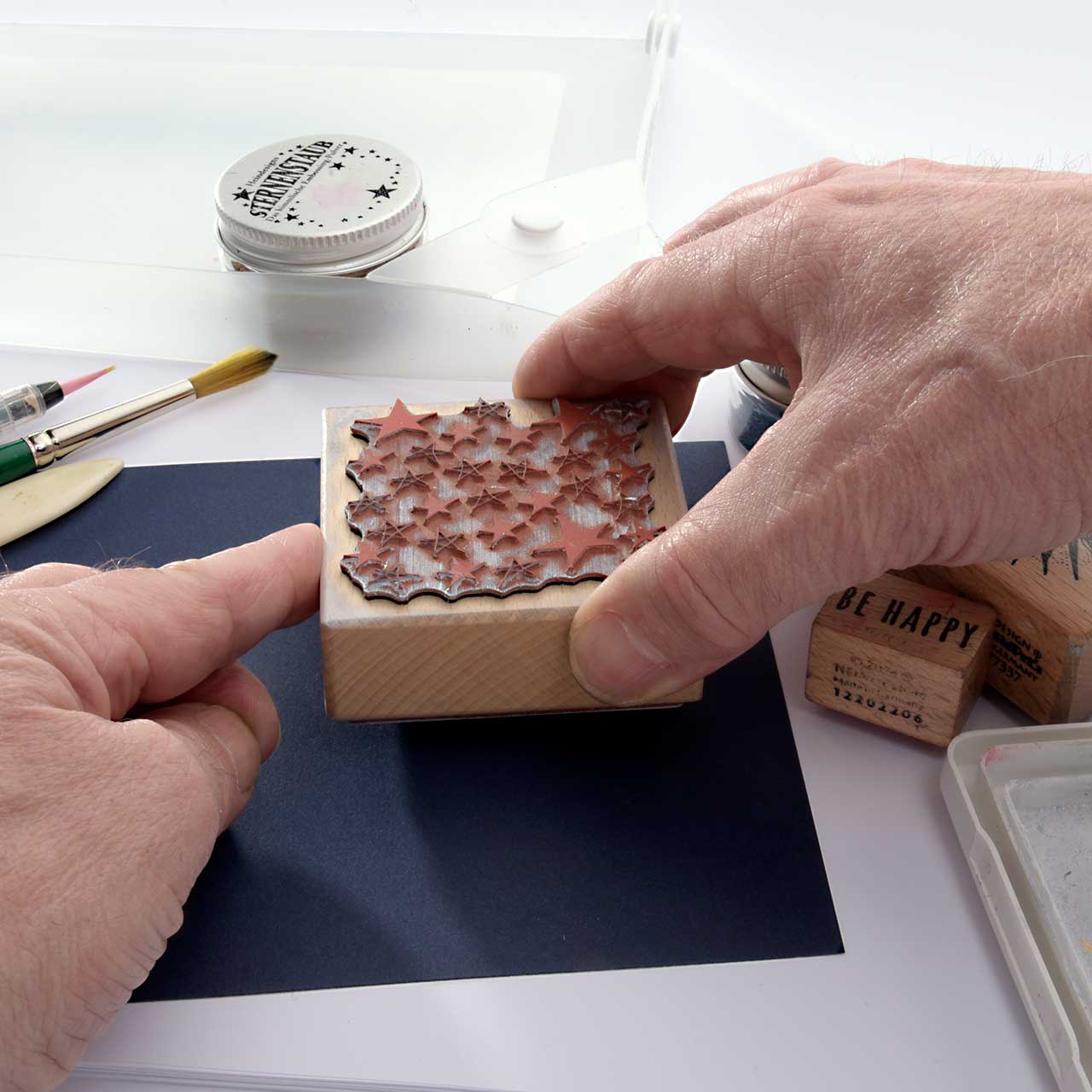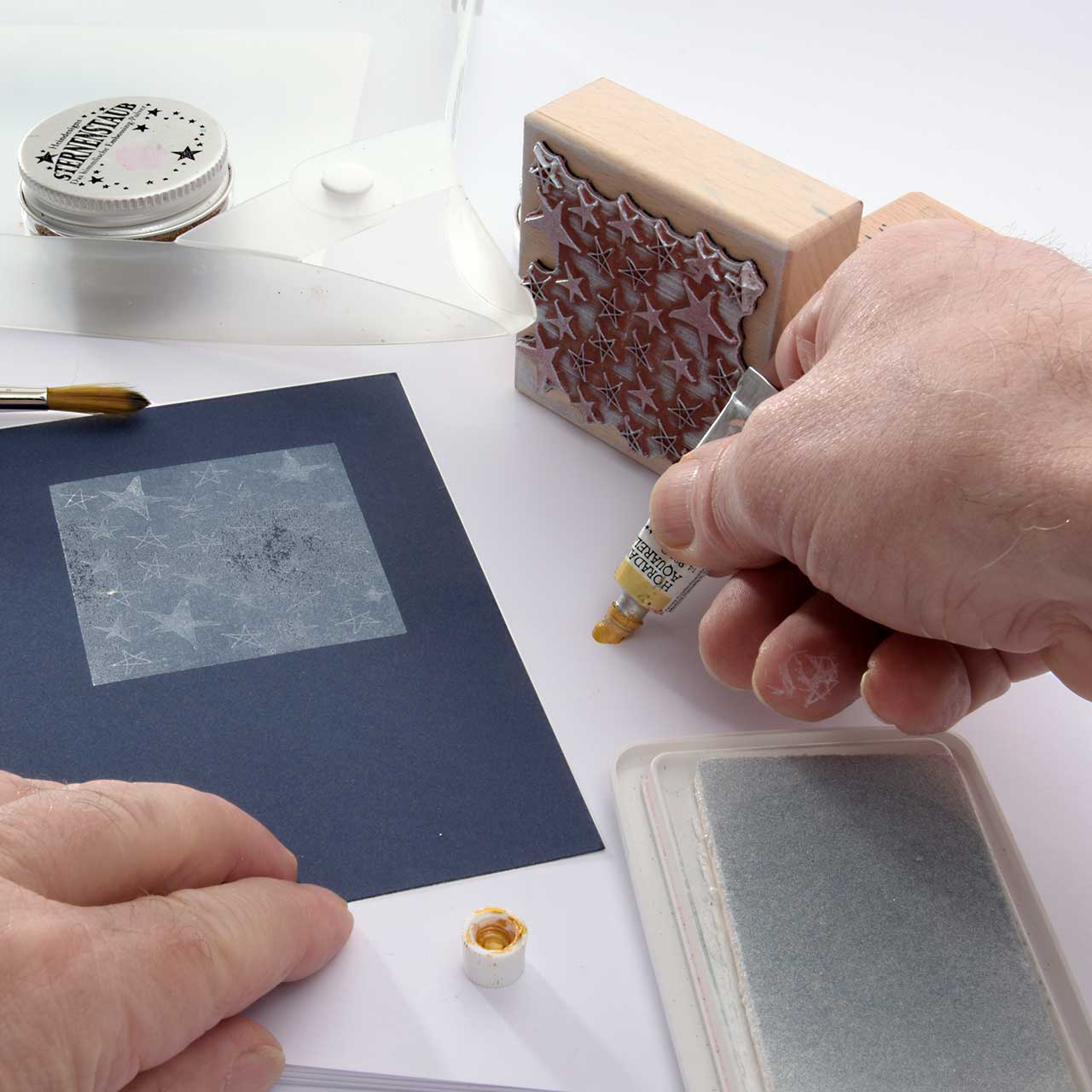 Stempeln Sie das Sterne Motiv mit dem weißen Pigment-Stempelkissen auf das zuvor gestempelte weiße Quadrat.