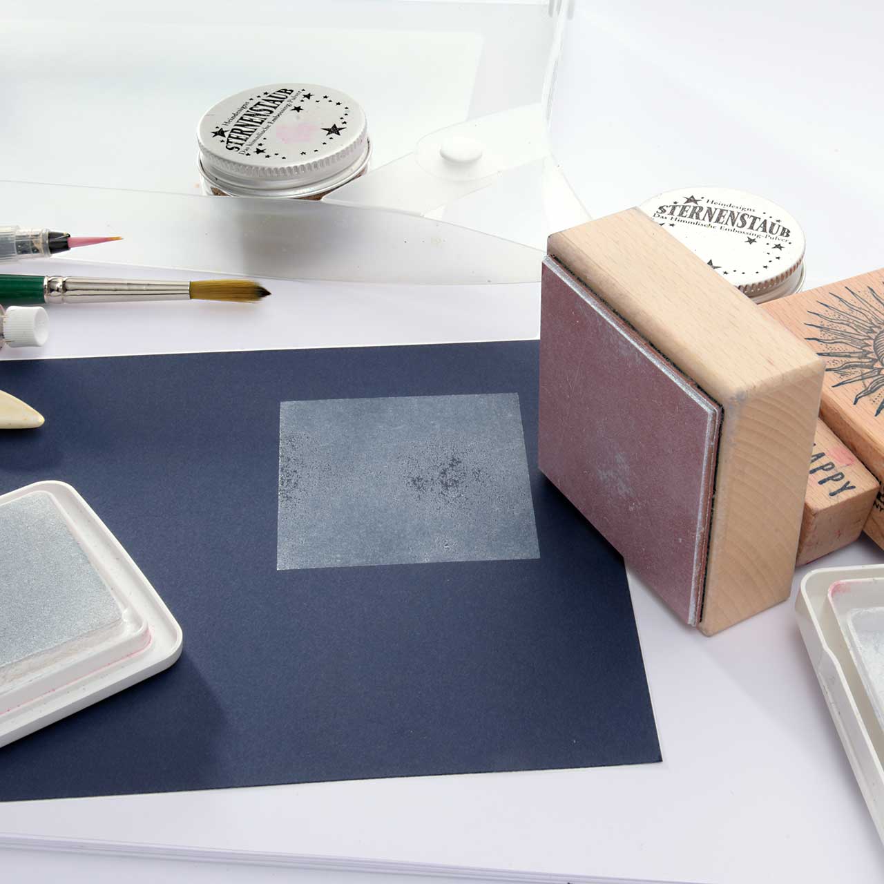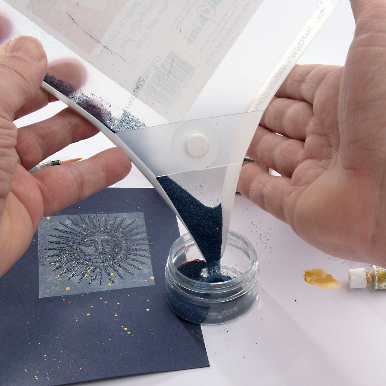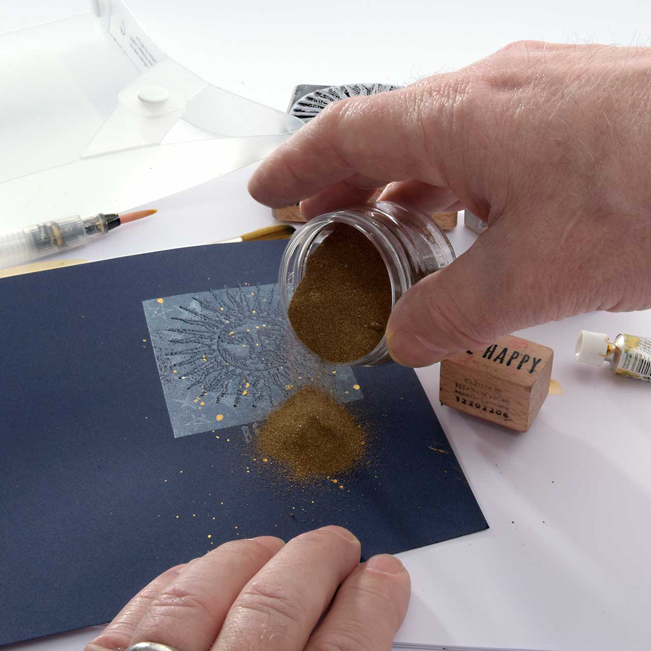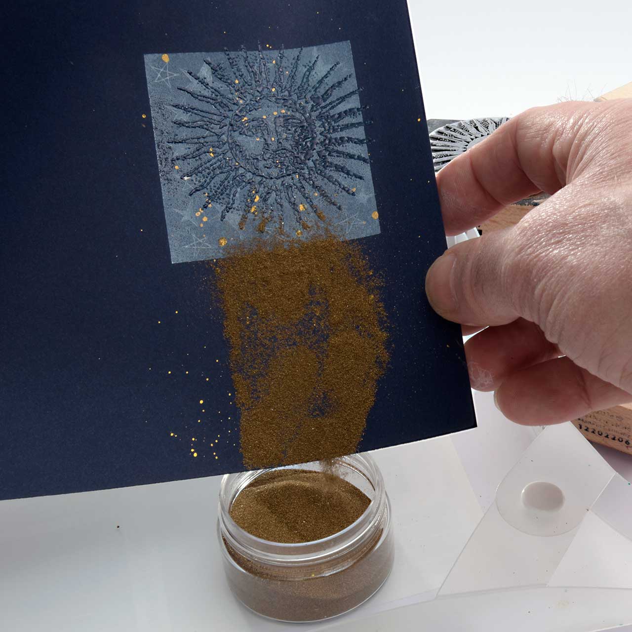 Stempeln Sie das Sonnen Motiv mit dem weißen Pigment-Stempelkissen auf die quadratische Fläche und streuen reichlich dunkelblauen Sternenstaub auf den Abdruck. Schütten Sie das überschüssige Pulver über dem SnappyTray ab und erhitzen Sie den Abdruck mit dem Heißluftgerät.