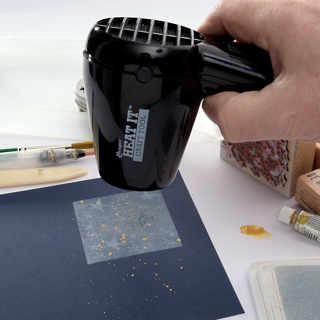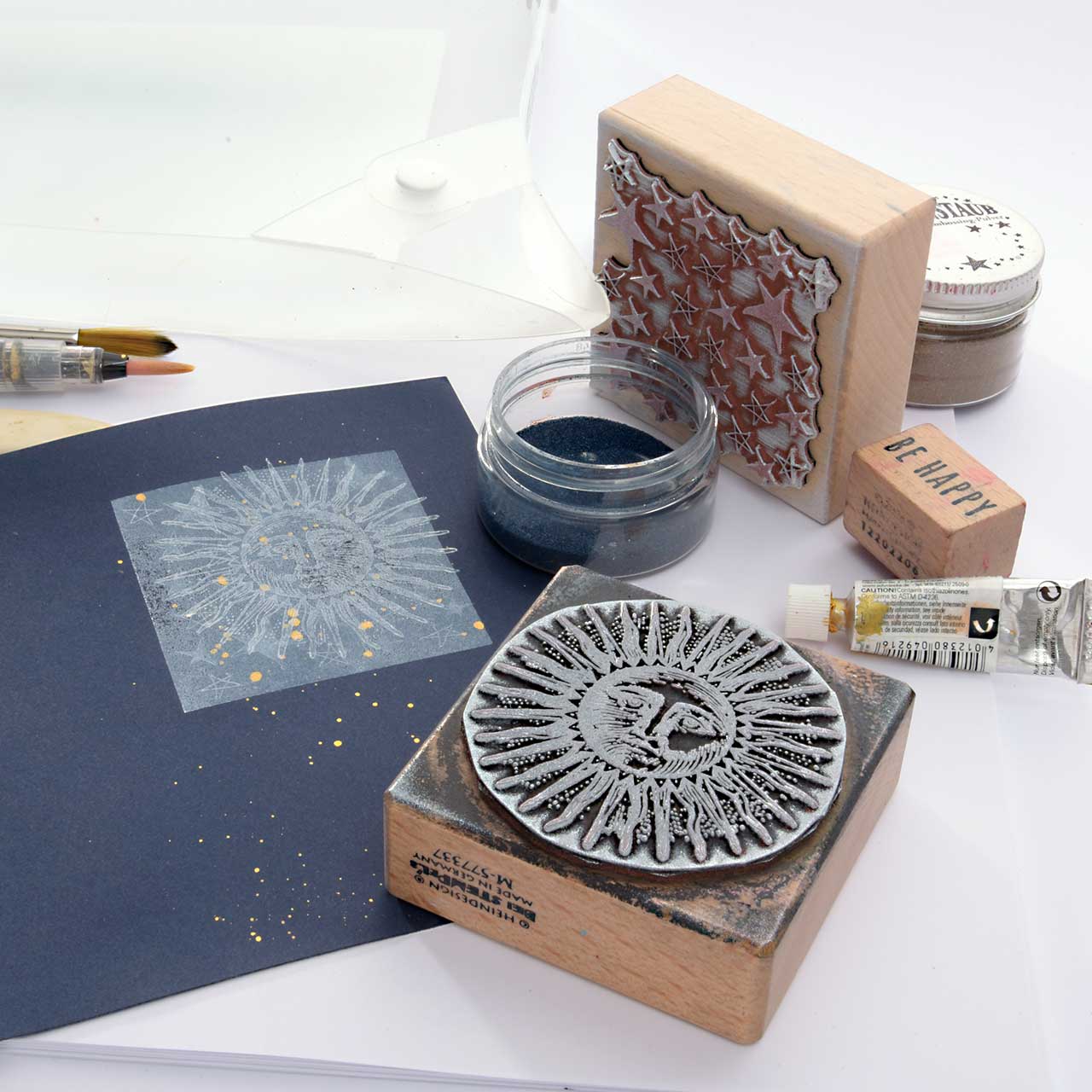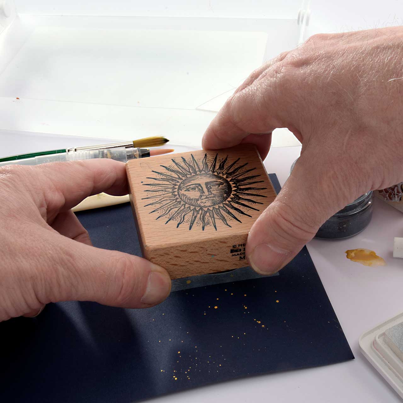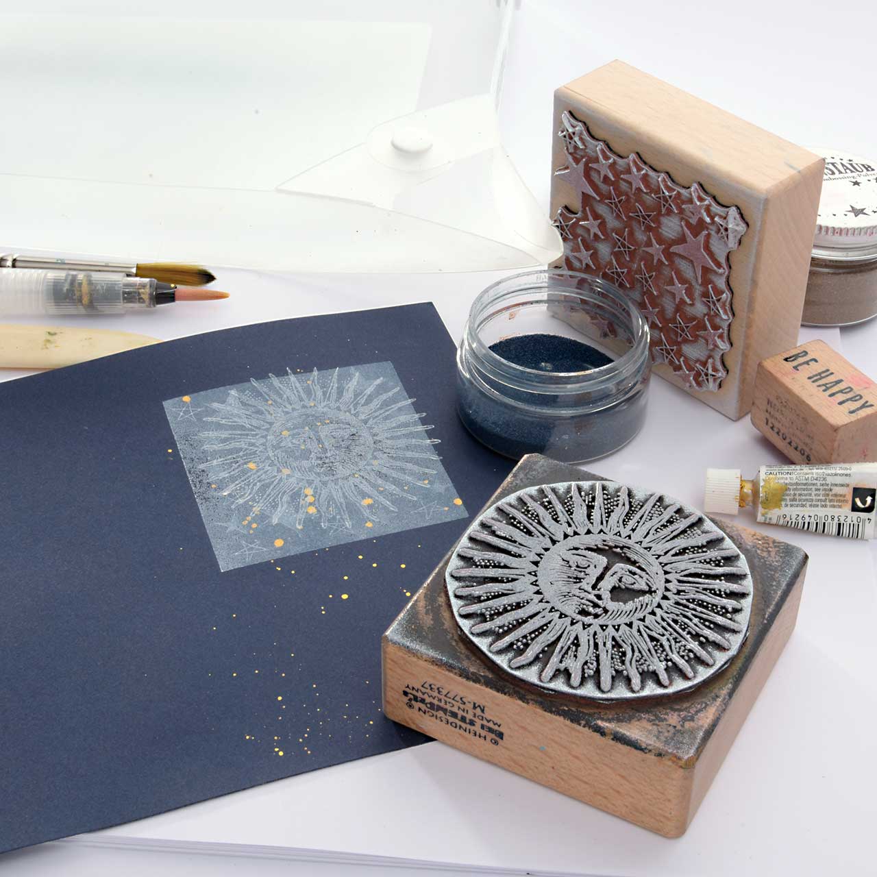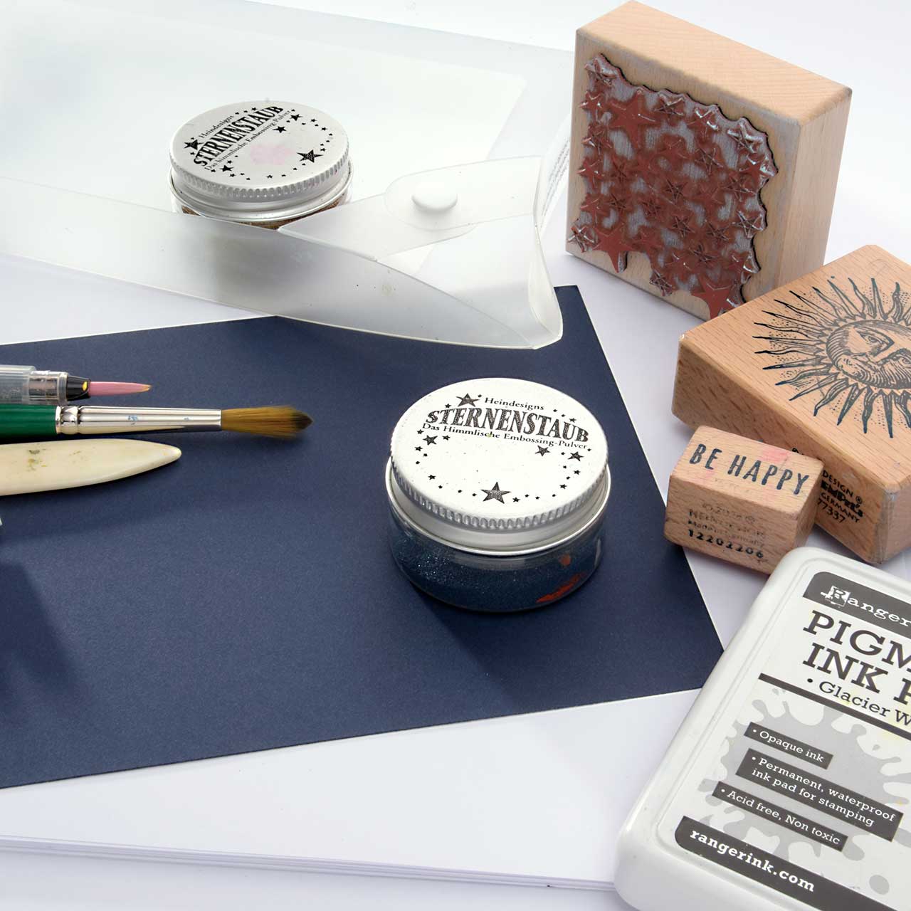 Stempeln Sie das Sonnen Motiv mit dem weißen Pigment-Stempelkissen auf die quadratische Fläche und streuen reichlich dunkelblauen Sternenstaub auf den Abdruck. Schütten Sie das überschüssige Pulver über dem SnappyTray ab und erhitzen Sie den Abdruck mit dem Heißluftgerät.