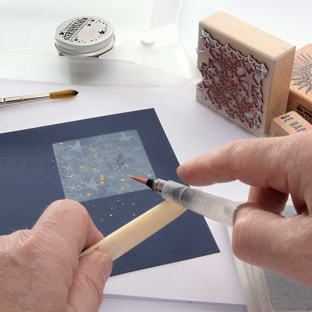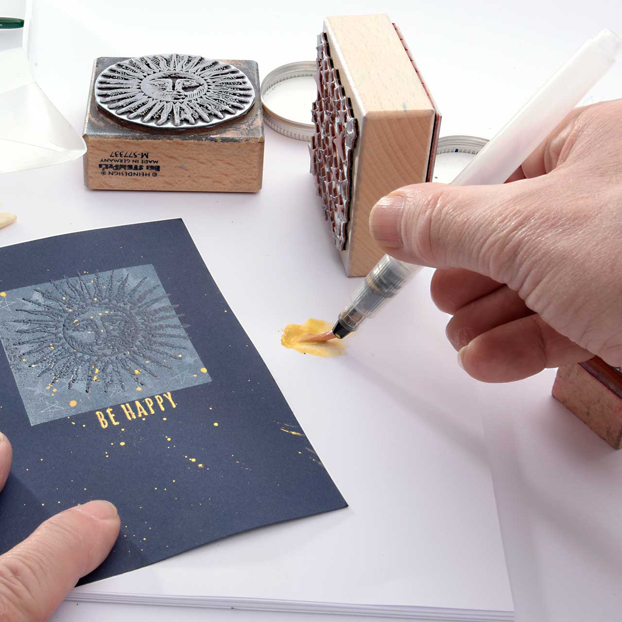 Nehmen Sie mit dem Füllerpinsel goldene Aquarellfarbe auf und klecksen Sie einige Sprenkel auf Ihre Karte.