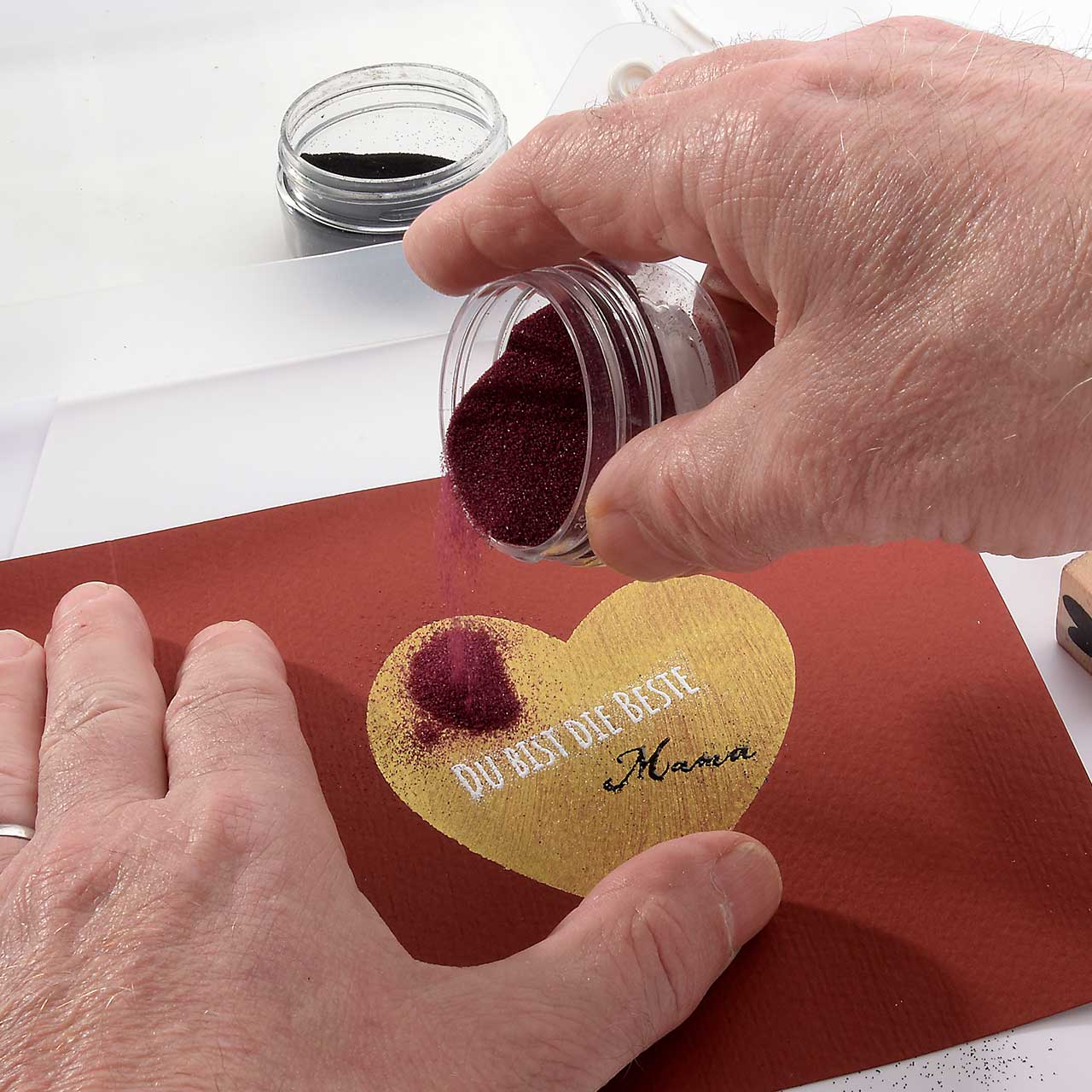 Mit Embossing können Sie Stempel-Motive haltbar auf die unterschiedlichsten Materialien auftragen. Neben Papier und Karton, können Sie auch Metall, Holz, Textilien und Kunststoff mit Sternenstaub verzieren. Dabei müssen Sie nur darauf achten, dass Ihr Material auch die Hitze des Embossing Prozesses verträgt.