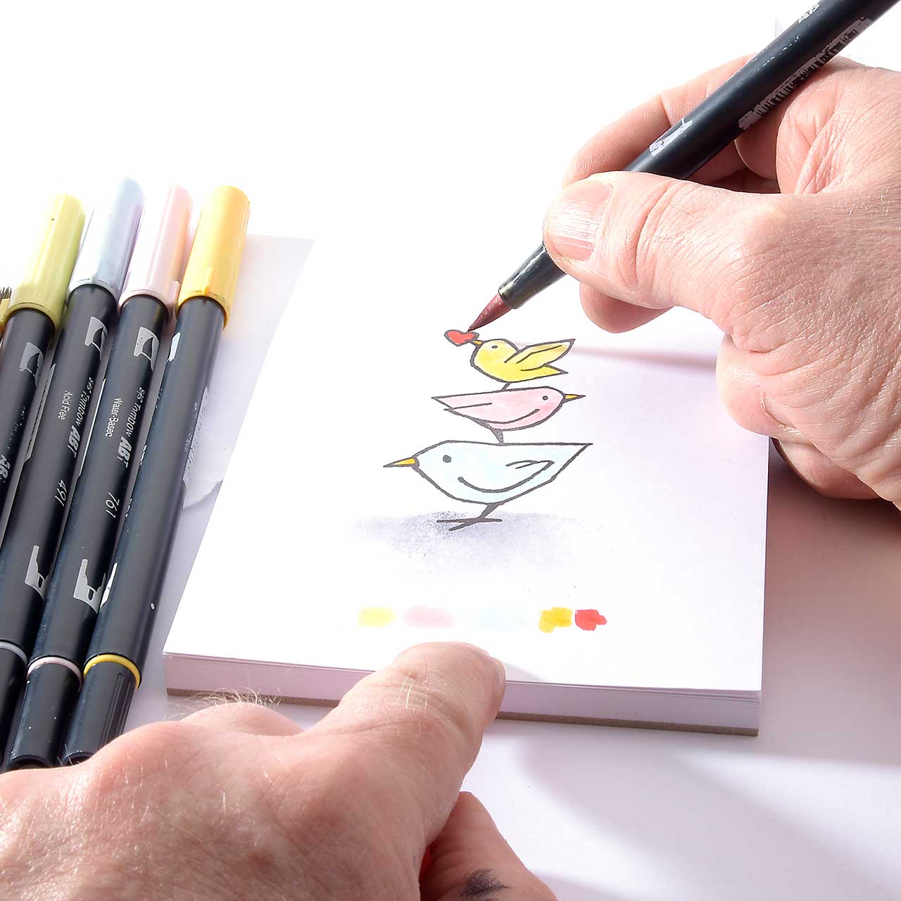 Das Papier ist besonders auf die Tombow Dual Brushpen Faserschreiber abgestimmt. Es nimmt die Farbe der Faserschreiber sehr gut an und Sie können diese prima mit einem nassen Pinsel vermalen.