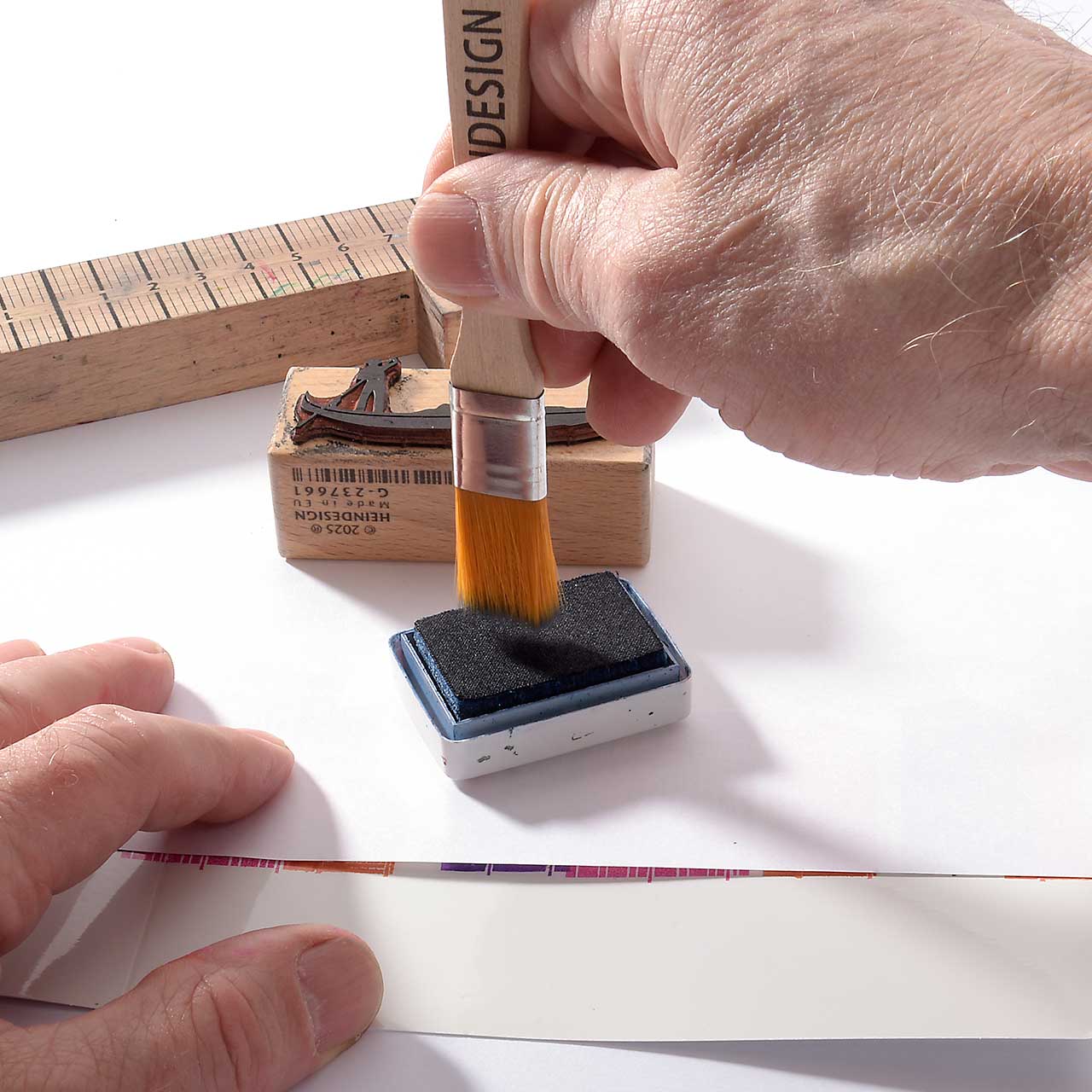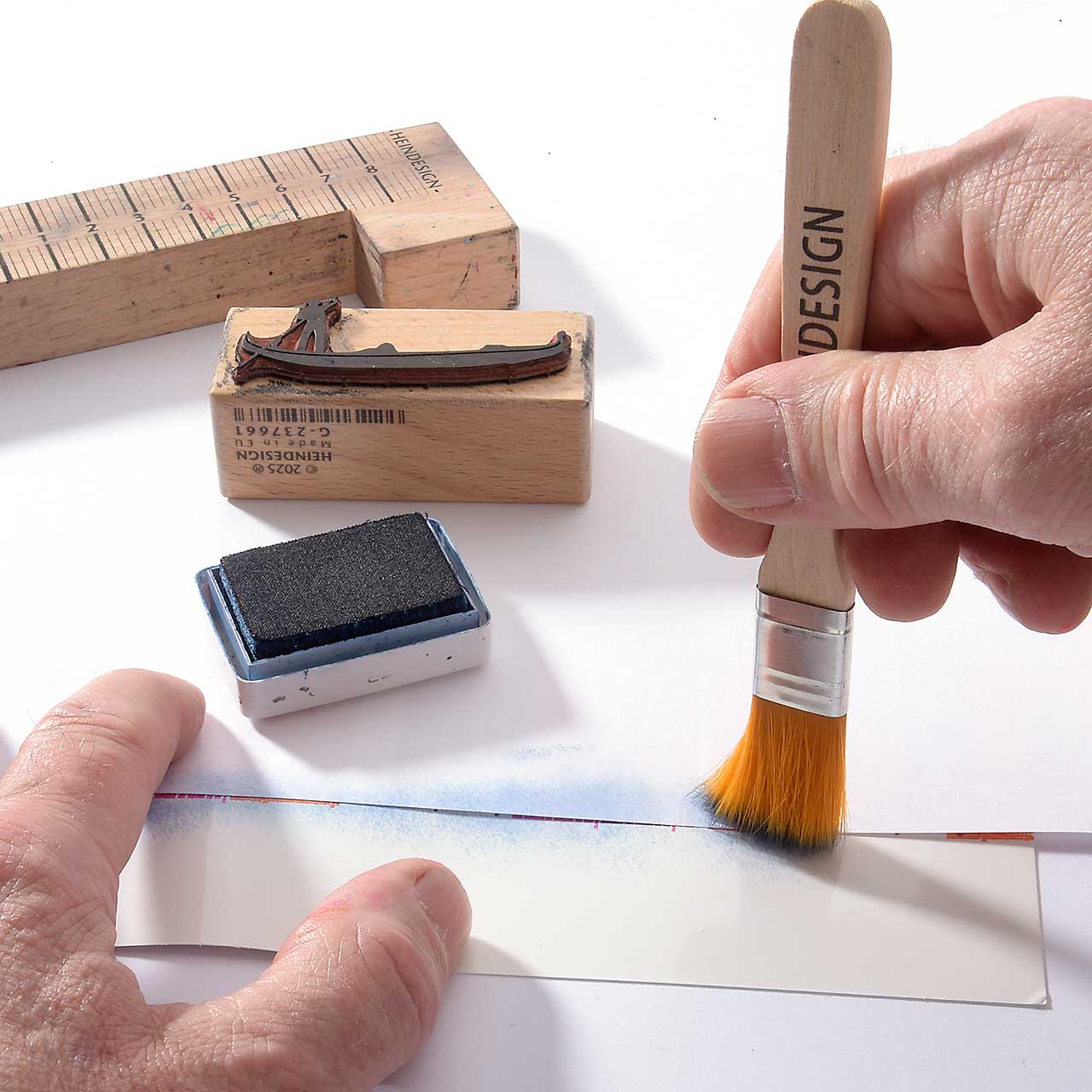 Nehmen Sie mit dem Flachpinsel dunkelblaue Farbe aus dem Stempelkissen auf und tupfen Sie den Pinsel entlang der Papierkante.