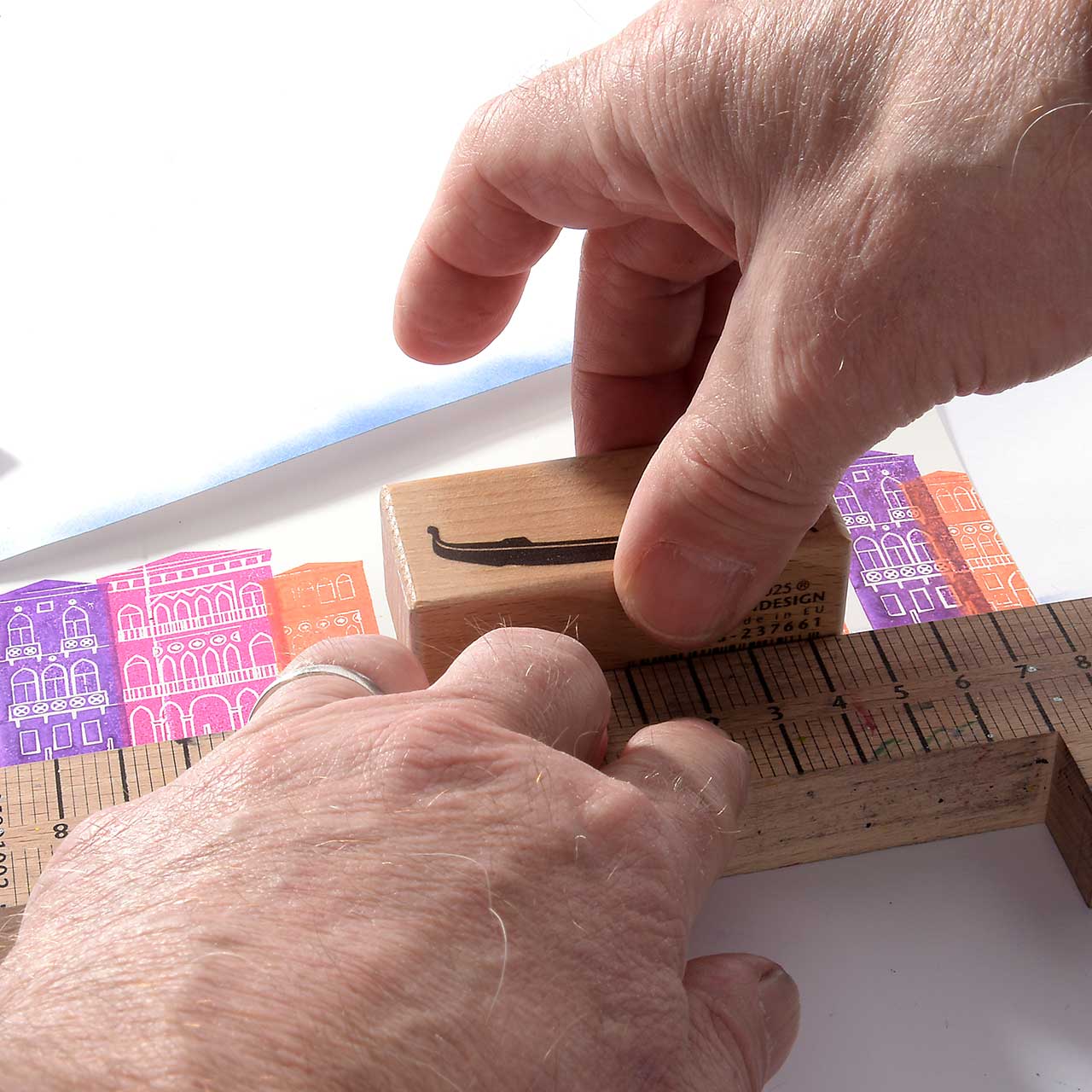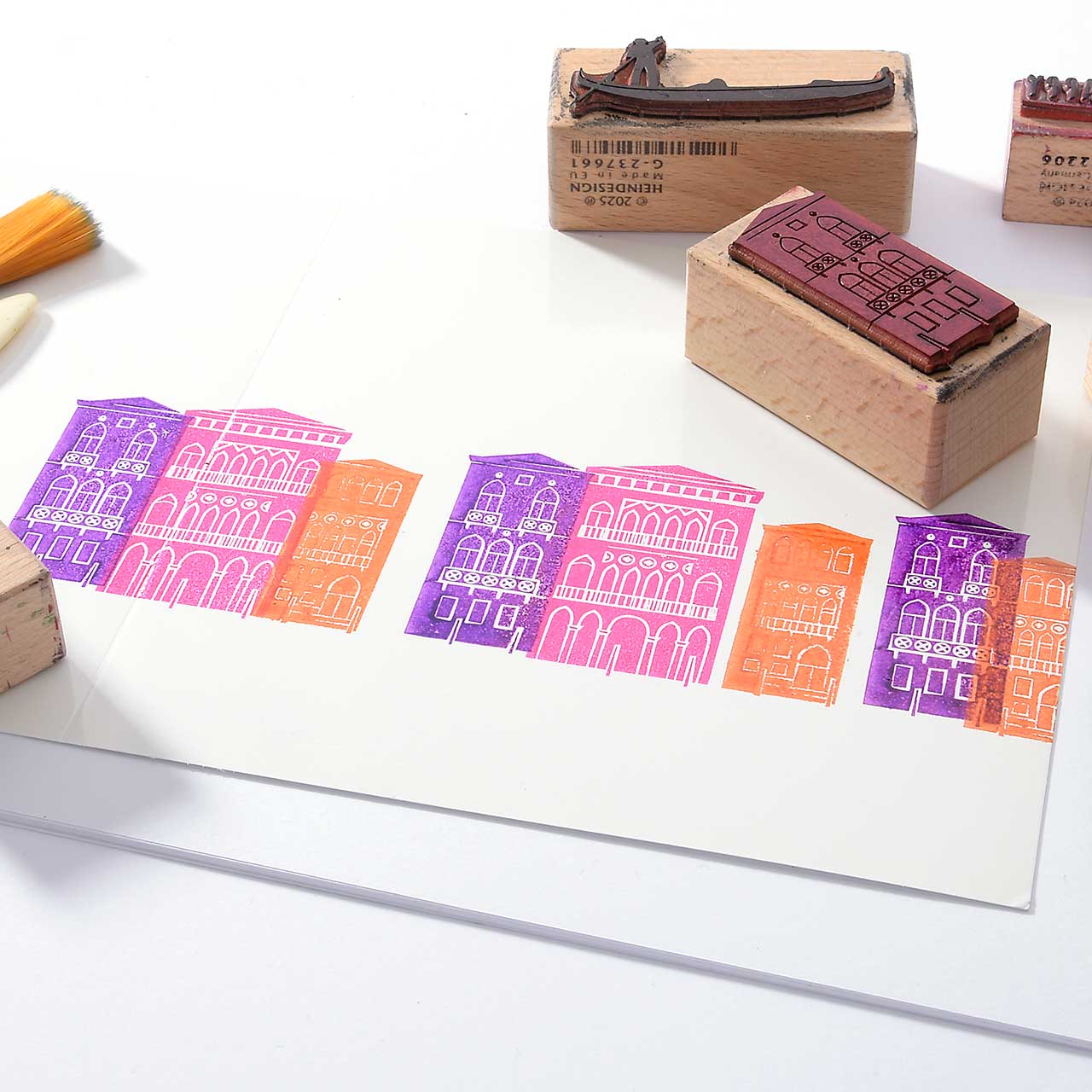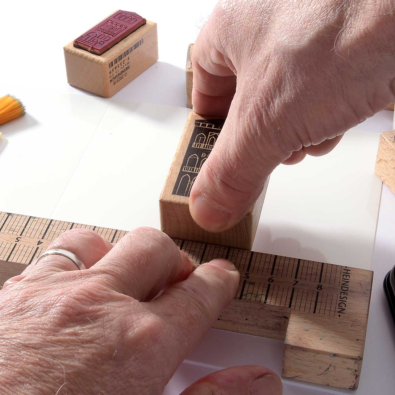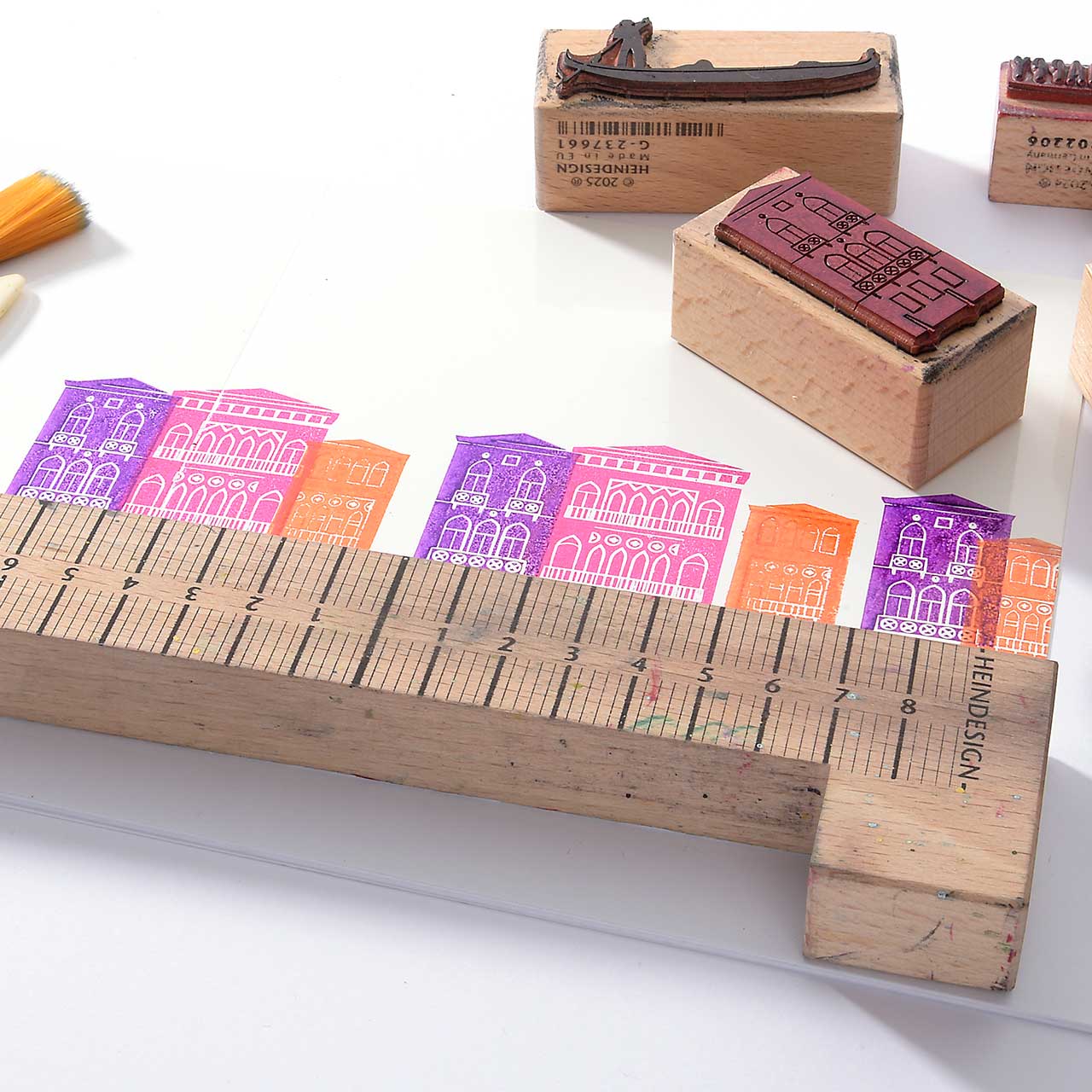 Damit die Häuser schön in einer Reihe stehen, stempeln Sie sie entlang des Stempelanlegewinkels. Das hilft auch gegen das versehentliche Verrutschen.