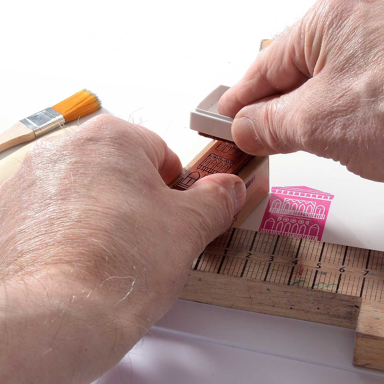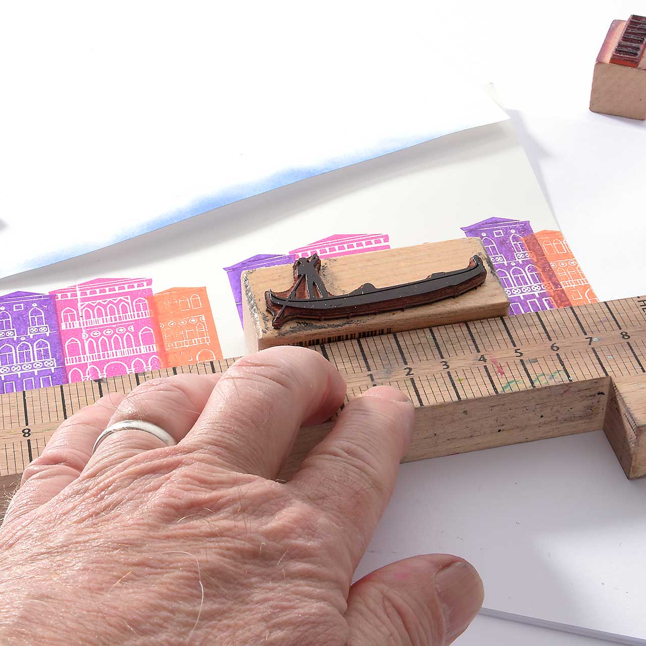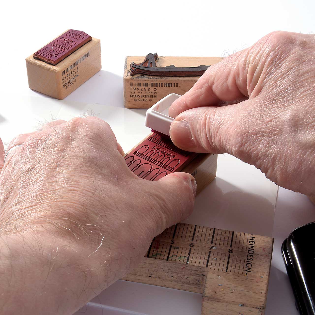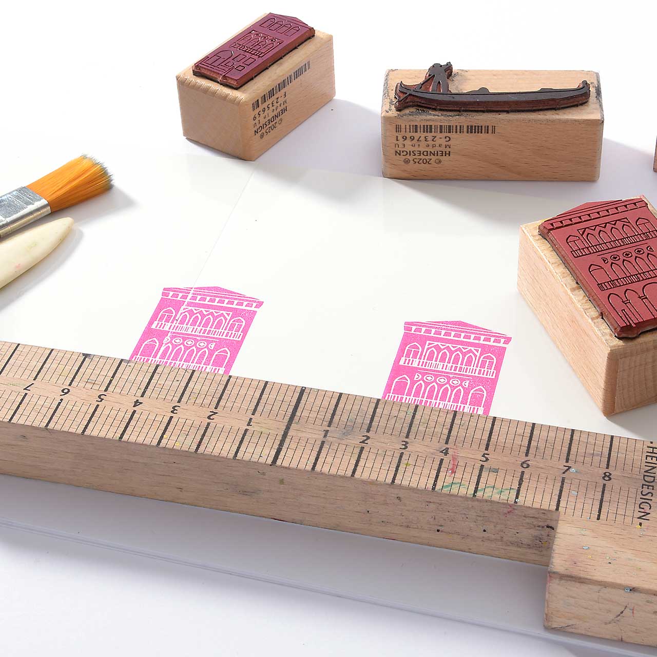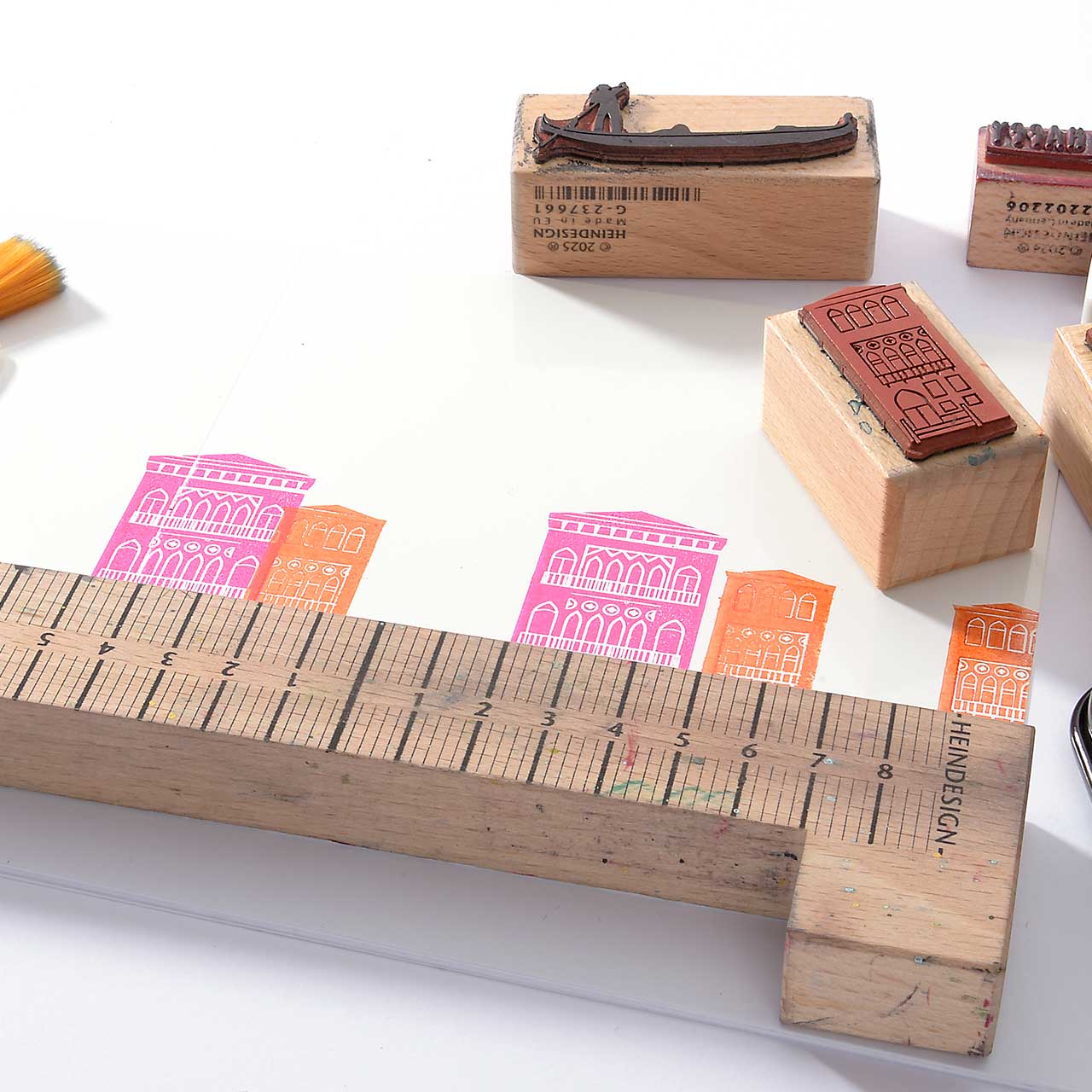 Damit die Häuser schön in einer Reihe stehen, stempeln Sie sie entlang des Stempelanlegewinkels. Das hilft auch gegen das versehentliche Verrutschen.