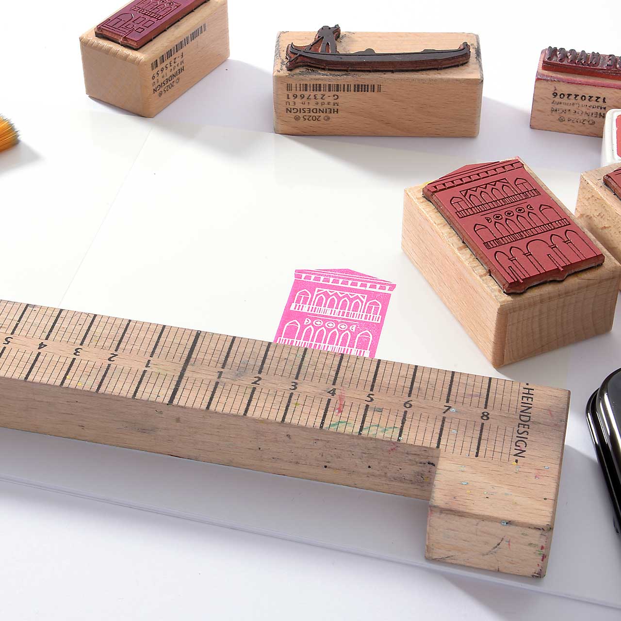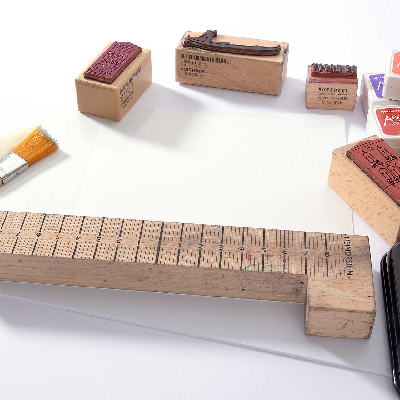Legen Sie den Stempelanlegewinkel an die unter Kante ihrer Karte an. Das gibt auf der Karte die richtige Höhe, der Häuserzeile.