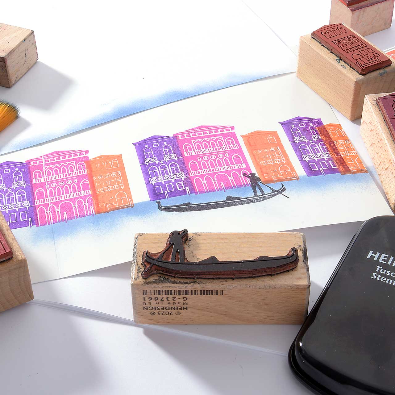 Stempeln Sie das Gondoliere Motiv mit dem schwarzen Stempelkissen in die untere Mitte ihrer Karte.