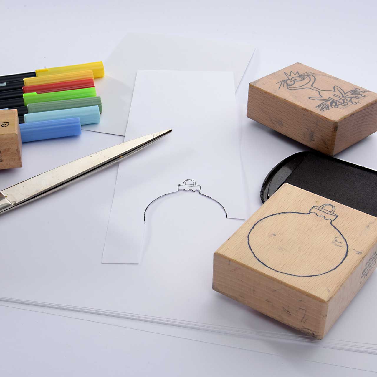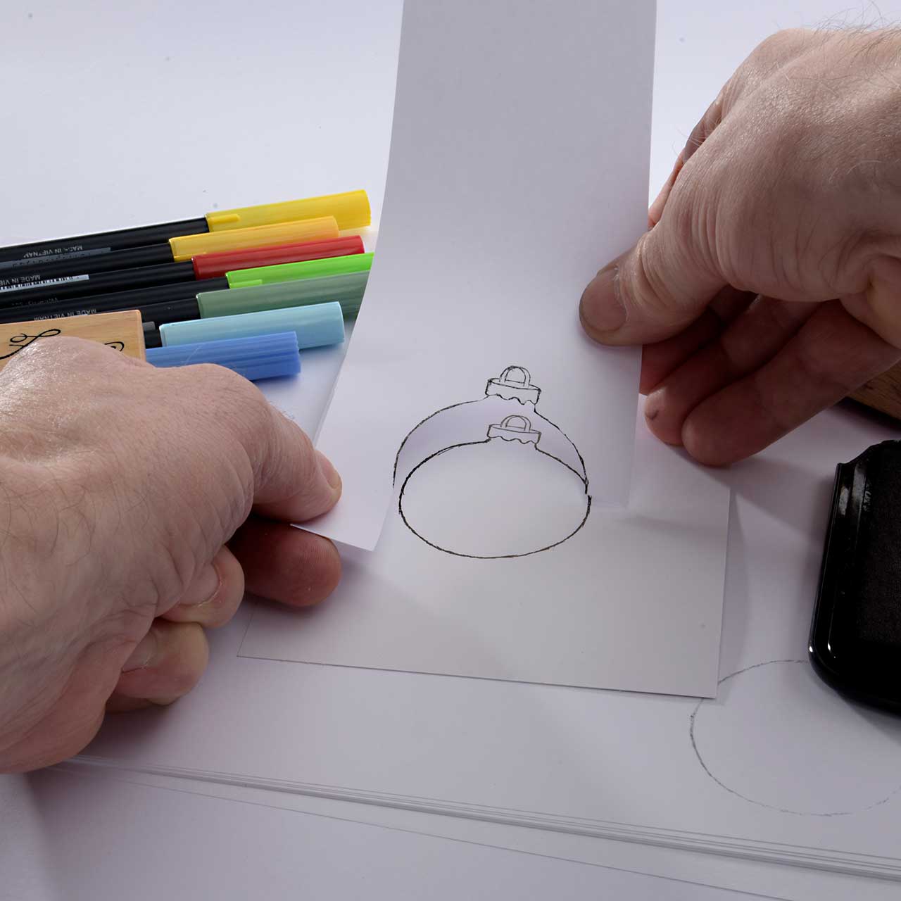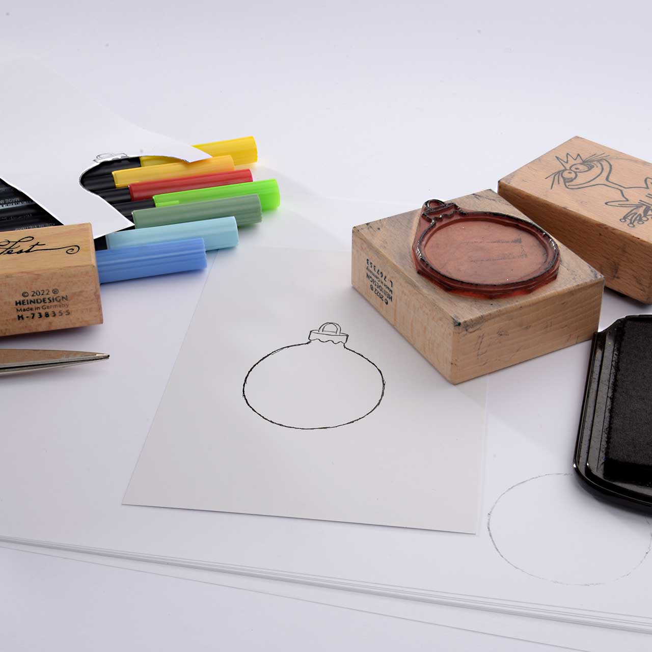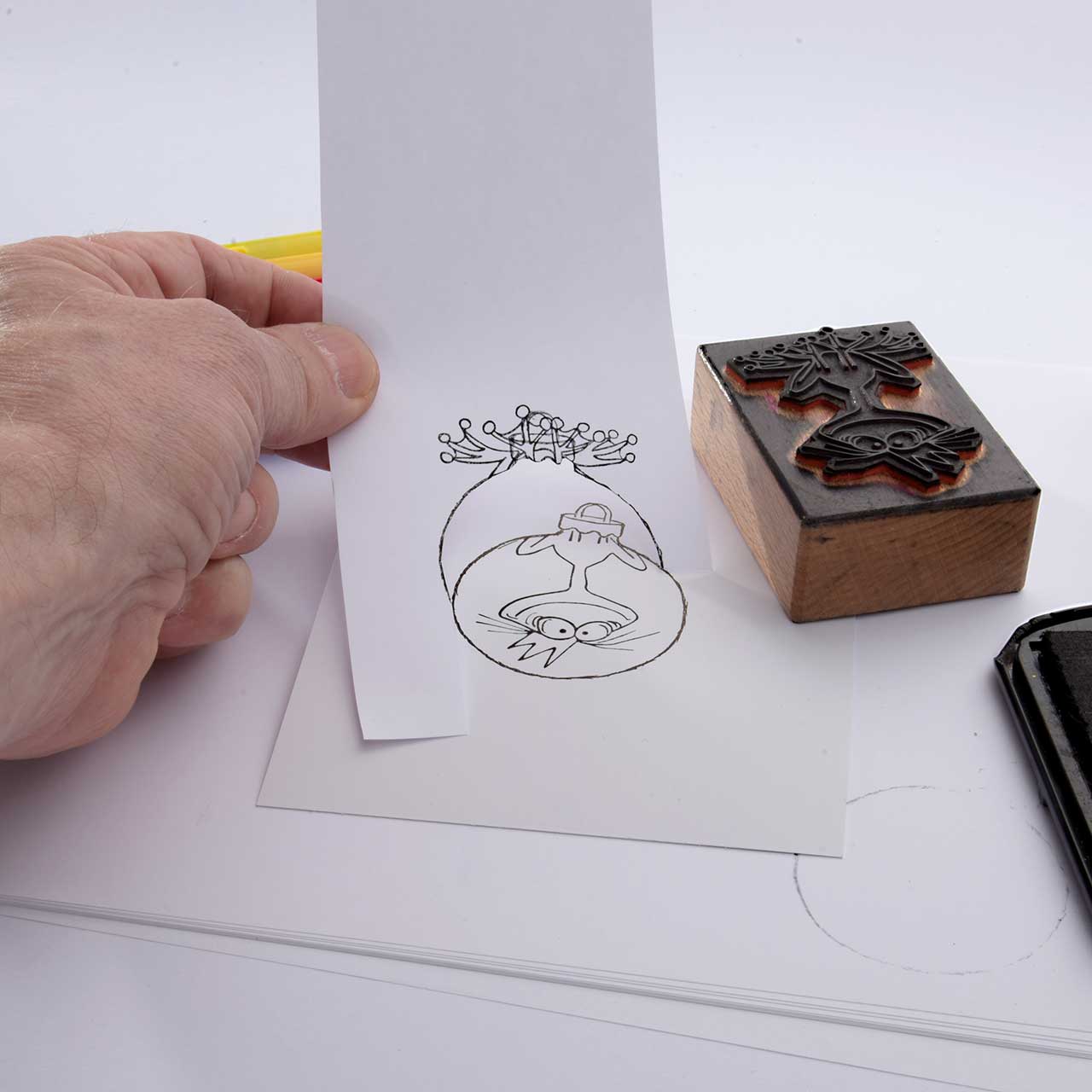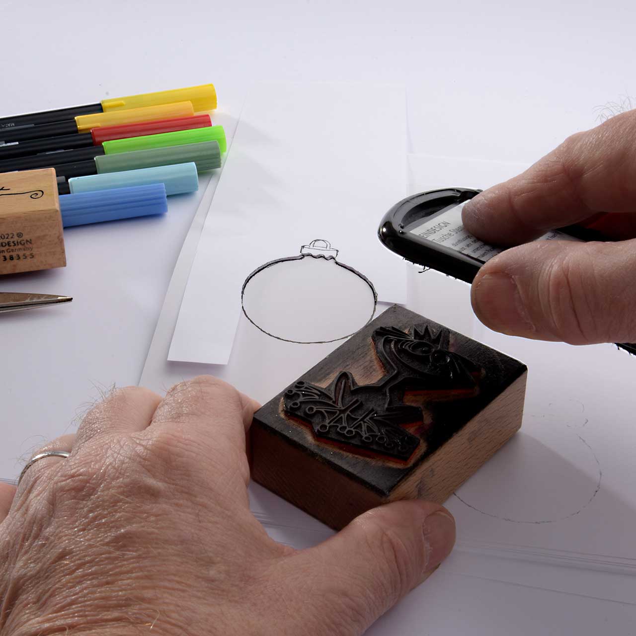Stempeln Sie das Christbaumkugel Motiv mit dem schwarzen Stempelkissen auf ein Stück Papier.