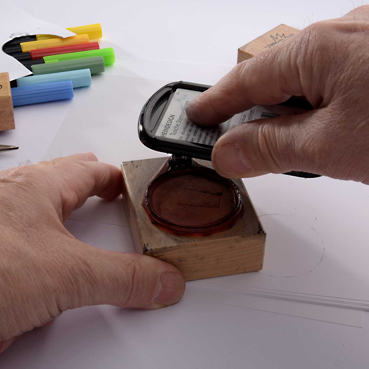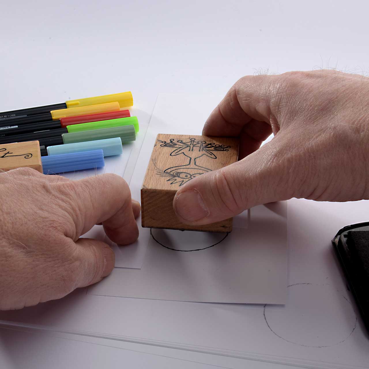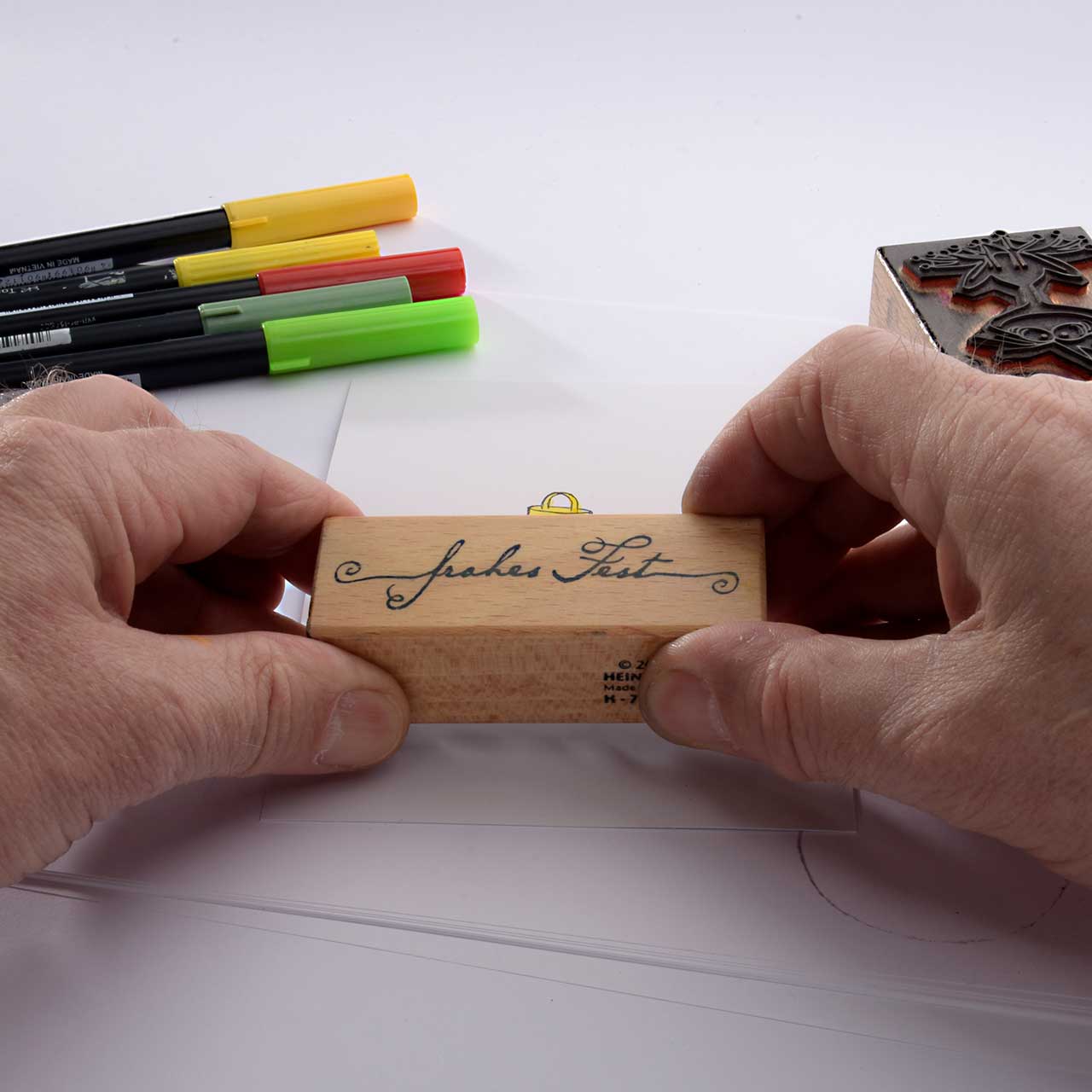 Lassen Sie die Farbe besonders gut trocknen. Denn die nasse Stempelfarbe kann mit den Faserschreibern verschmieren.