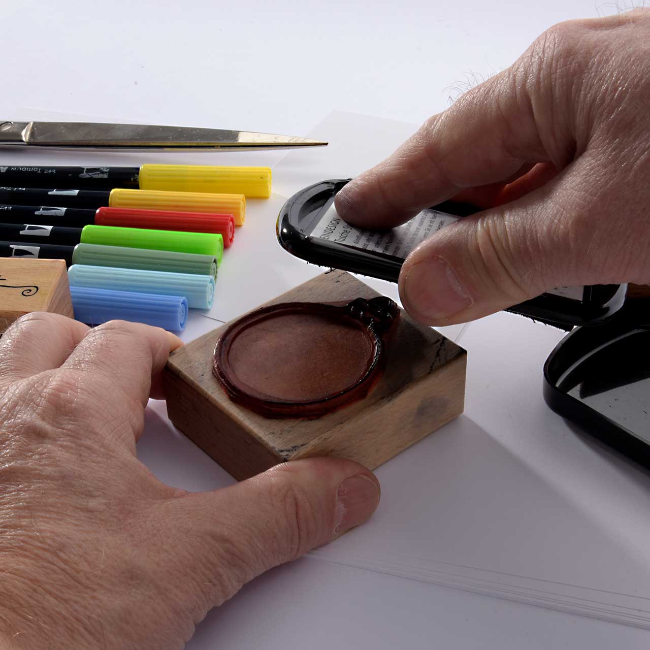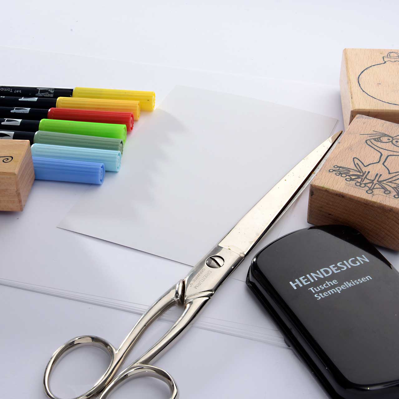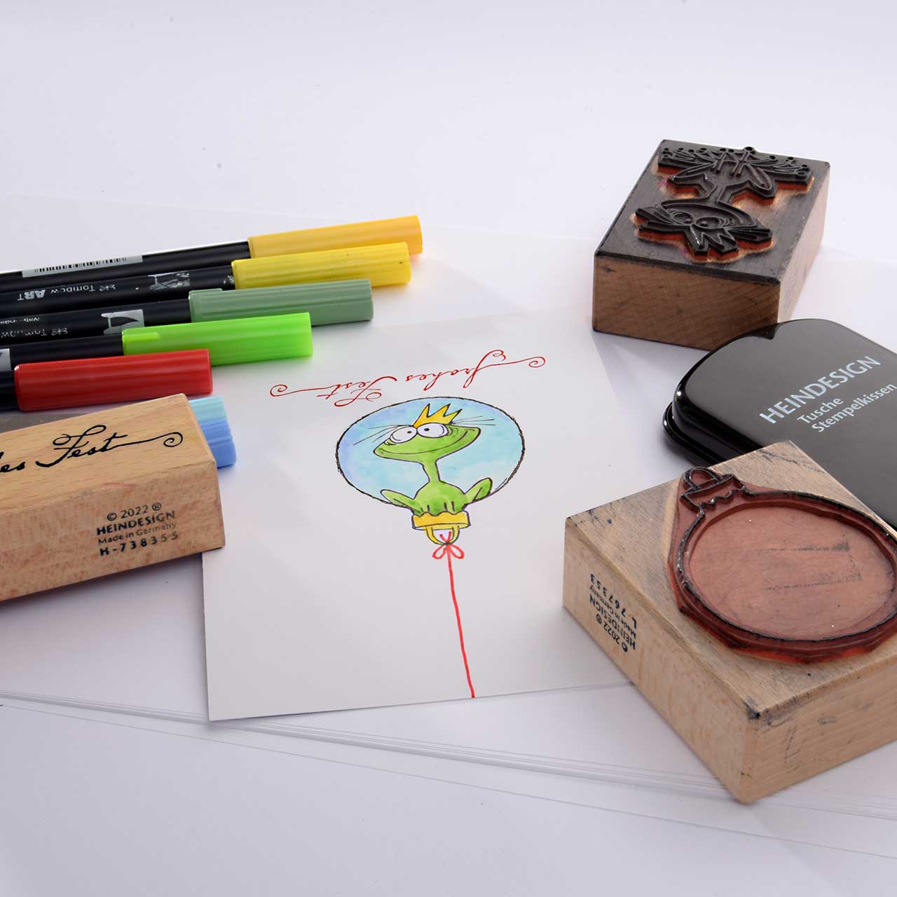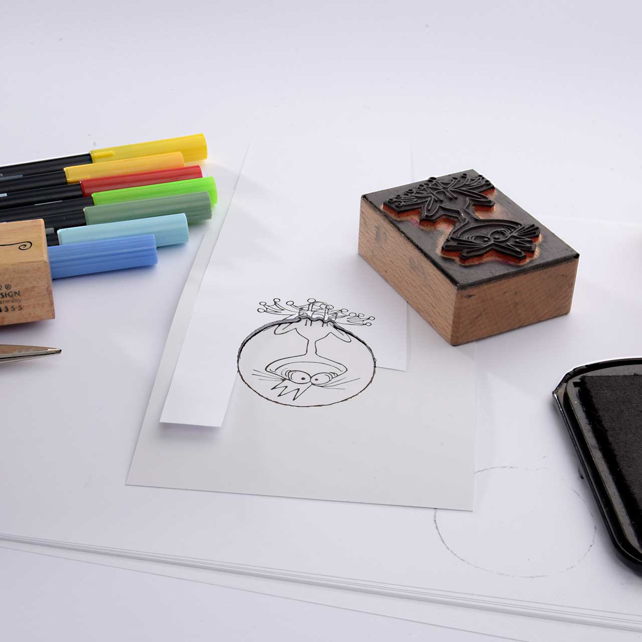 Lassen Sie die Farbe besonders gut trocknen. Denn die nasse Stempelfarbe kann mit den Faserschreibern verschmieren.