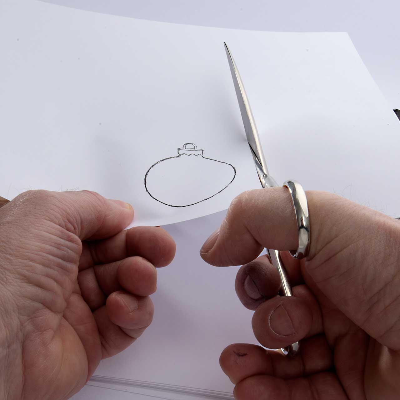 Schneiden Sie den Innenteil des Christbaumkugel Motivs aus dem Papier aus. Es soll nur der obere Teil des Kugel Motivs übrig bleiben.