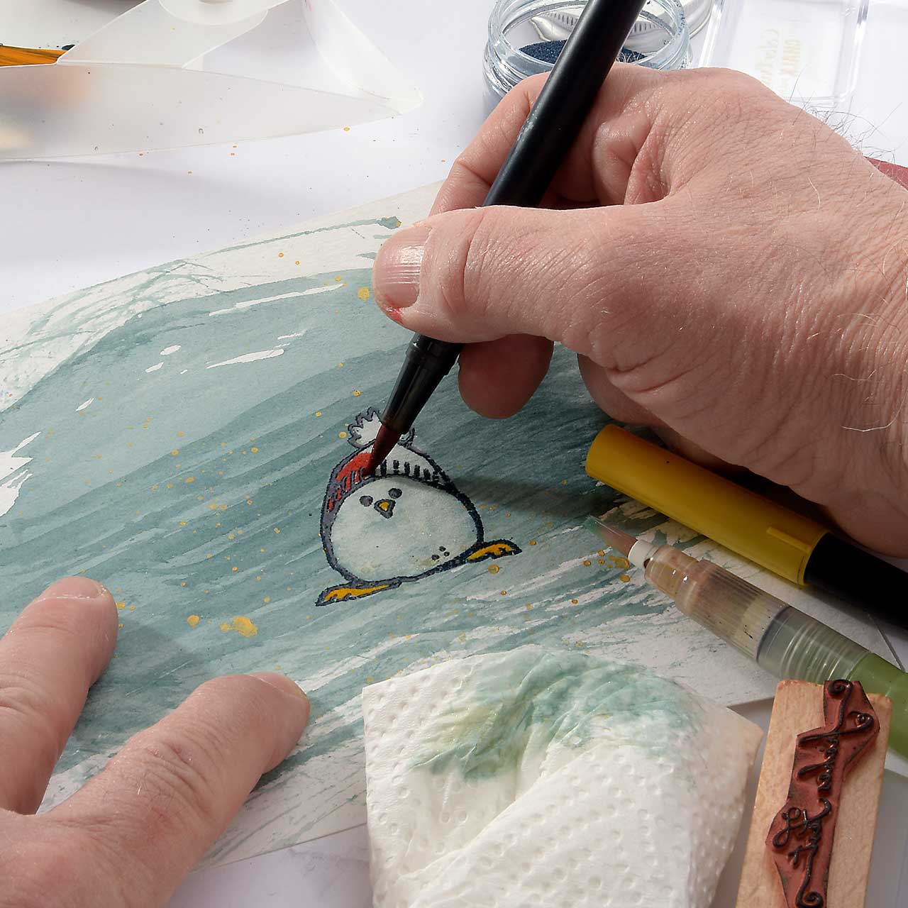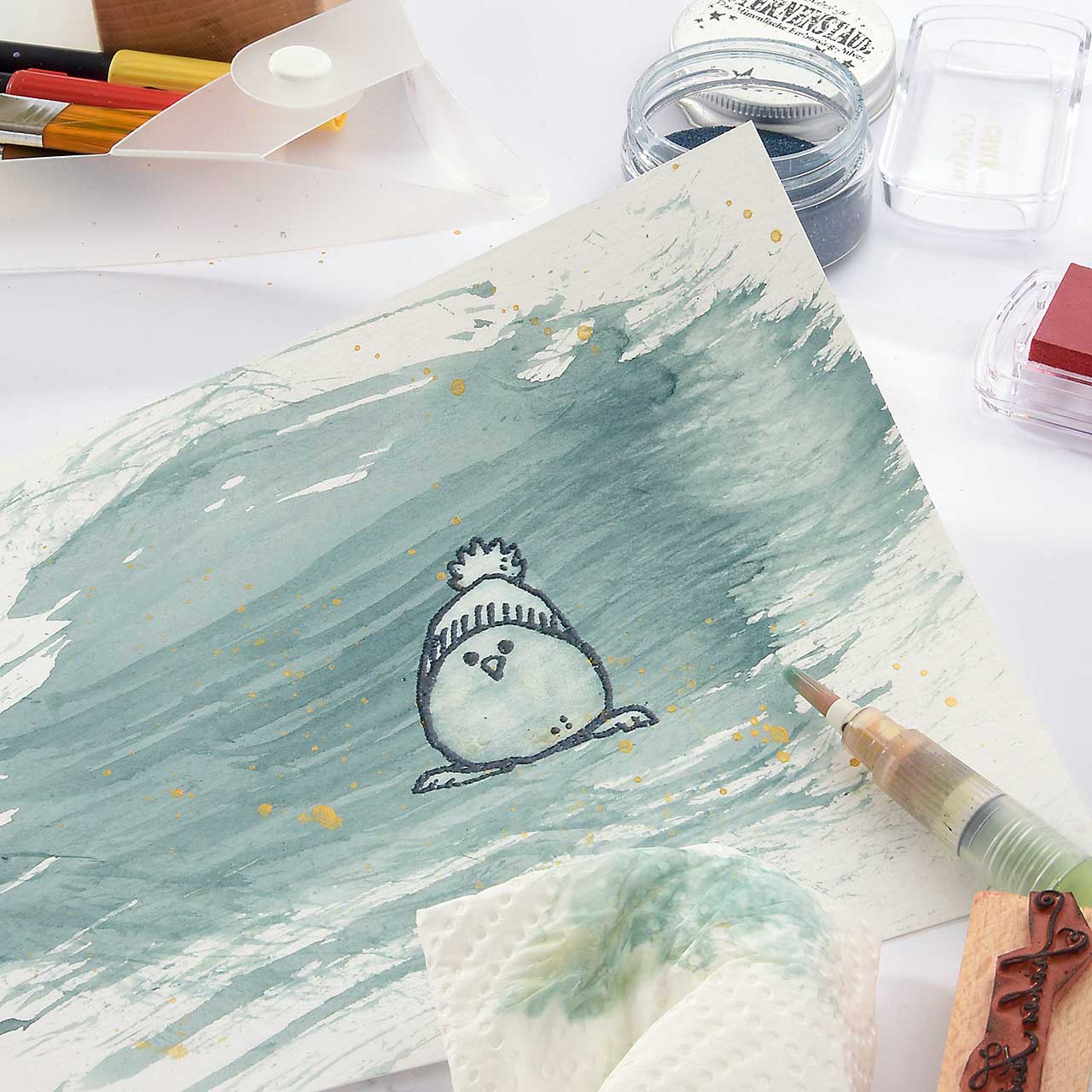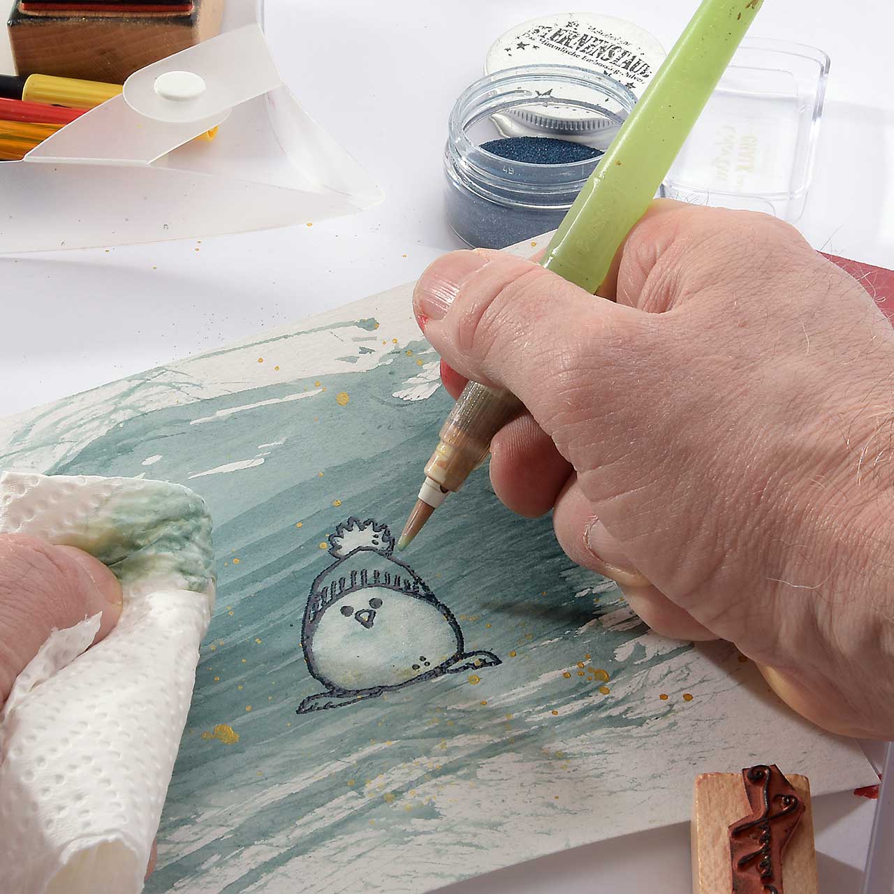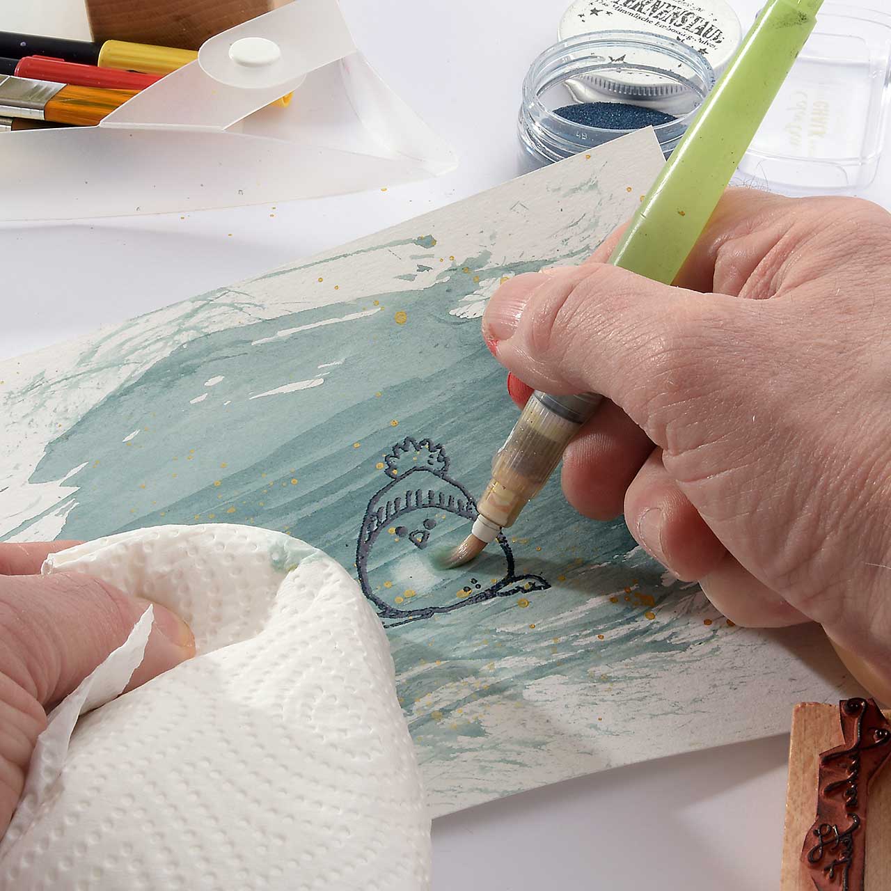 Damit das Winterküken Motiv weiß wird und sich schön vom Hintergrund abhebt, nehmen Sie mit einem nassen Pinsel Farbe aus den hellen Bereichern des Motivs ab.