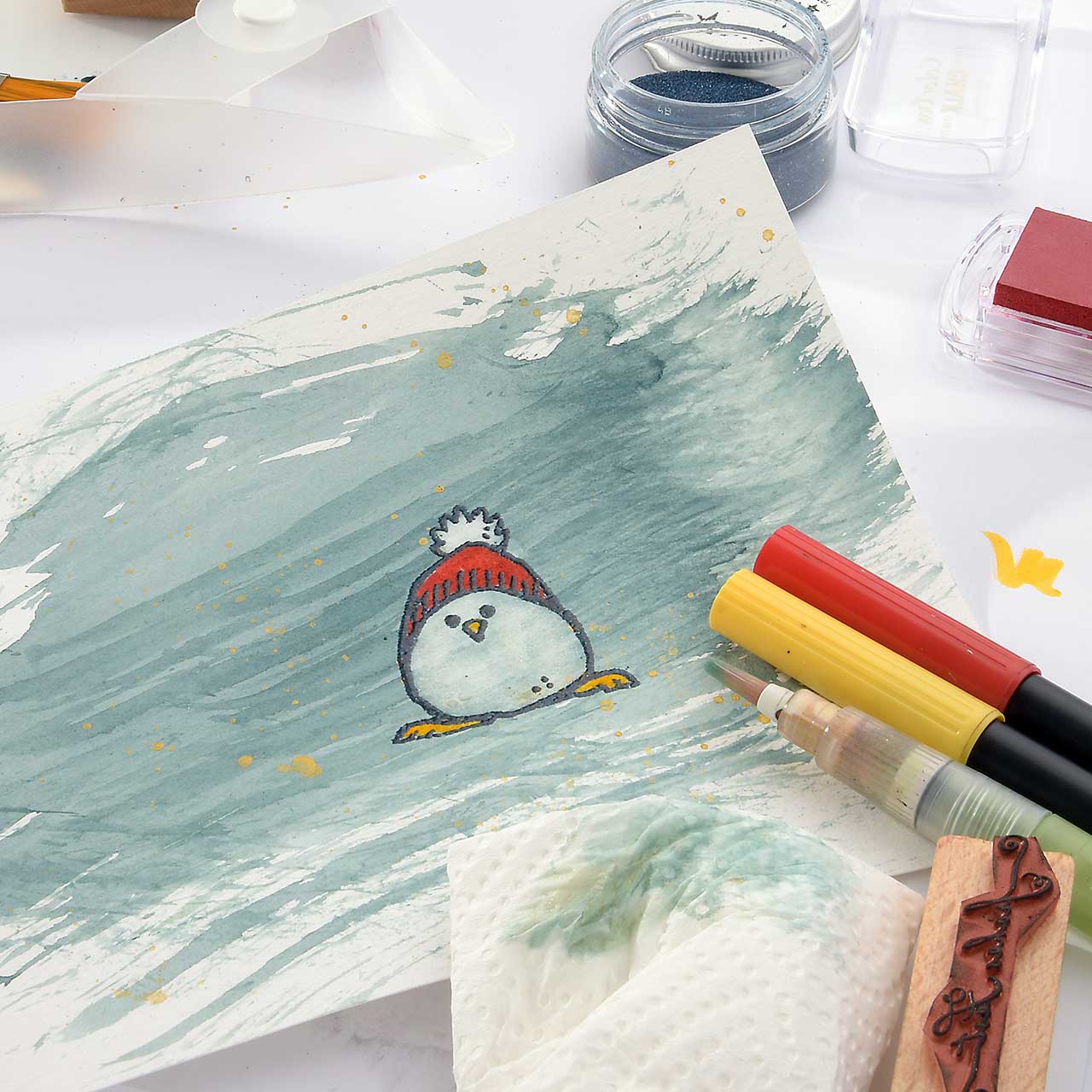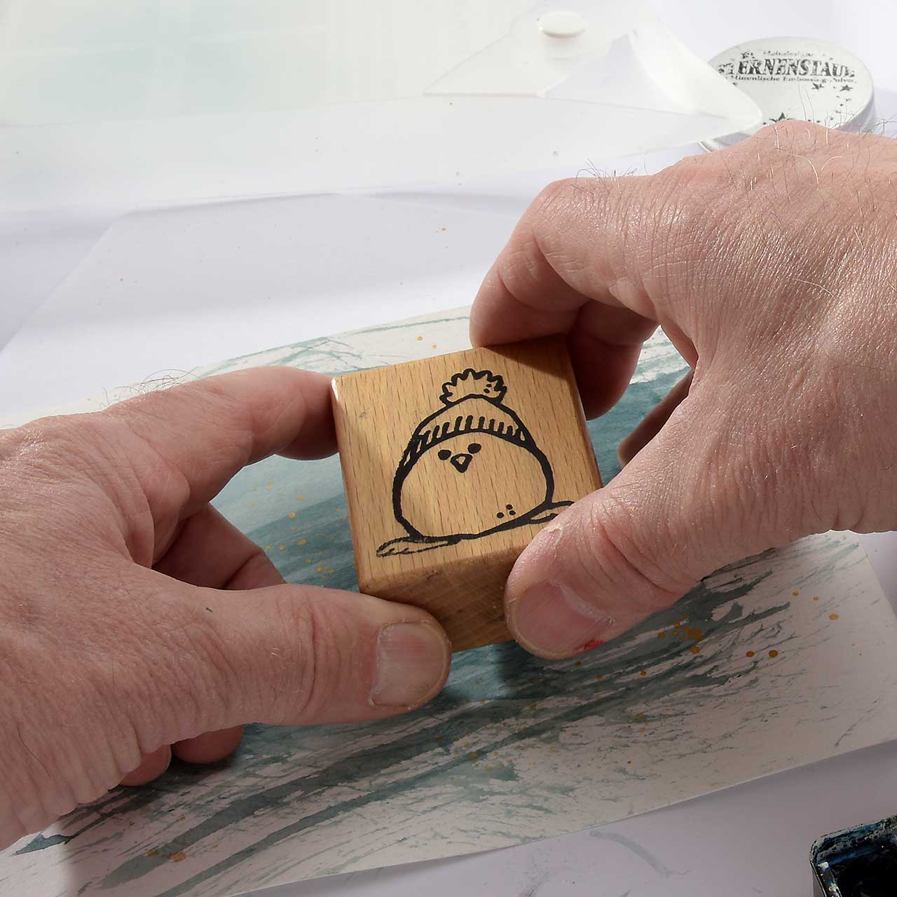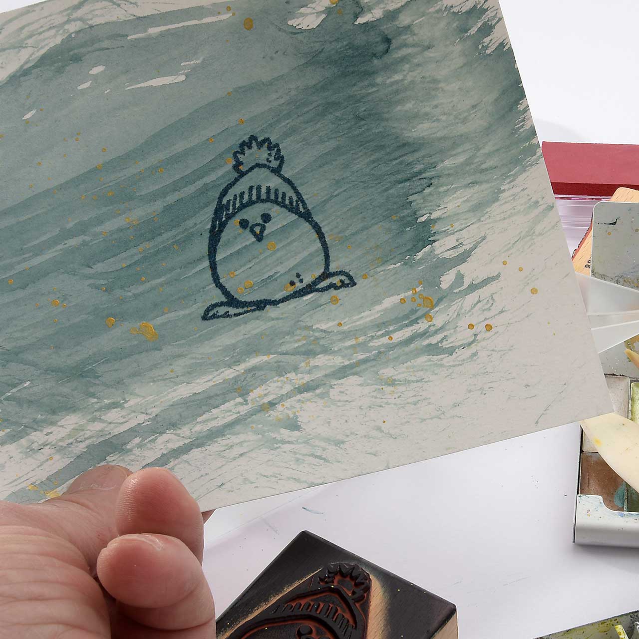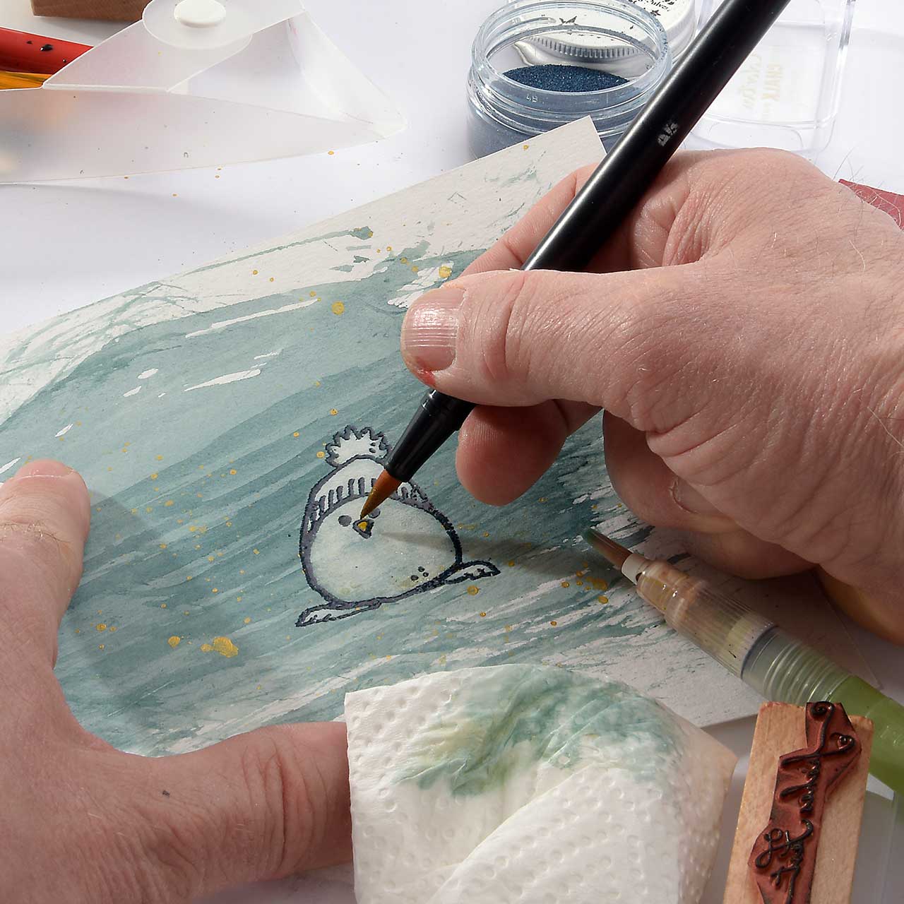 Damit das Winterküken Motiv weiß wird und sich schön vom Hintergrund abhebt, nehmen Sie mit einem nassen Pinsel Farbe aus den hellen Bereichern des Motivs ab.