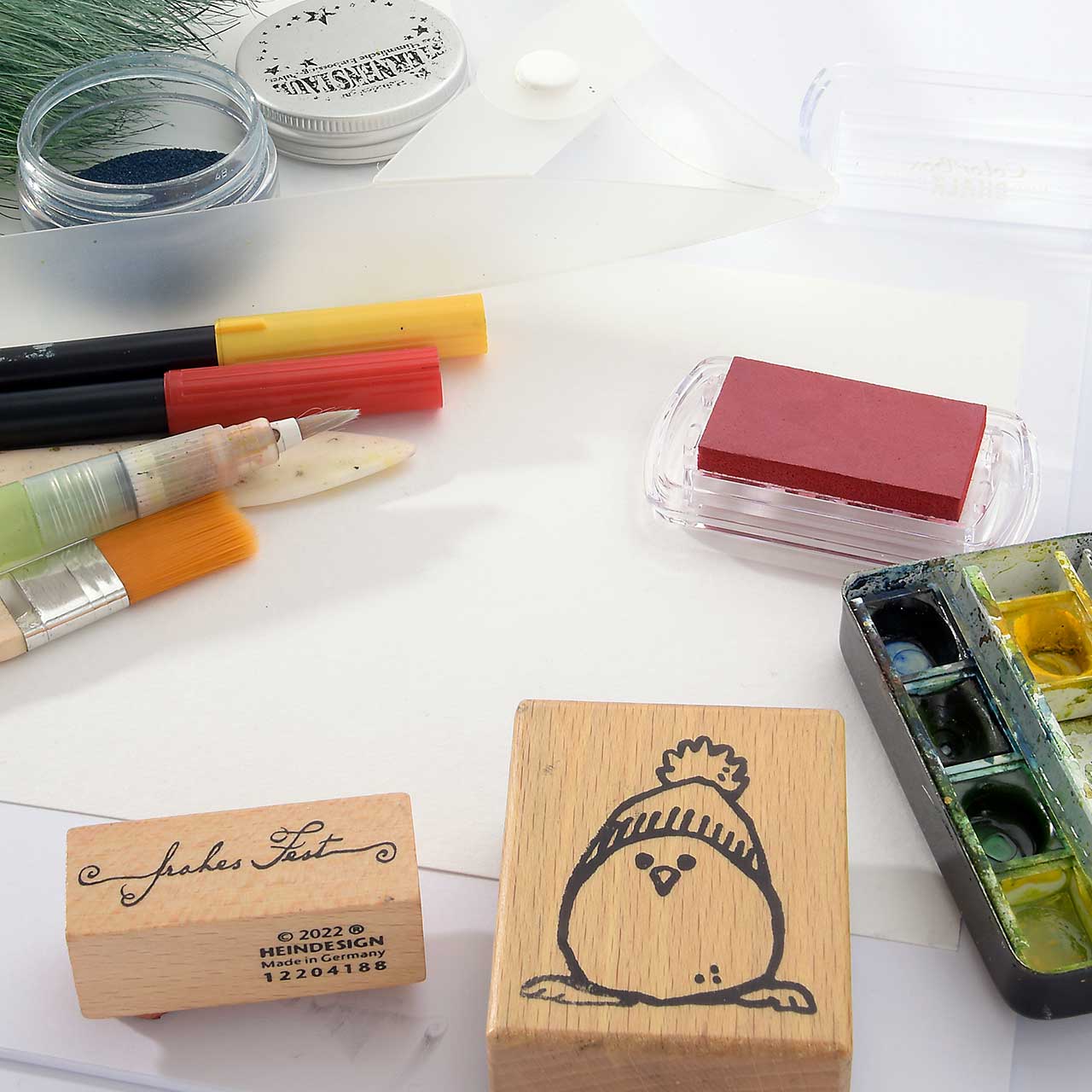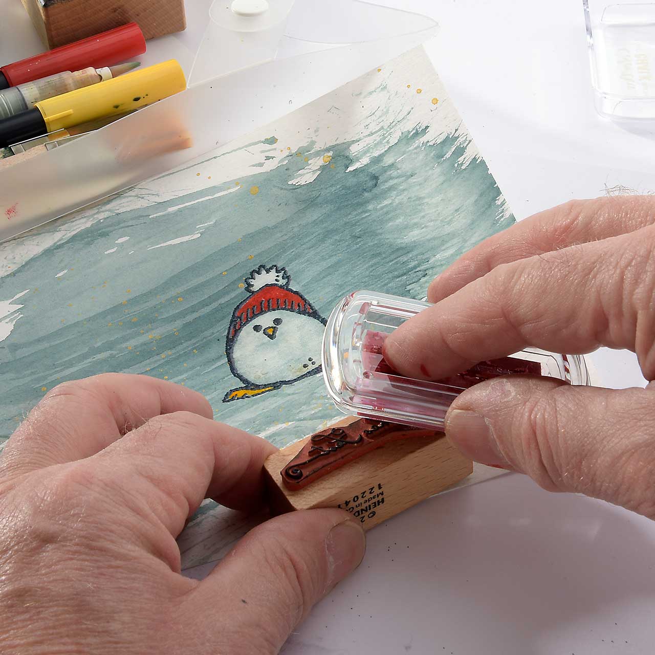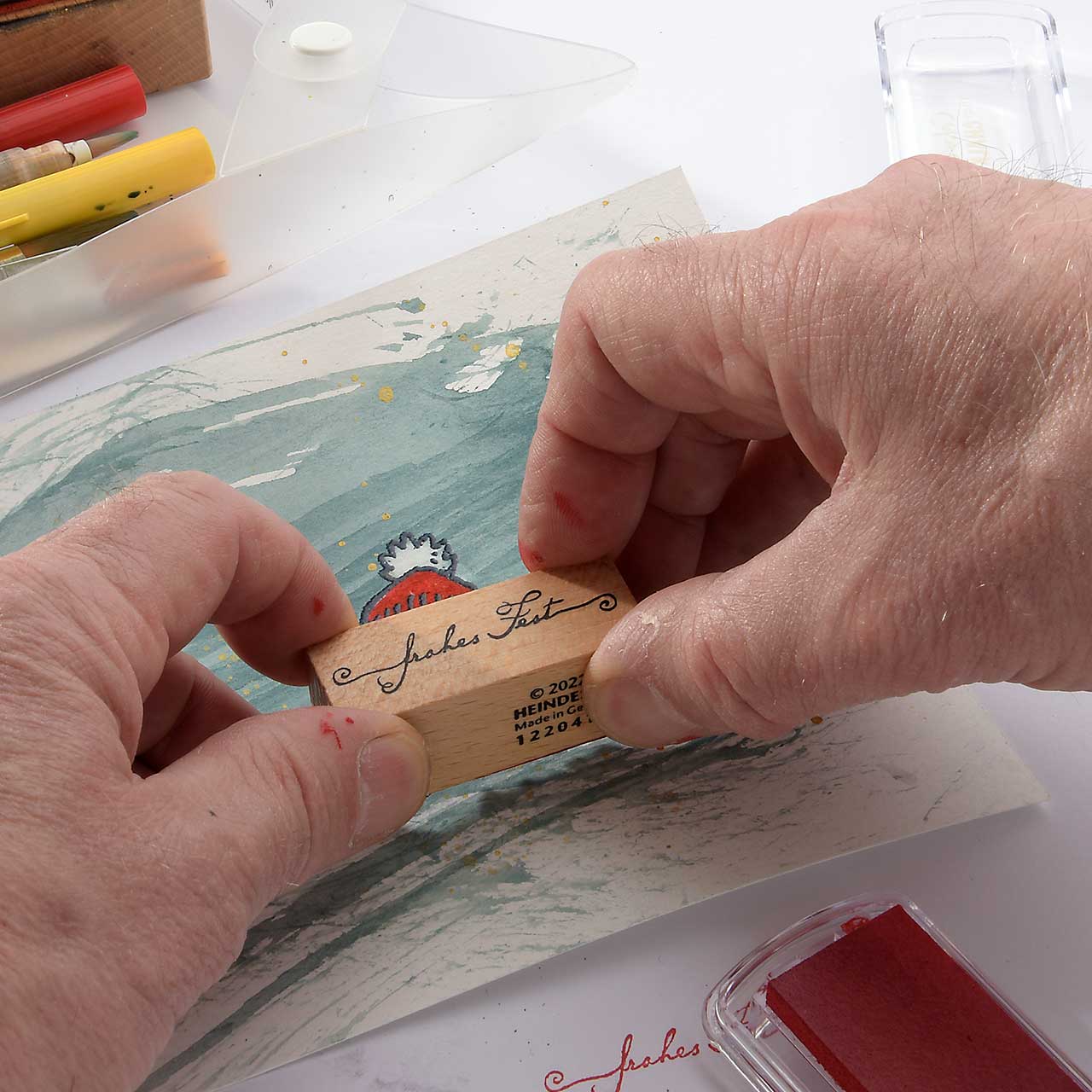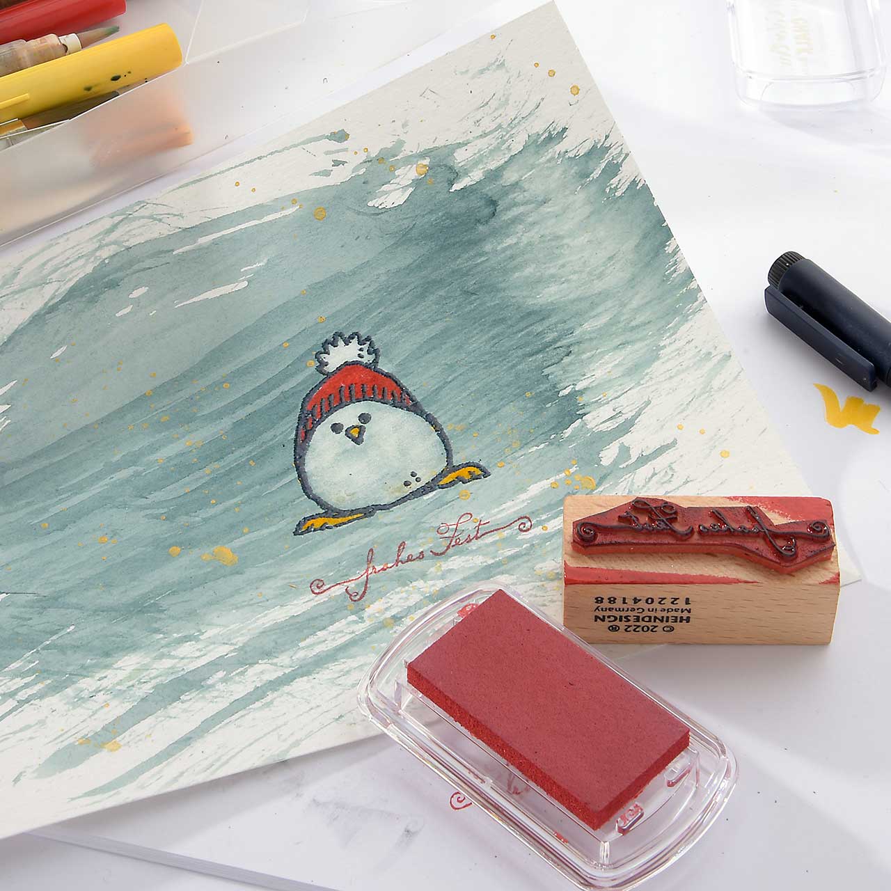 Stempeln Sie das „Frohes Fest“ Textmotiv mit dem roten Stempelkissen unter das Winterküken Motiv.